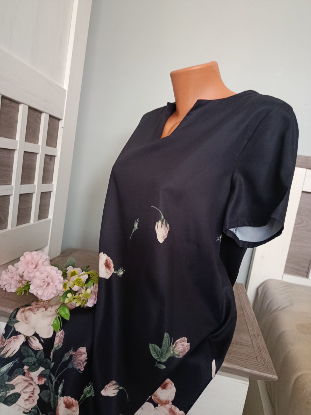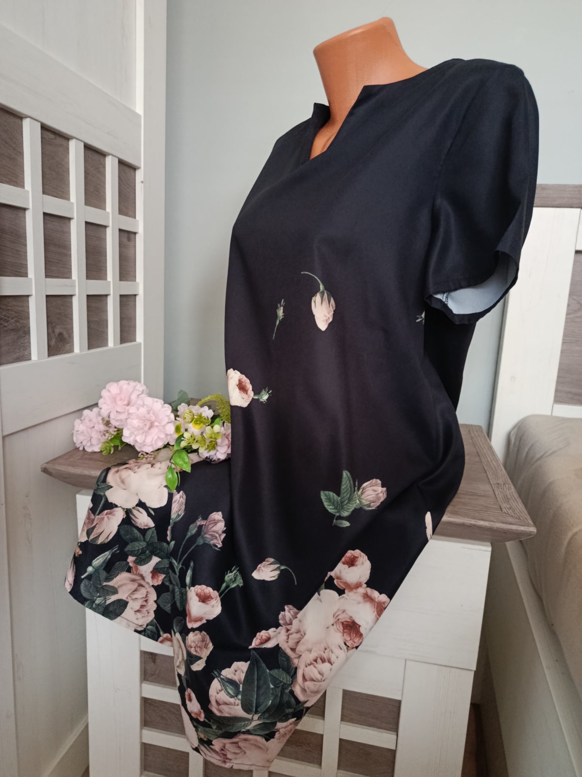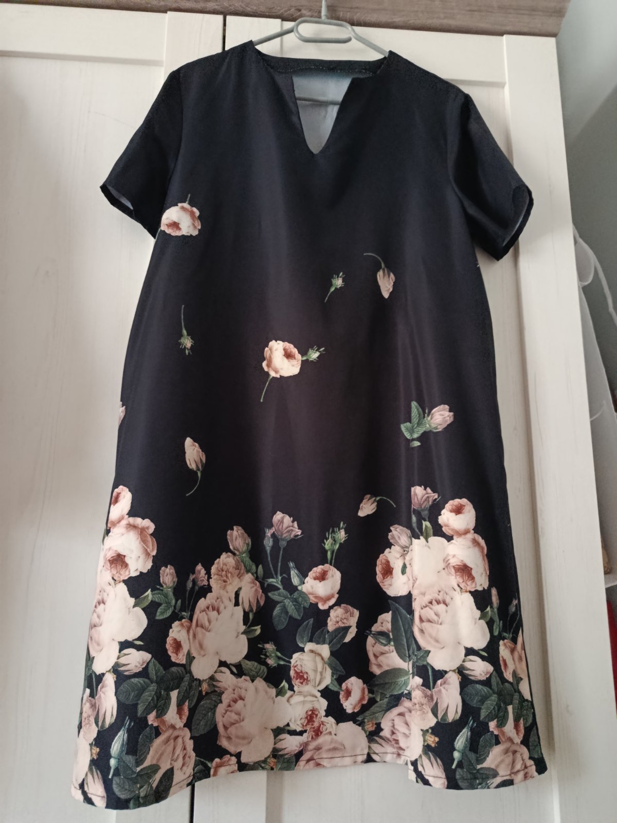 Krásné lehké letní šaty s potiskem světle růžových růží na spodní části šatů .....Véčkový výstřih, volnější styl. Šaty jsou v perfektním stavu. Míry : délka 93 cm, pas 2 x 54 cm, průramky 2 x 51 cm a délka rukávu od krku je 30 cm. Materiál : 100 % polyester. Poštovné - balíkovna za 85 Kč nebo zásilkovnou za 90 Kč.