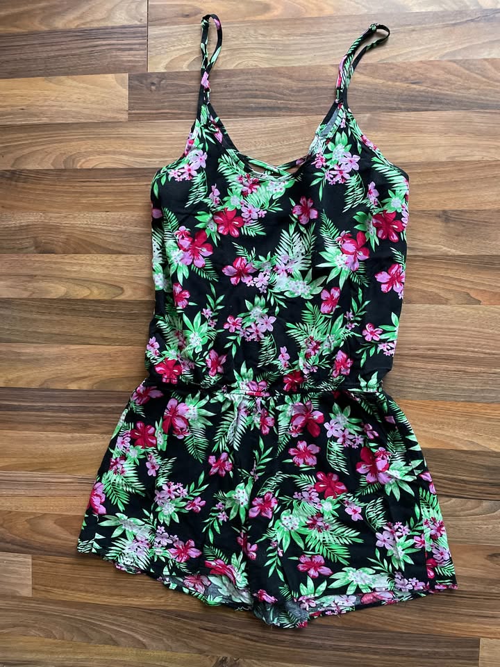 3018. nabízím k prodeji tento letní kraťáskový overal, vel M, v prsou spíše S/M, MSHLL GIRL. Materiál tenké pláténko, 100% viscoza. Nošen, bez vad - jen uskladněním pomačkán, krásný