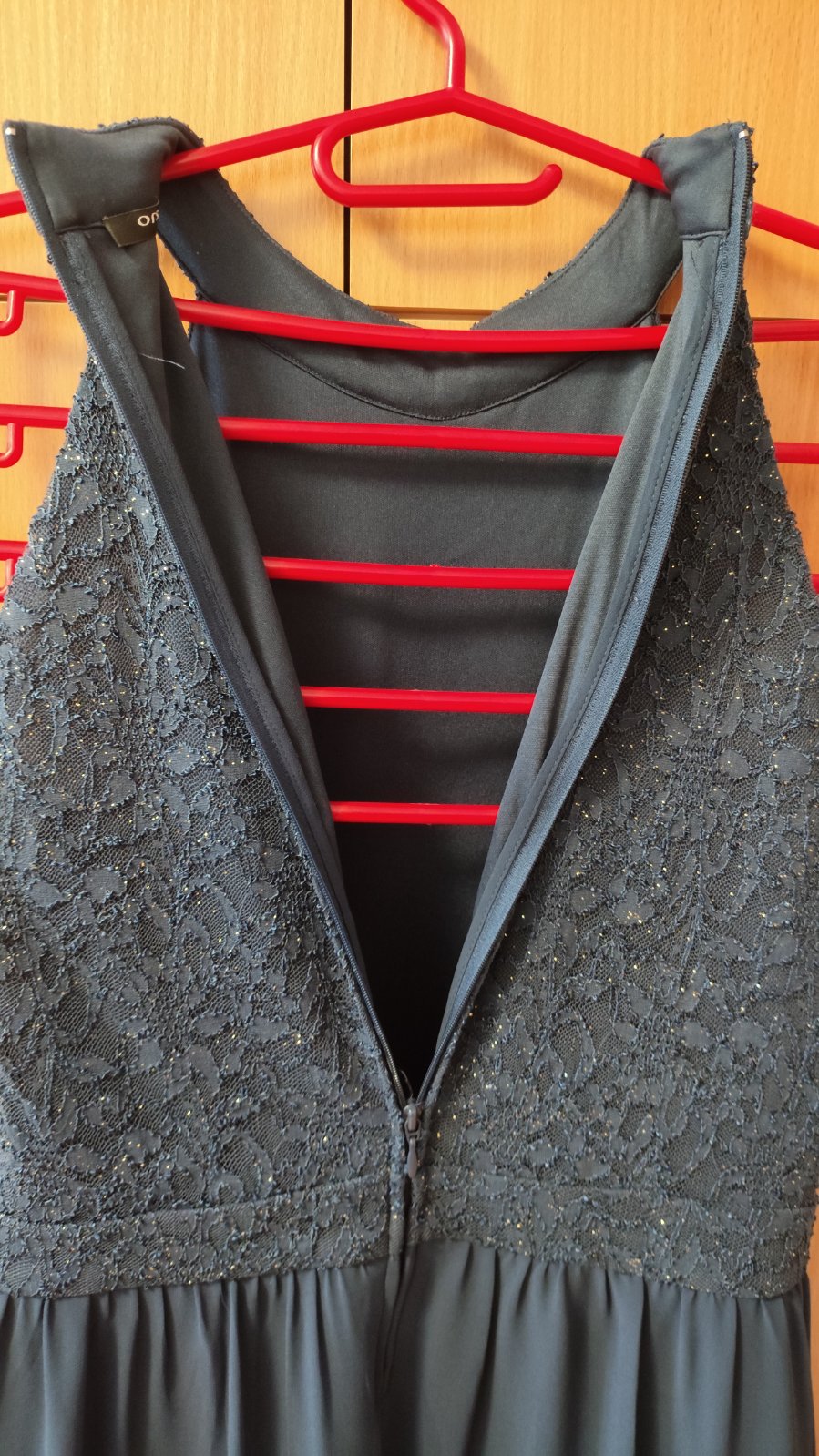 Elegantní večerní šaty s krásnou krajkou v horní části, vzadu s rafinovaně odhalenými zády a žabičkovanou vsadkou.,za krkem na knoflík, vypasovaný střih, lze prát v pračce. 100% polyester. Musím pr...