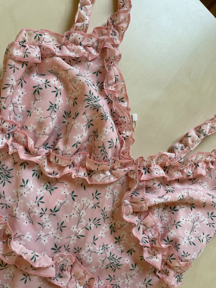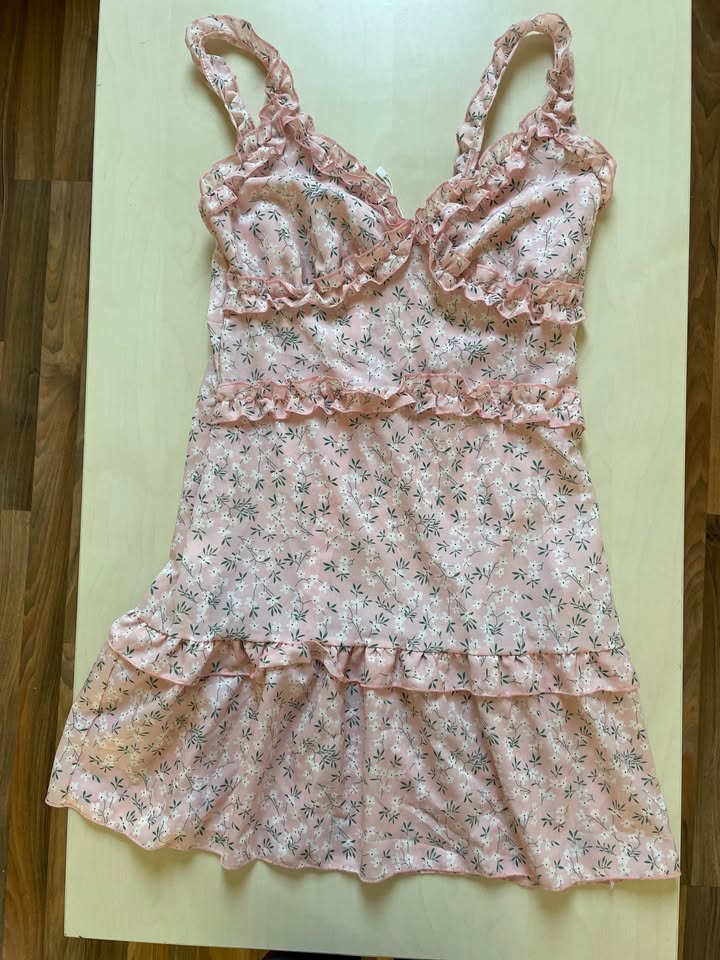 2030. nabízím k prodeji tyto nové růžové šaty s kvítky a volánky, vel L ale spíše v prsou i méně, prosím měřte, CBR. Tenký takový silonový materiál - 65% bavlna, 35% polyester. Na zádech zip. Nové ještě zbytek šňůrky od visačky, bez vad, krásné