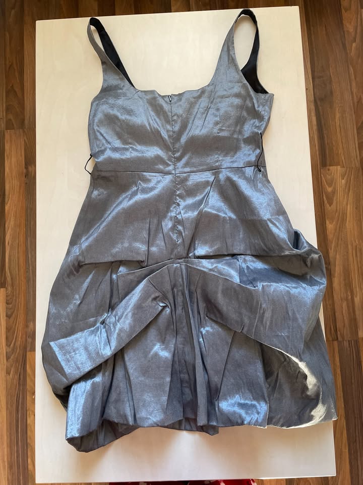 3407. nabízím k prodeji tyto stříbrné šaty s kovovým leskem, vel 40 tedy L, Yessica. Sukně sešívaná do asymetrických skladů, dole sešitá do podkasu se spodničkou. Materiál 41% polyester,32% bavlna,24% polyamide, 3% elasten. Podšívka 96% polyester, 4% elasten. Zapínání na zadech. Pod košíčky široká poutka na pásek, není součástí. Nošená, bez vad, krásné