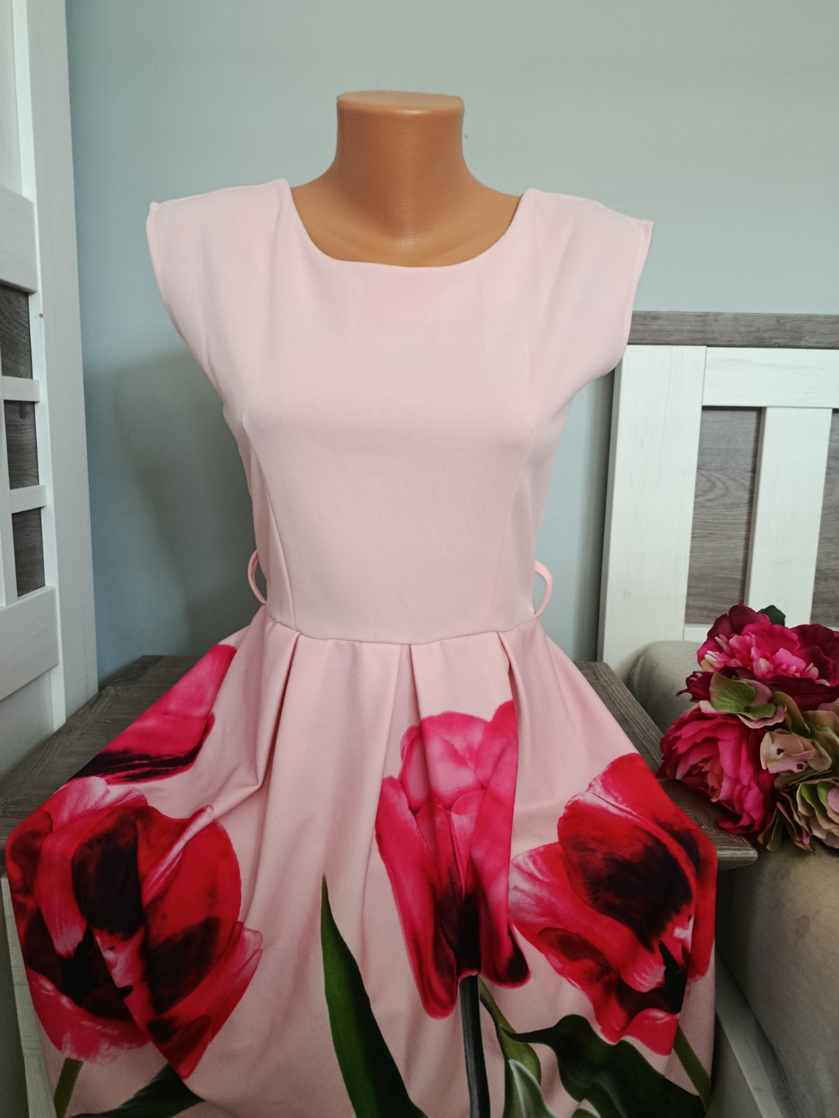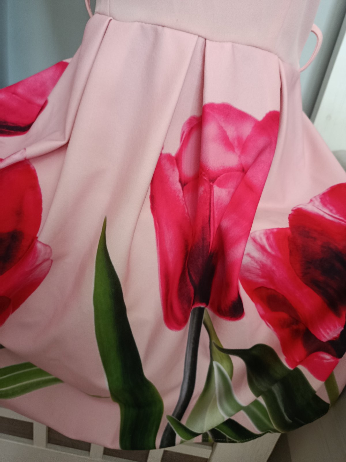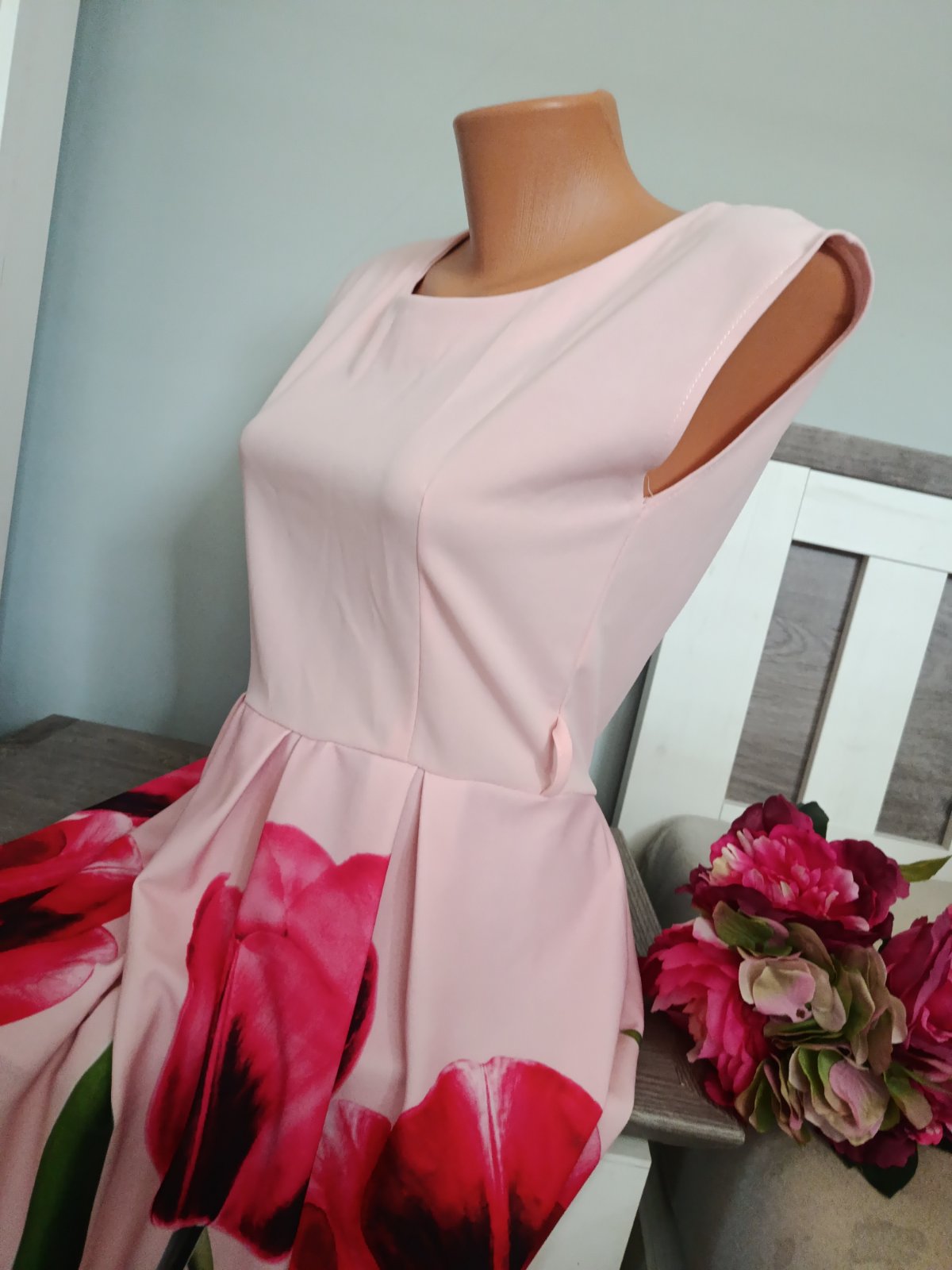 Krásné šaty s květinovou sukni. Obří květy na růžovém podkladě. Vzadu jsou na zip. V pase jsou našitá poutka pro pásek, ale ten nebyl součástí prodeje ...Šaty jsou v perfektním stavu, bez vad. Velikost není uvedena, ale odpovídají S. Míry : délka 90 cm, pas 2 x 34 cm - 2 x 40 cm, průramky 2 x 43 cm - 2 x 50 cm. Materiál : polyester a elastan. Poštovné - balíkovna za 85 Kč nebo zásilkovnou za 90 Kč.