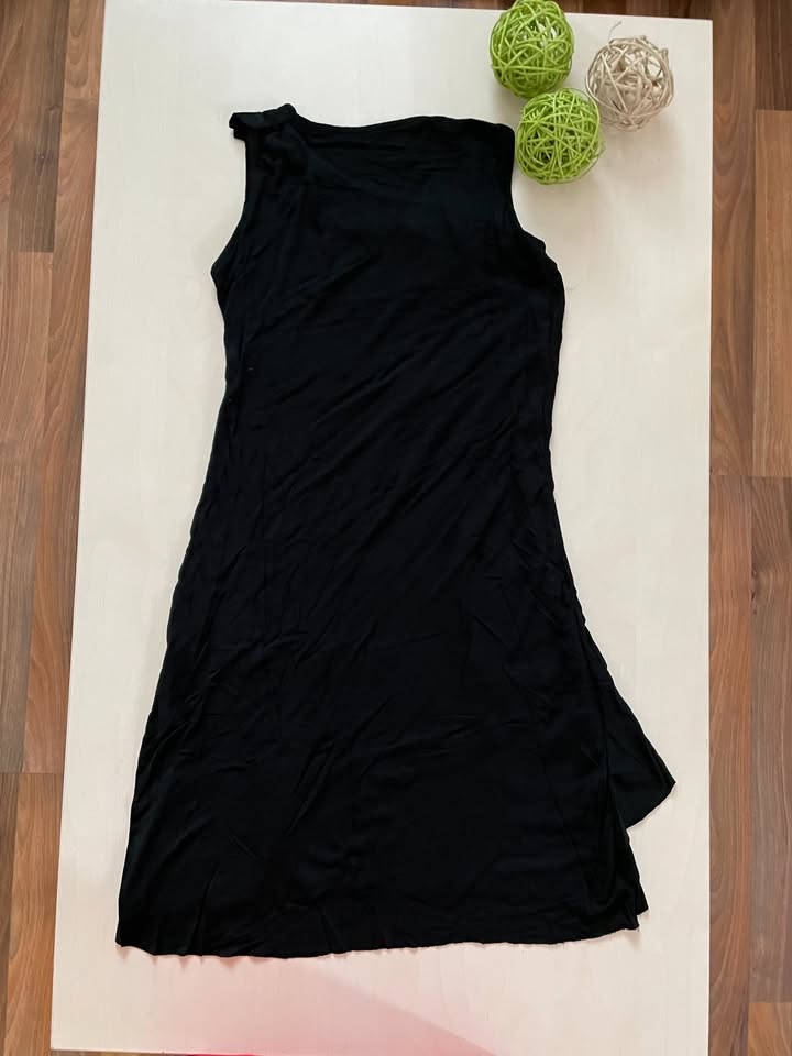 1028. Nabízím k prodeji tyto černé pružné šaty s bočním volánem, vel není uvedena ale měly by sednout XS-M, jsou pružné. Jednoduché černé, elastické. Do boku na jedné straně našit volán, který spadá dolů. Materiál podobný jako viscozová trika, složení neuvedeno. Dolní lem záměrně nezačištěn, zadní strana maličko delší. Nošené málo, bez vad, krásné