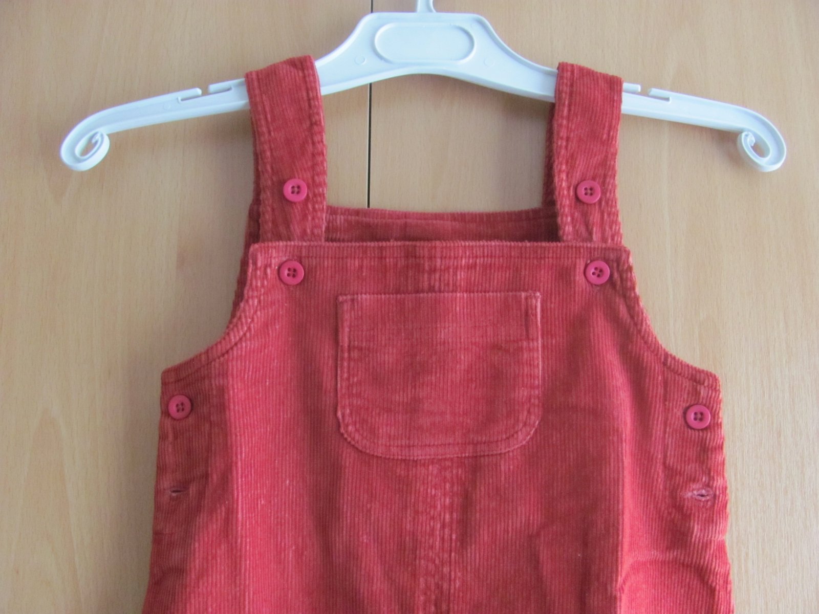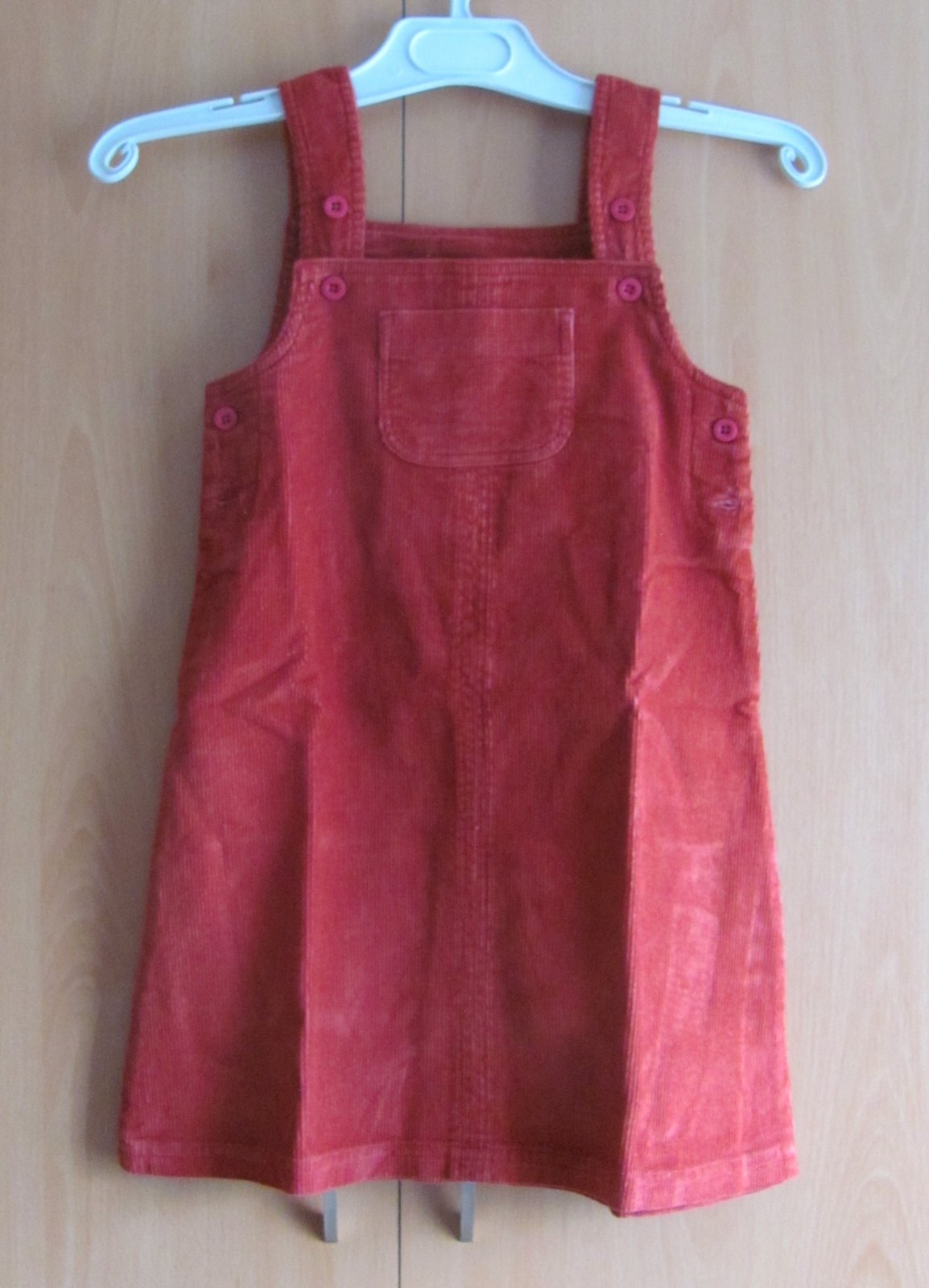Červené manšestrové šaty Items, velikost 116, prsa 35 cm, délka variabilní (2 knoflíky, lze přešít, posunout) max. 66 cm, zadní díl bez ramínek 58 cm.