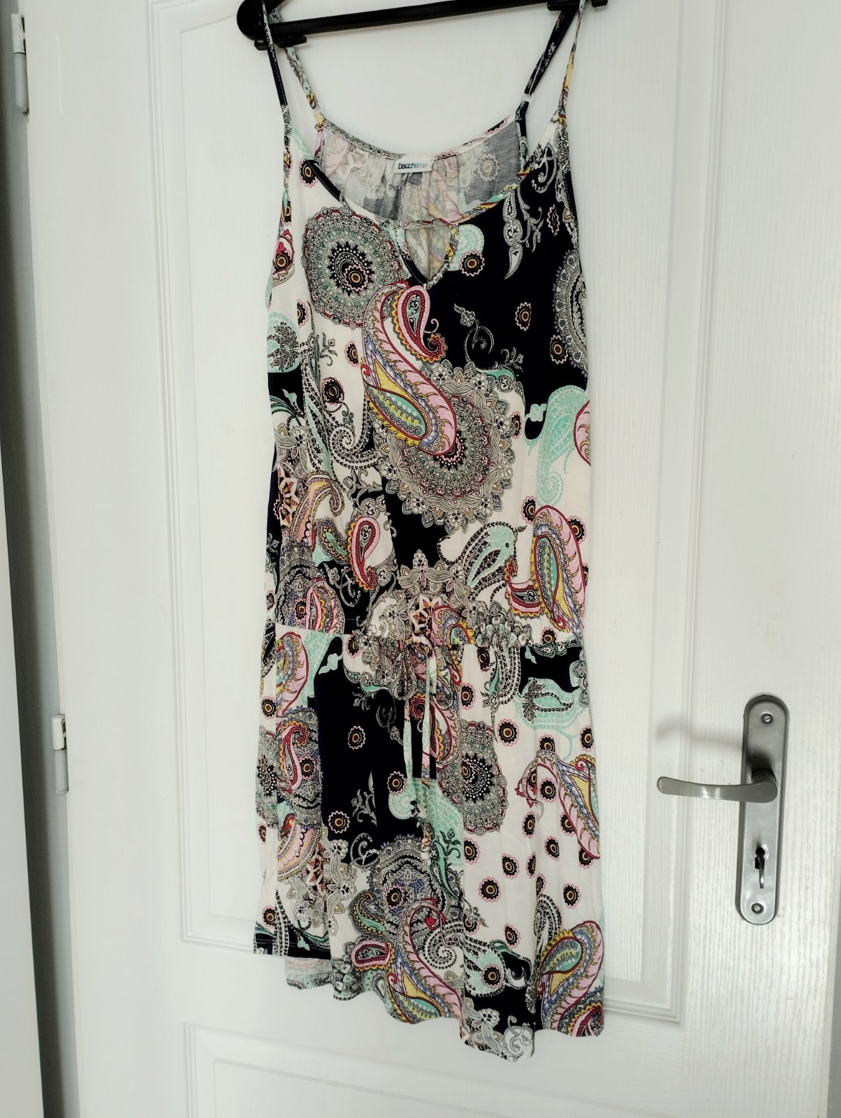 Prodám nošené, ale pořád pěkné šaty.Míry: celková délka od průramku dolů 76cm, v pase na gumu ( v klidu) 2x 37cm ještě se roztáhne.