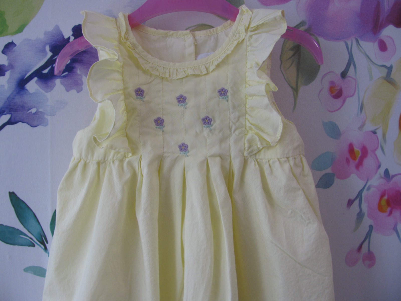 Krásné plátěné světle žluté šatičky, zdobené volánky, vyšitými kytičkami, vzadu zap. na knoflíky, zdobná mašle, všitá spodnička. 100% bavlna. Top stav bez vady.