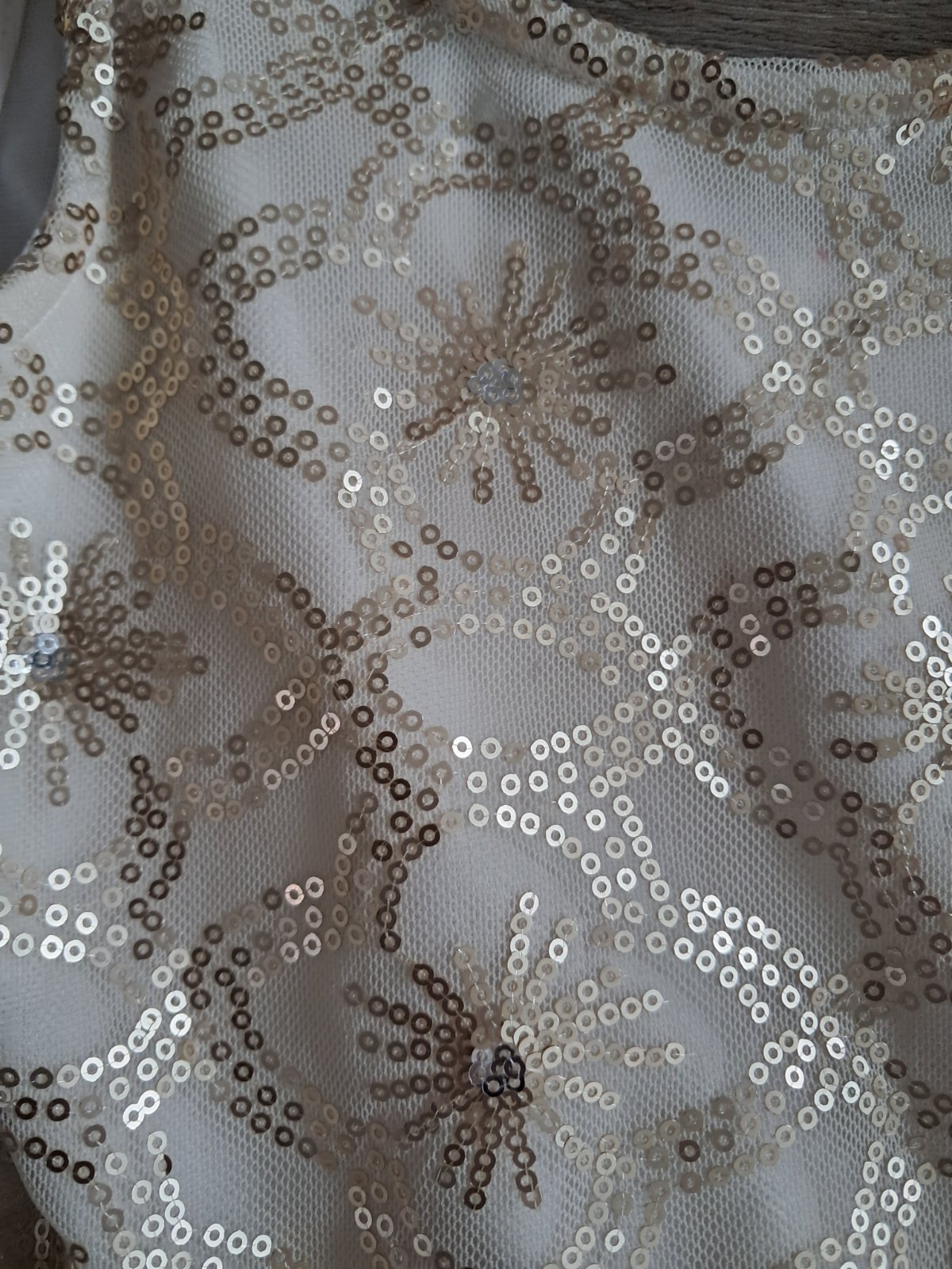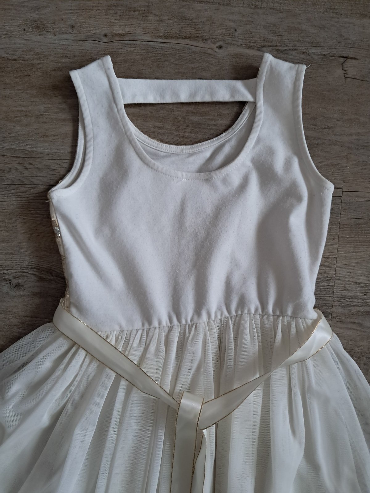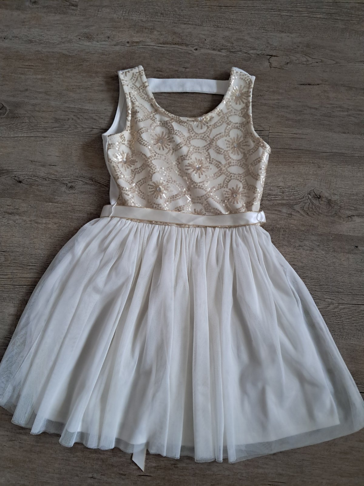 krásné a pohodlné smetanové šaty k slavnostnějším příležitostem, trošičku žmolík na zádech, jinak bez vad, vazačka dozadu umožňuje větší variabilitu pro všechny holčičky, velikost 8 let