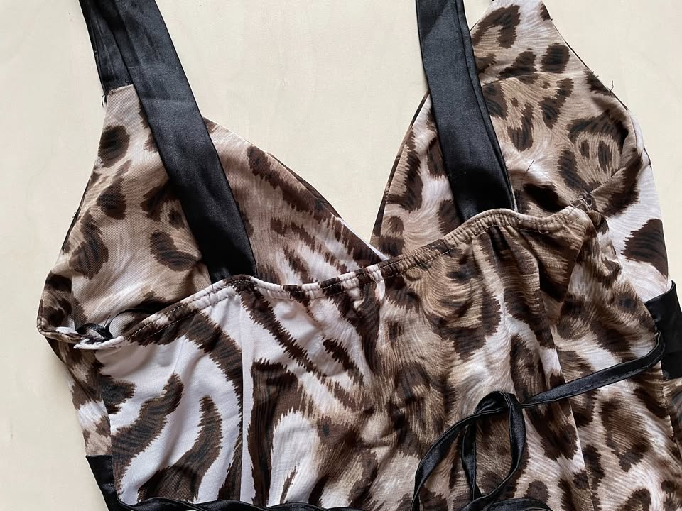 3517. nabízím k prodeji tyto letní šaty s motivem zvířecí srsti, vel není uvedena cca S-M, mají být volně, měřte. Materiál umělý, pružný, asi polyester s elastenem. Košíčky vycpávky. Nošené, bez vad jen jedno ramínko povolené šití (zatím drží, ale bylo by lepší stáhnout), krásné