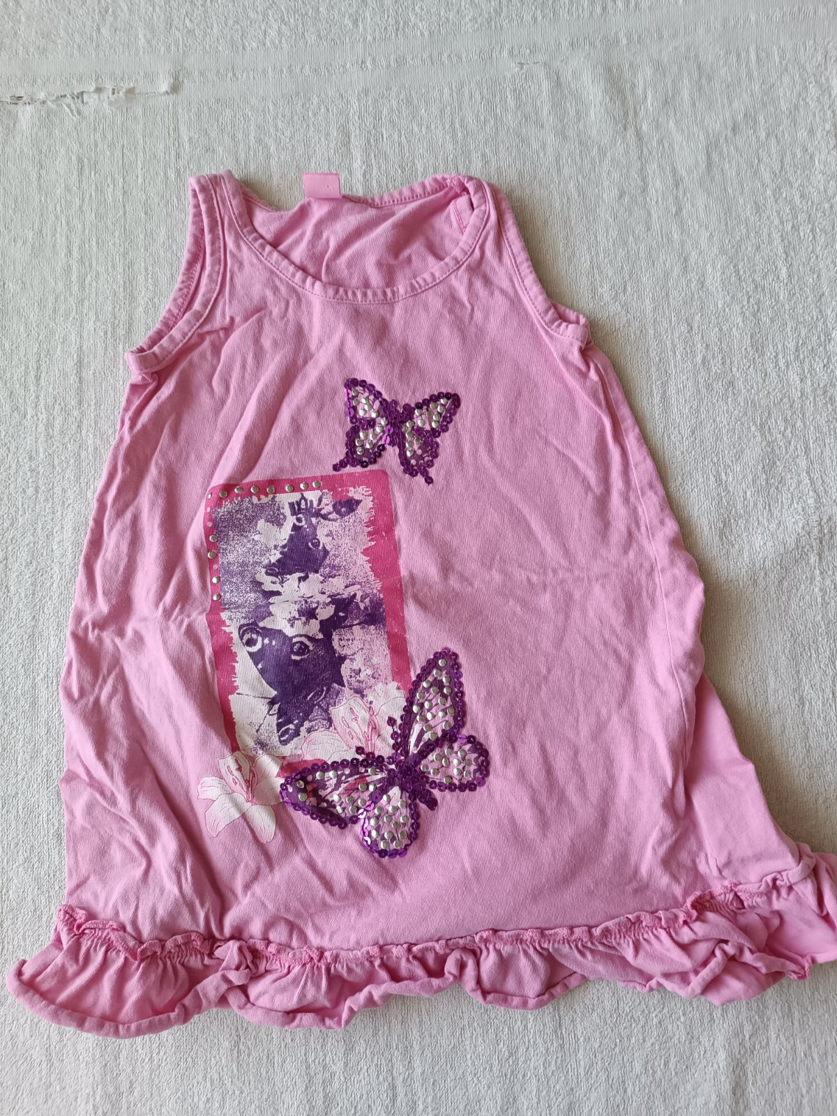 Dívčí letní šatičky zn. Dopodo, vel. 104. Zapínání na patentky. Celková délka 55 cm, šířka pod rukávy 29 cm. Moc slušivé ;-)
