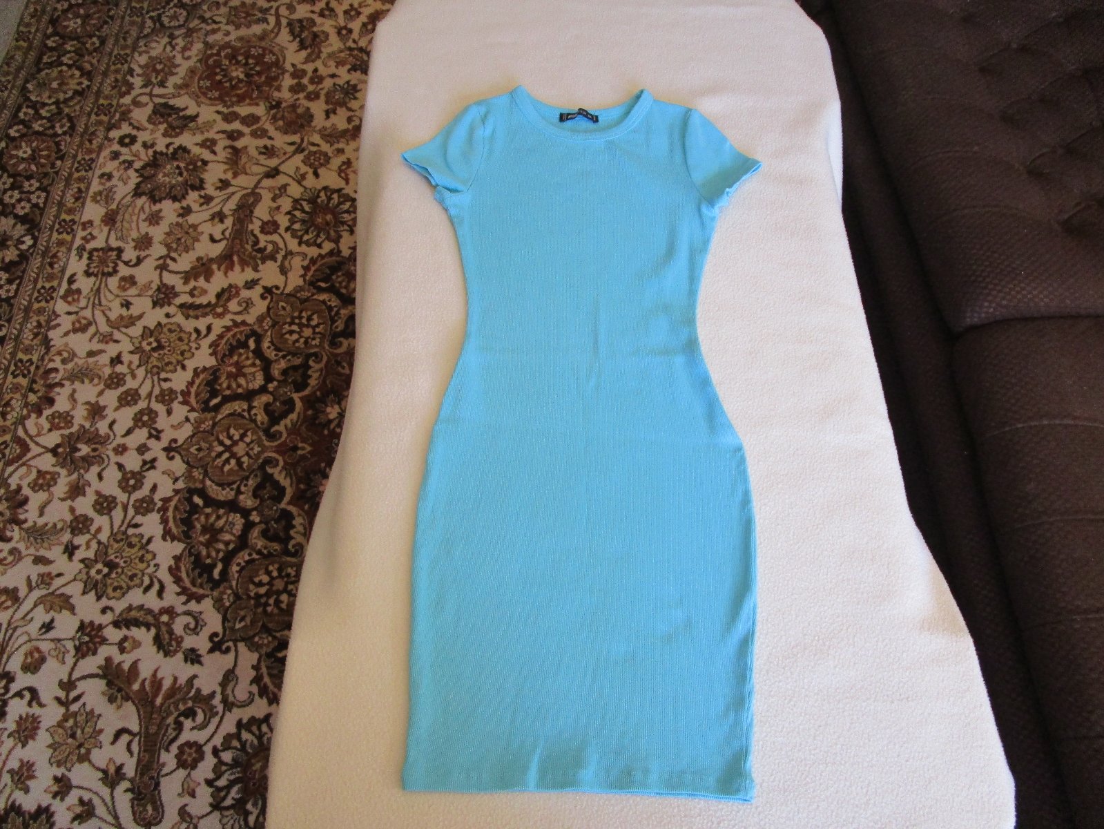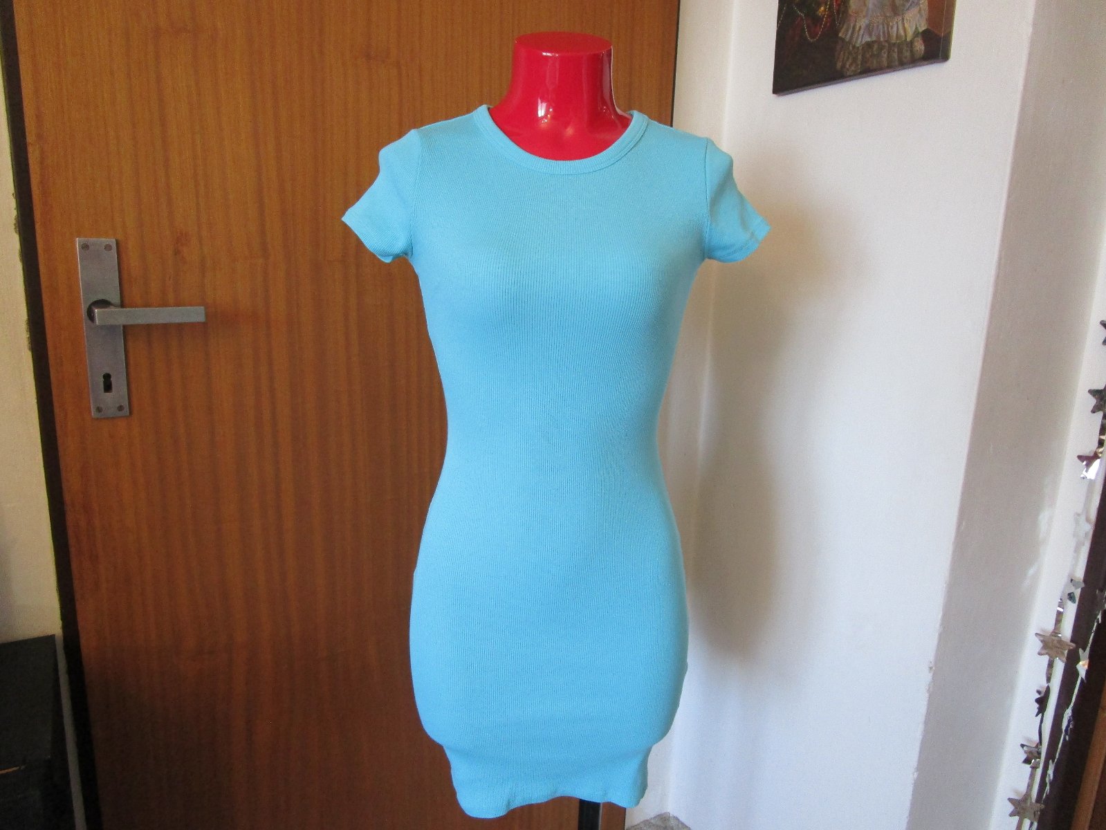 Pěkné sv. modré bavl. elast. šaty, proužkový vzor, kr. rukáv, vel. XS, délka odshora dolů 80 cm, slušivý střih, cena jen 89 Kč, zn. Fb Sister.