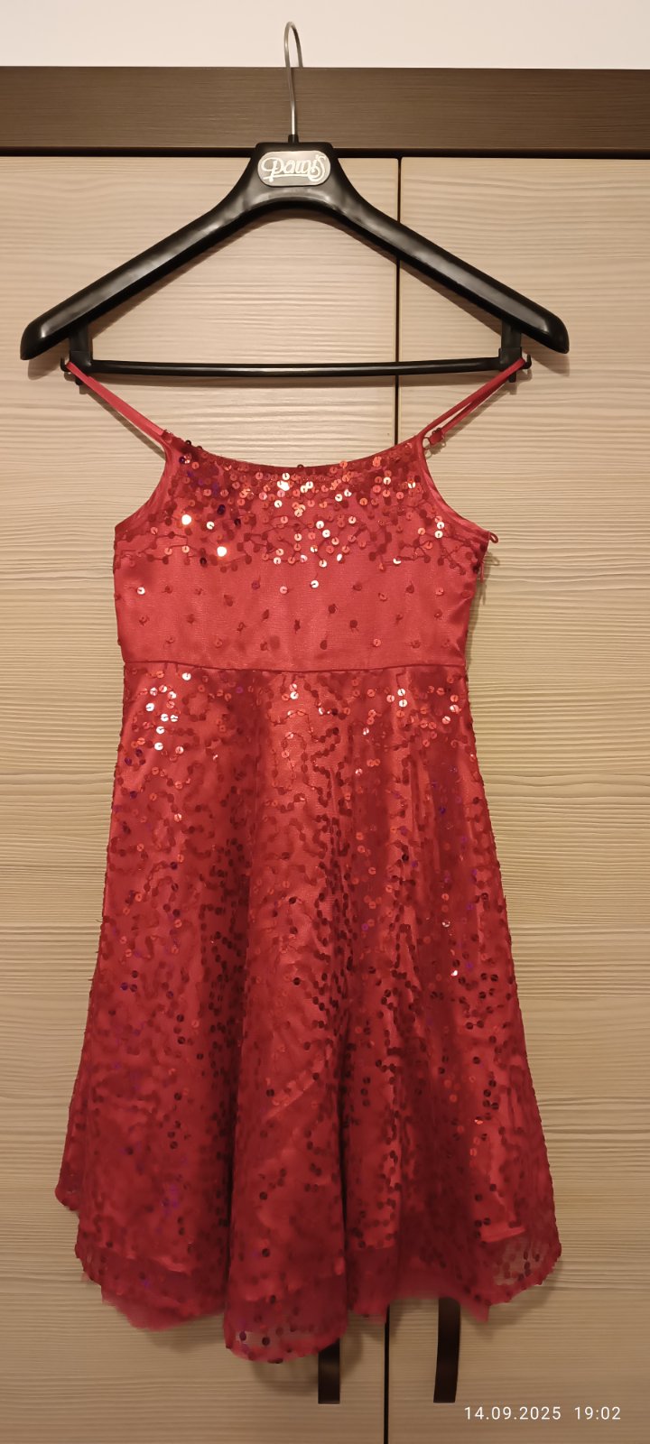 Dívčí šaty, jsou sytě růžové pošité flitry s tylovou spodničkou.