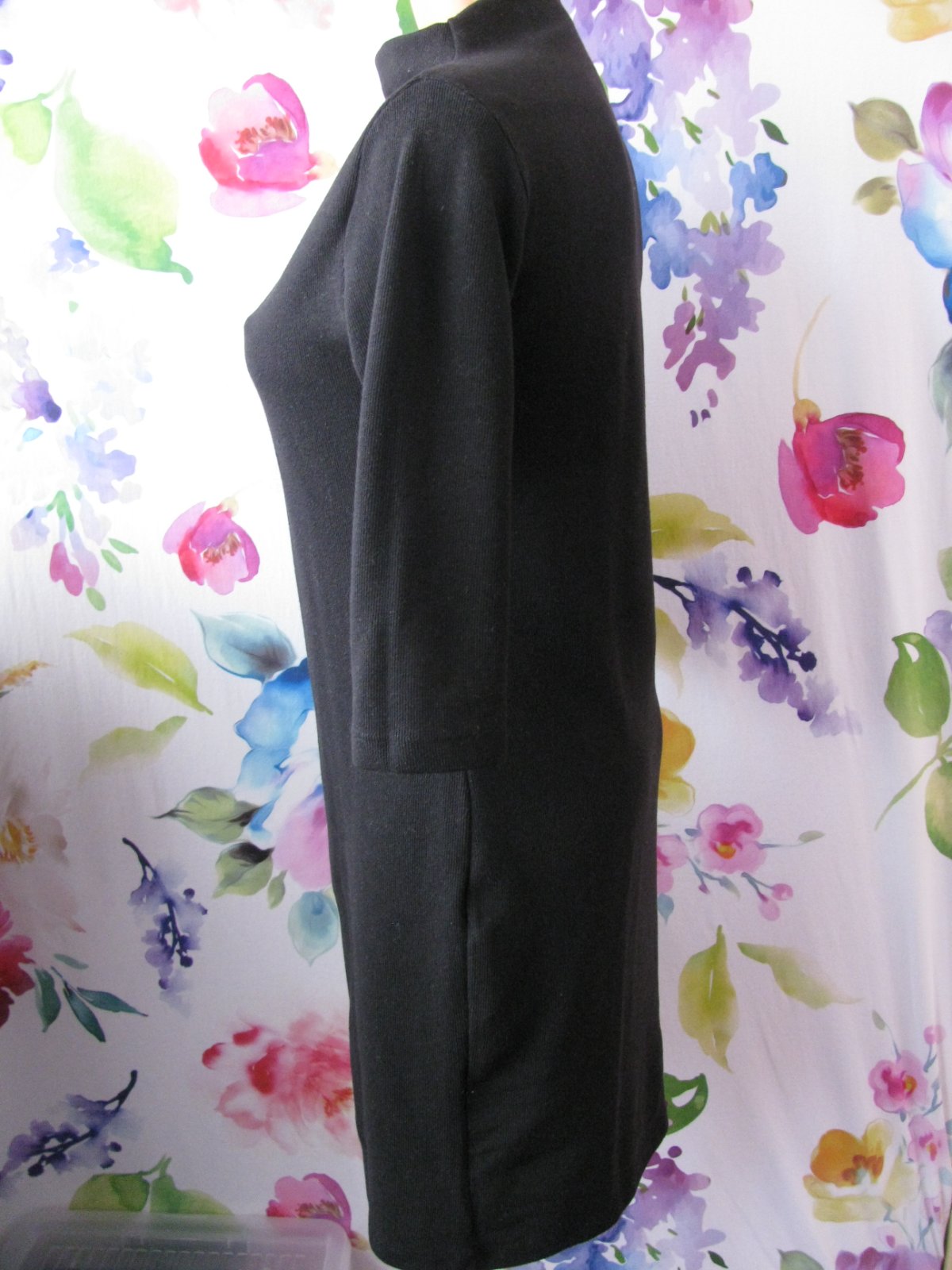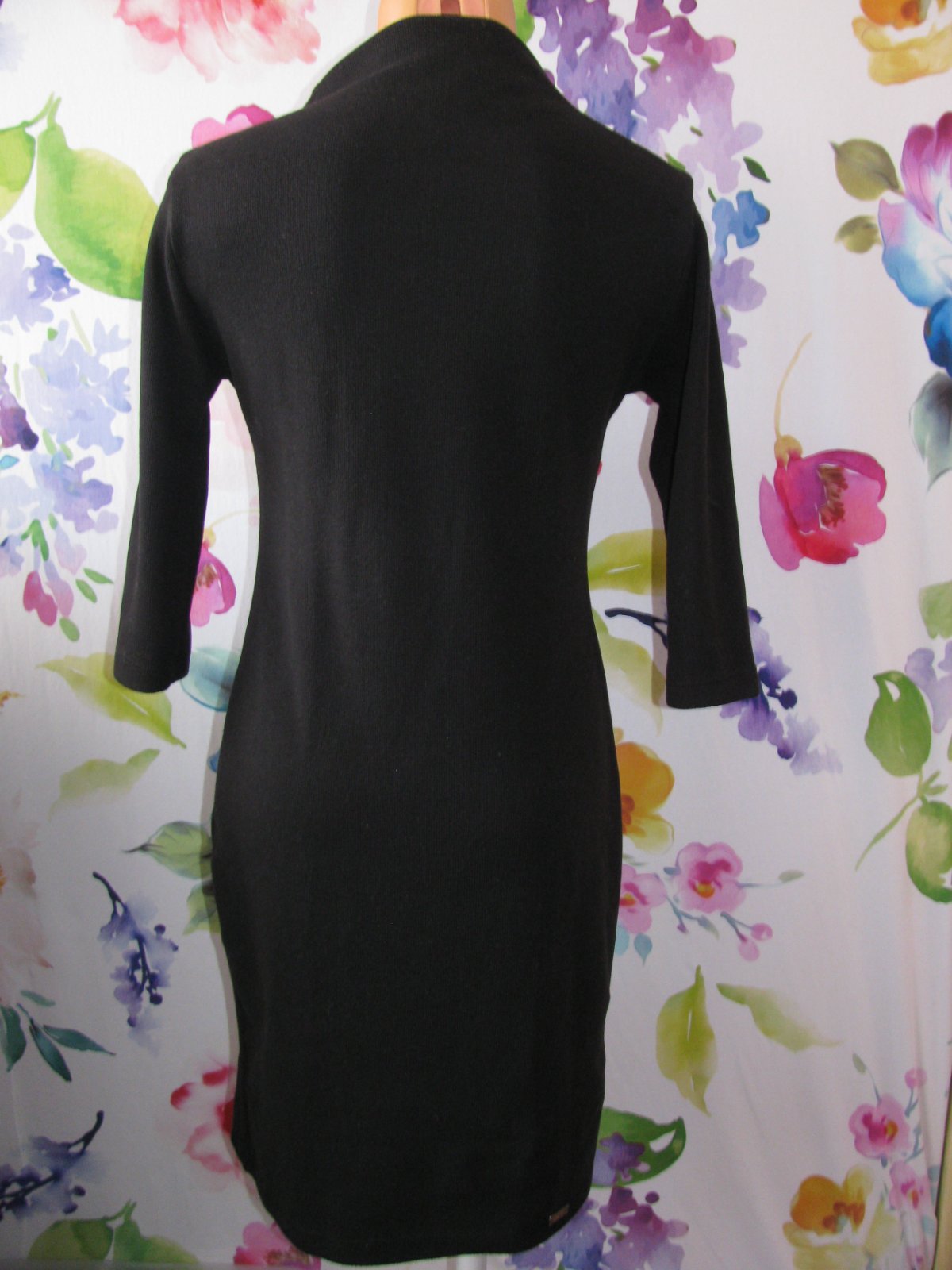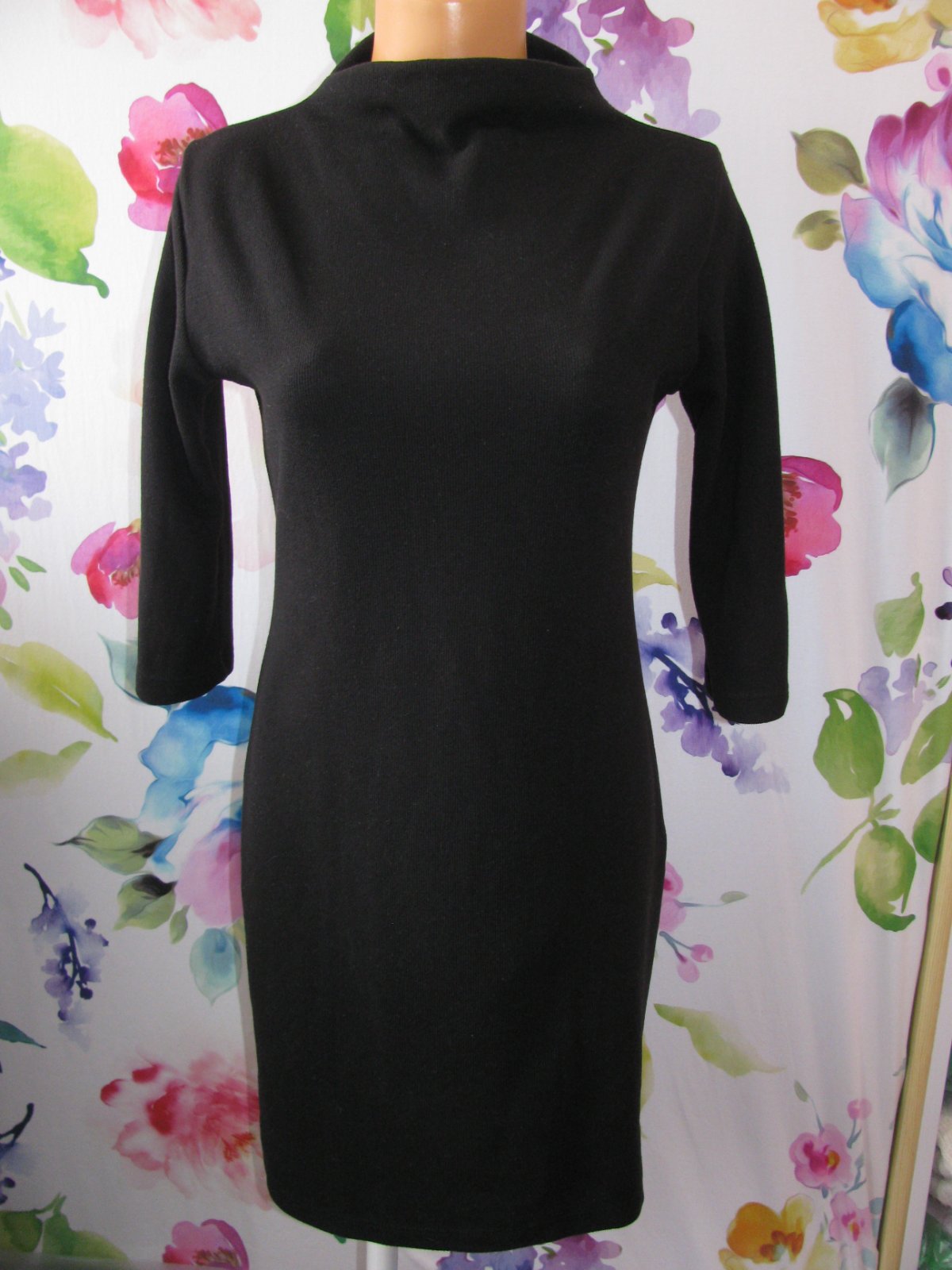 Perfektní pružné pouzdrové šaty s 3/4 rukávem, krátkým rolákem, 65% polyester, 20% viskoza, 6% lycra. Na rubu šatů něco žmolík, jinak bez vady, hezký stav,