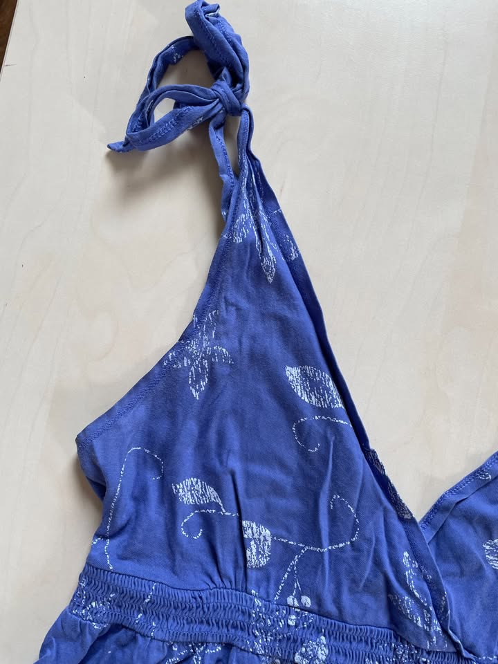 2958. nabízím k prodeji tyto modré letní šaty s ramínky na uvázání, vel 14 tedy XL, papaya. Jsou krátké. Barva tlumená modrá, matnější než na fotu. Bílý vzorek do ztracena. Složení neuvedeno, podobné jako bavlněná trika. Nošené, bez vad, krásné