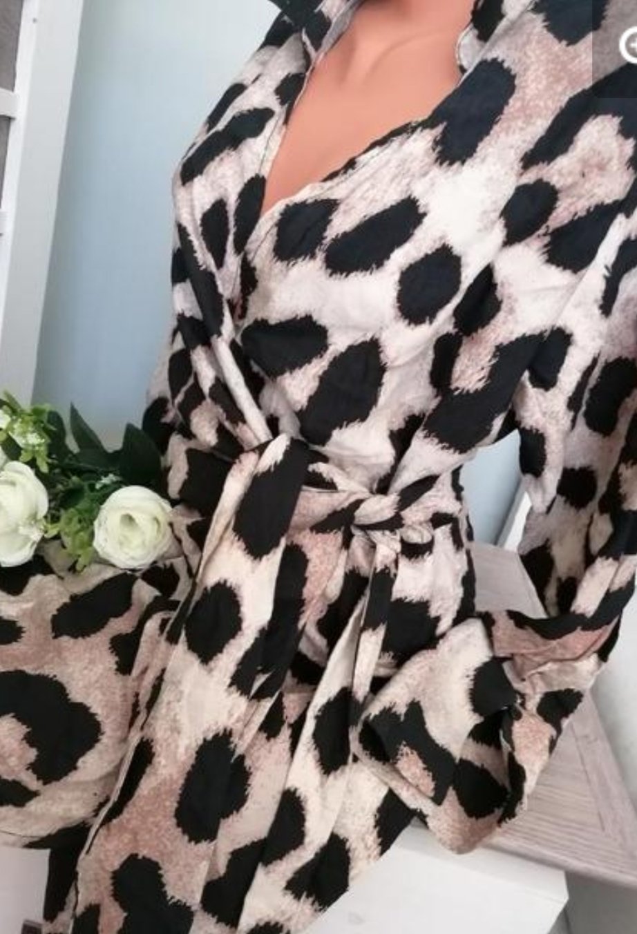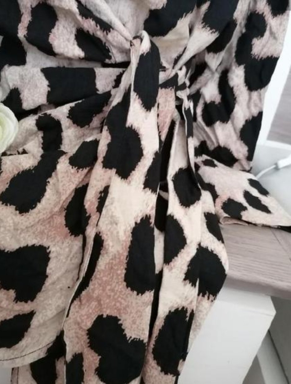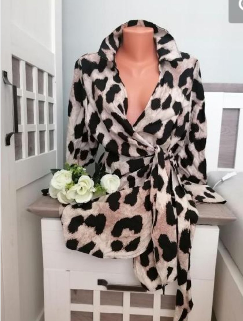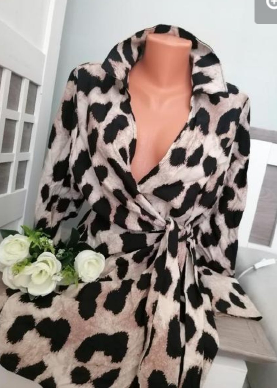 Pěkné tygrované zavinovací sexy mini šaty....Rukávy mají široké manžety, zapínání na knoflíček...Šaty jsou v perfektním stavu...Míry : délka 86 cm, pas 2 x 42 cm - bez úvazu, dají se pochopitelně zúžit dle úvazu, průramky 2 x 44 cm a délka rukávů od krku je 73 cm. Materiál: 88 % viskoza a 12 % polyamid. Poštovné - balíkovna 85 Kč nebo zásilkovna za 90 Kč.