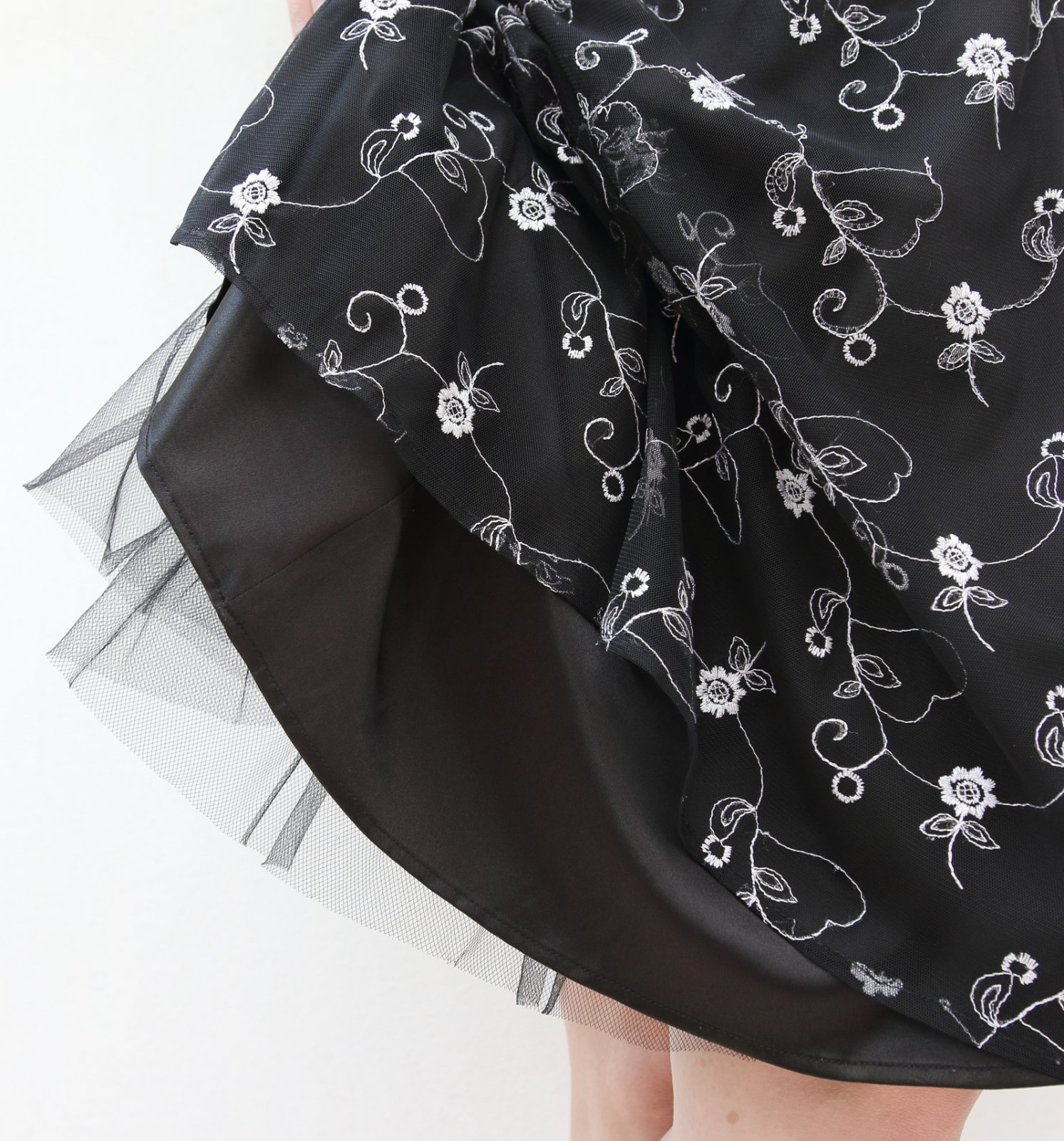 Krásné pin-up šatičky v délce nad kolena. Jsou dvouvrstvé, spodní je lesklý elastický úplet se dvěma tylovými volány pro bohatost sukně, svrchní materiál černý tyl s bílou výšivkou kytiček. Černá podprsenková část je pošitá černými kamínky, přes ni se váže průhledný tyl na mašli za krkem. Zip mají v levém boku. Horní část šatů není vyztužená, ale hezky sedí, i díky přichycení k tylové vrstvě která drží díky zavázání za krkem.