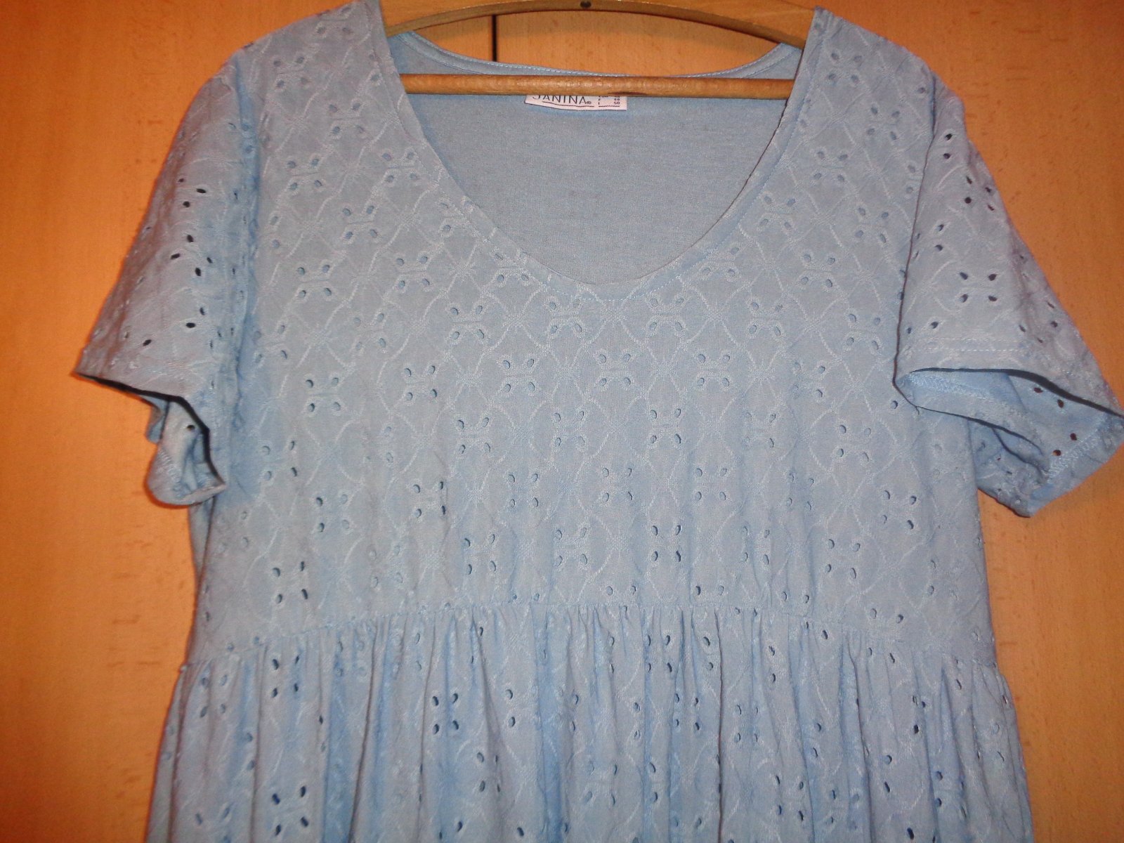 KRÁSNÁ ŠEDOMODRÁ BARVIČKA - VZOR MADEIRA. VRCHNÍ MATERIÁL 95% BAV LNA A 5% ELASTEN - PRUŽÍ A PŘIZPŮSOBÍ SE. CELÉ KROMĚ RUKÁVŮ PODŠITÉ 100% PES. VOLÁNOVÝ VOLNÝ STŘIH. DOPORUČUJI - MOC SLUŠIVÉ.