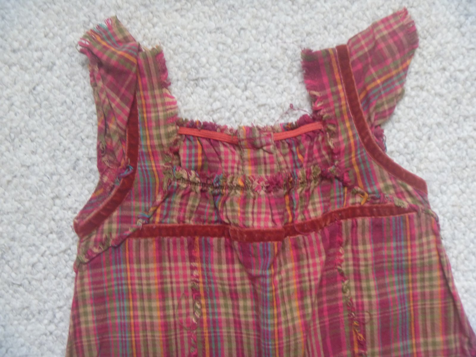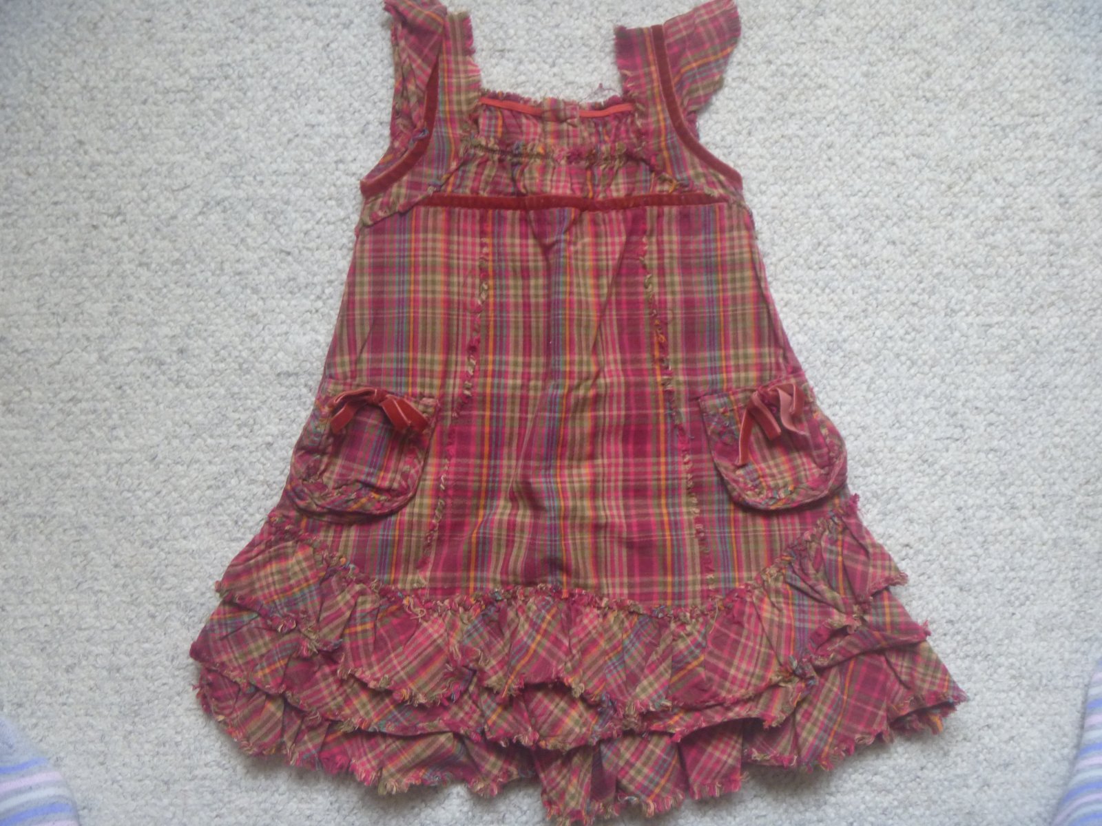 Prodám červené kárované šatičky na širší ramínka, zapínání na knoflíčky na zádech, s třemi řadami kanýrků na sukni, kapsičky se sametovou mašličkou, značka Marks & Spencer, velikost 12-18 měsíců (vel. 86), materiál 100% bavlna, velmi dobrý stav.