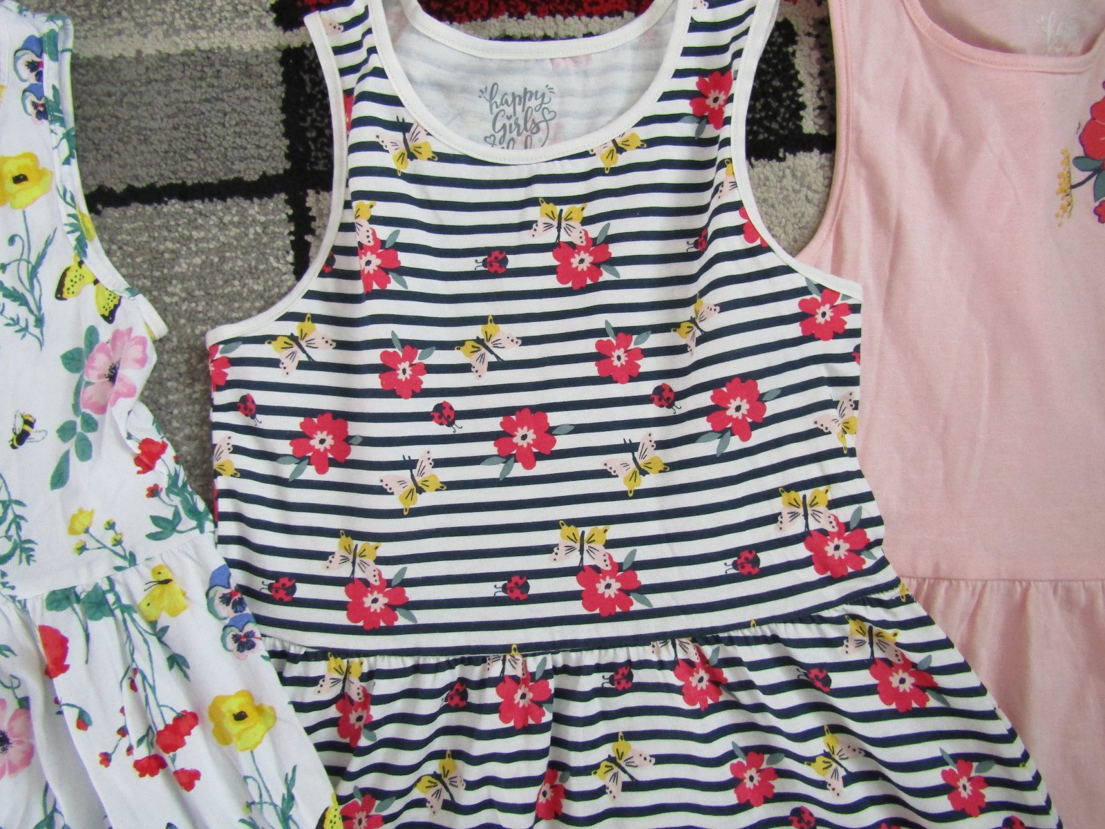 pruhované a s kytičkami -zn.C & A ,vel.134/140,délka šatů je 74-75,průramky 32-35 cm ,pěkné-cena 130 Kč za 1 ks