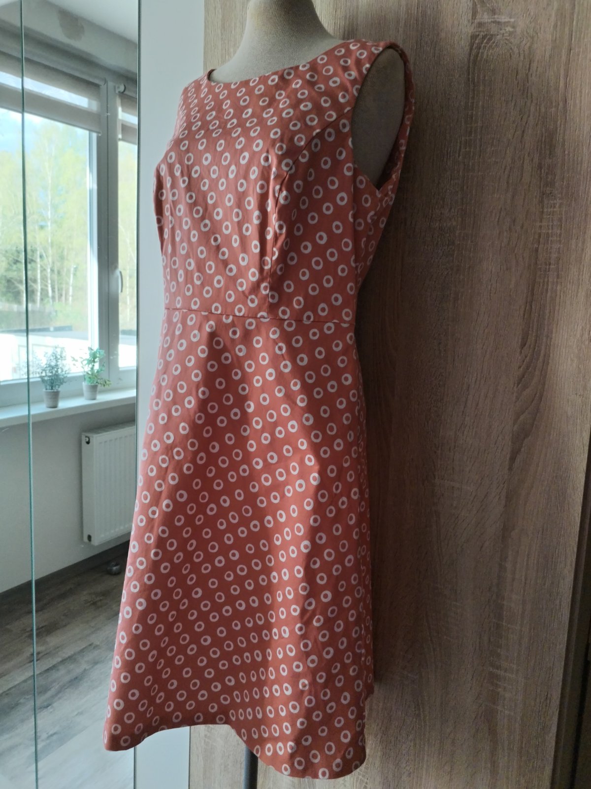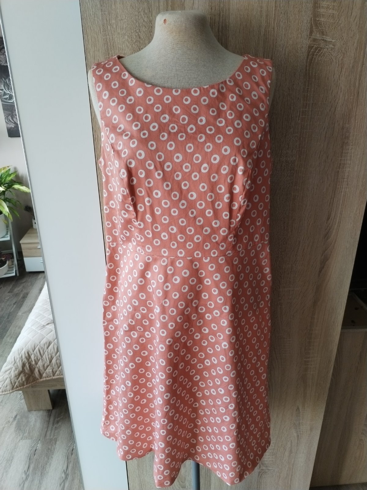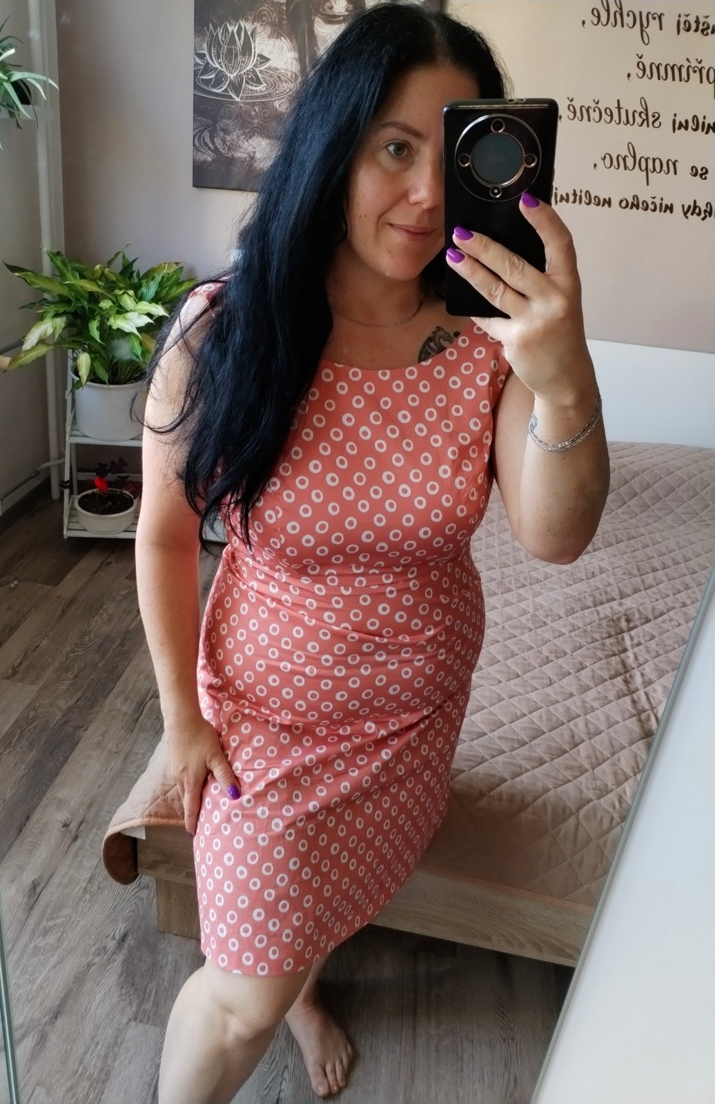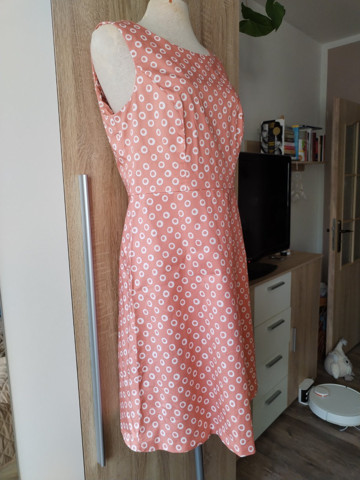Dámské šaty ve velikosti M/38 ve stylu RETRO, značky Taifun, meruňkové barvy s bílými kroužky, rozměry průramky 2x44 cm, pas 2x42 cm, délka 93 cm, polobavlněný příjemný materiál, krásně tvarují postavu, slušivé, velmi příjemné, bez rukávů, z čisté nekuřácké domácnosti, top stav nových šatů, cena 250 Kč