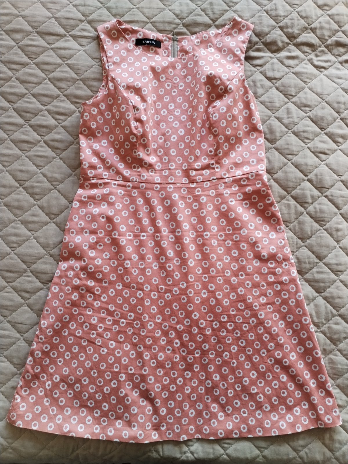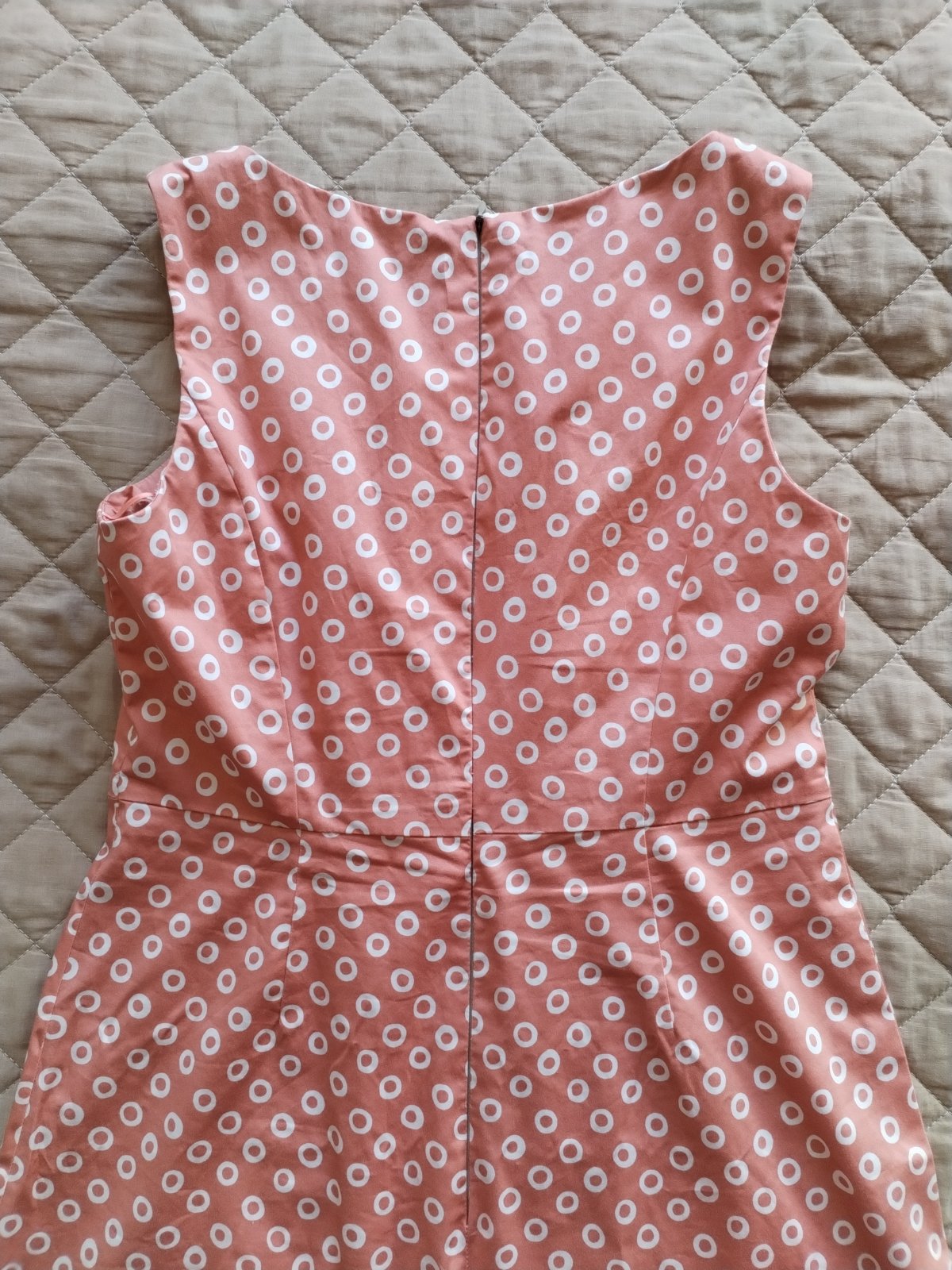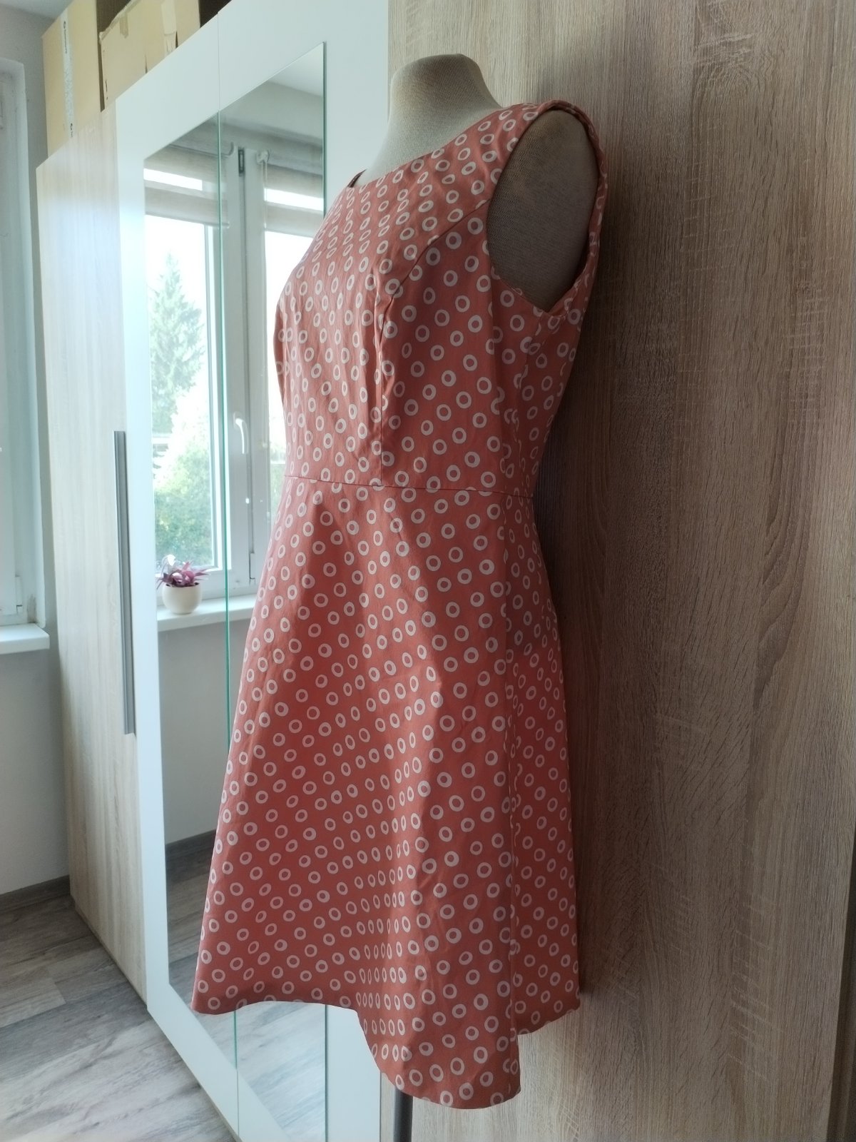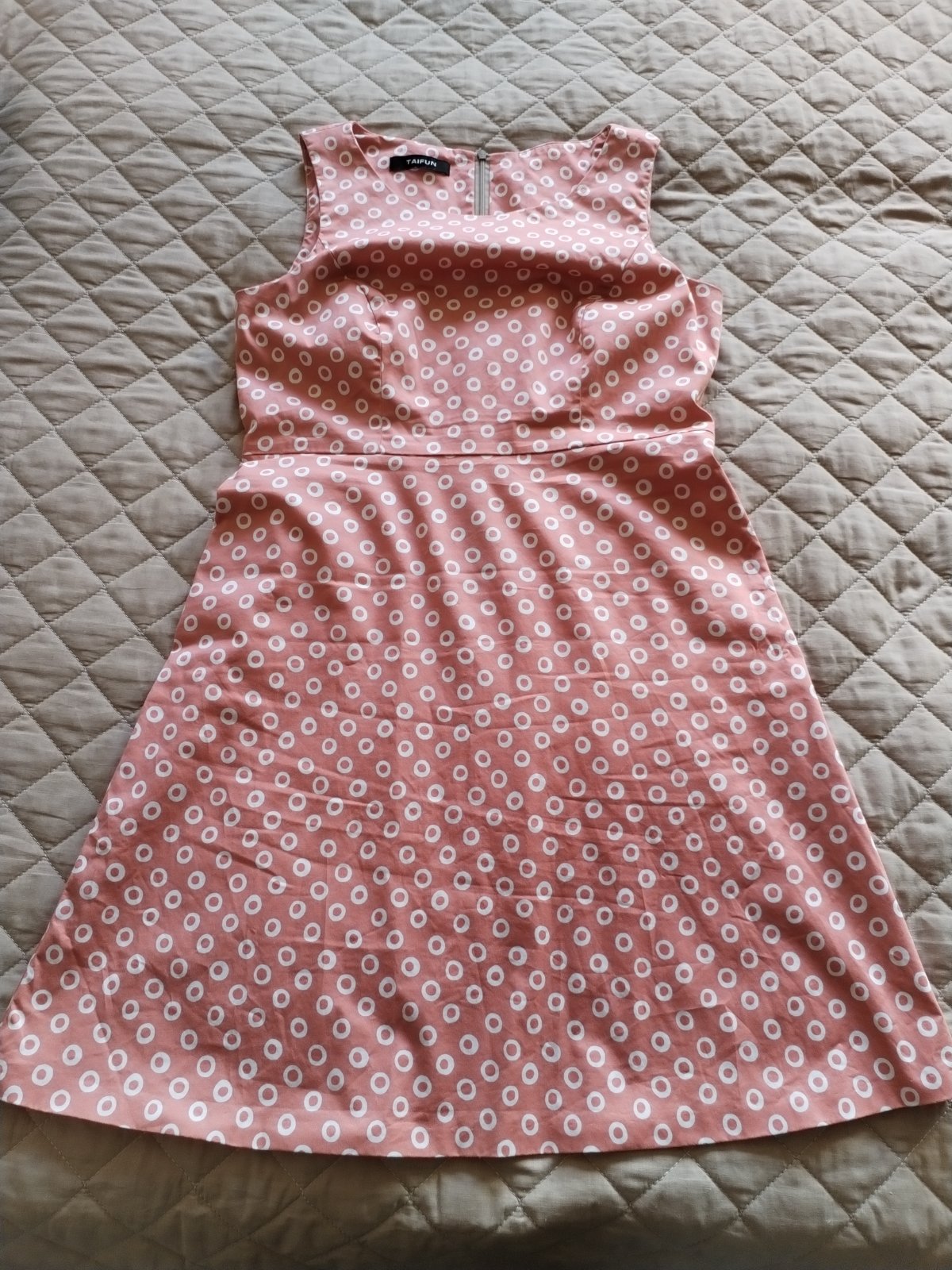 Dámské šaty ve velikosti M/38 ve stylu RETRO, značky Taifun, meruňkové barvy s bílými kroužky, rozměry průramky 2x44 cm, pas 2x42 cm, délka 93 cm, polobavlněný příjemný materiál, krásně tvarují postavu, slušivé, velmi příjemné, bez rukávů, z čisté nekuřácké domácnosti, top stav nových šatů, cena 250 Kč