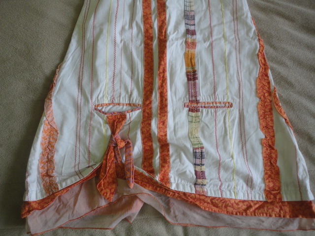 Krátce nošené, propracované, dovezené, delší plátěné šatičky bez podšívky, zdobné prvky, nášivky,kapsy, vzadu na drobné knoflíčky, dole šifonový kanýrek, křídélkový rukávek, uvedená vel. 8 let, ale možná i více, záleží na dítěti, měřte, d. 73, š. v průramku 34, cca v pase 38,5cm, dole š. 51cm