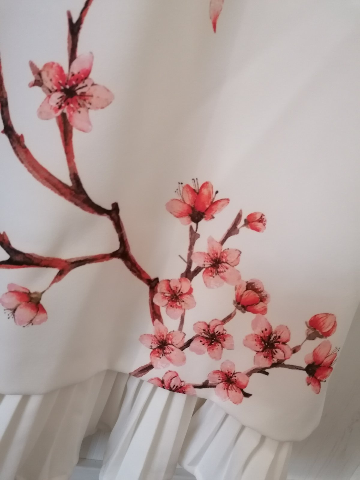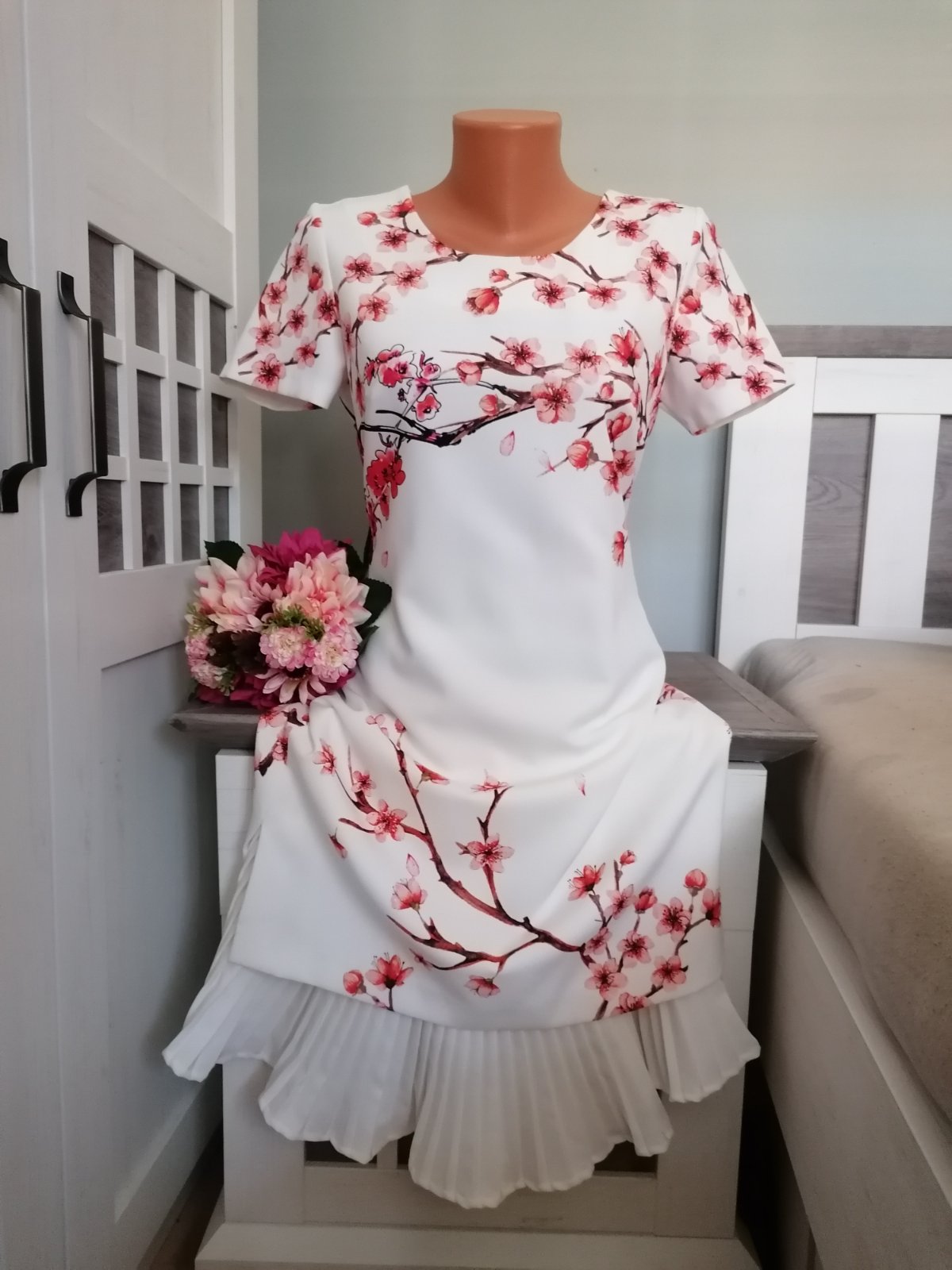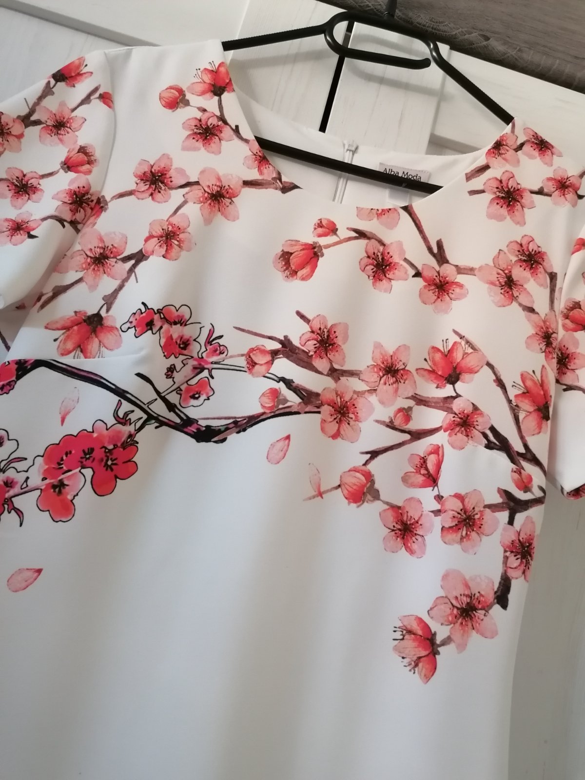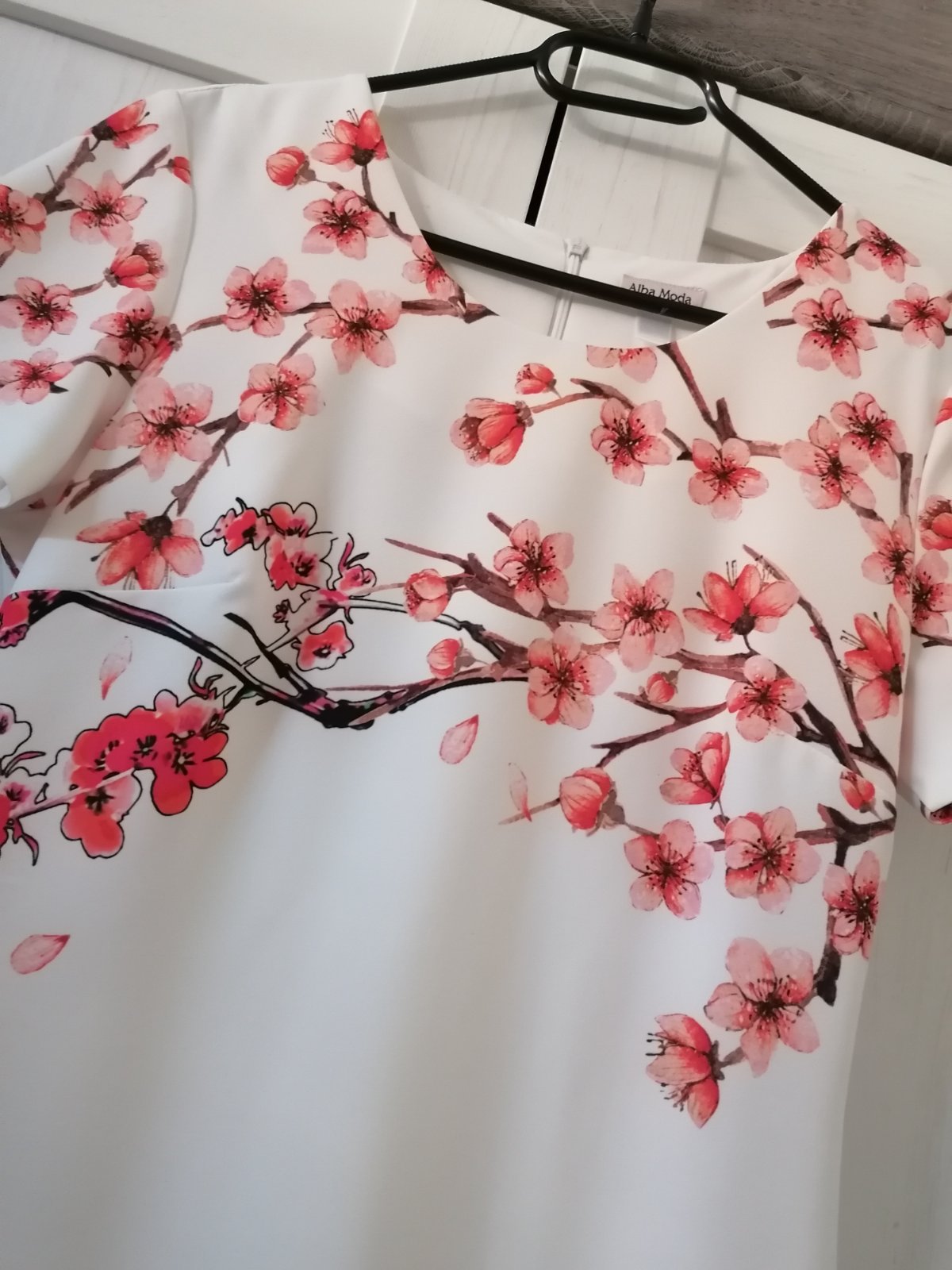 Krásné šaty s potiskem sakury. Sukně má ještě pod sebou další a na jejím konci je plisovaný spodní lem. Vzadu jsou na zip. Šaty jsou v perfektním stavu, mírně pruží....Čisté bílý podklad....Zn: Alba Móda. Velikost není uvedena, ale bude sedět na M. Míry jsou v popisu. Míry : délka 94 cm, pas 2 x 39 cm, průramky 2 x 45 cm a délka rukávu od krku je 25 cm Materiál: 95 % polyester a 5 % elastanu. Poštovné - balíkovna za 85 Kč nebo zásilkovnou za 90 Kč.