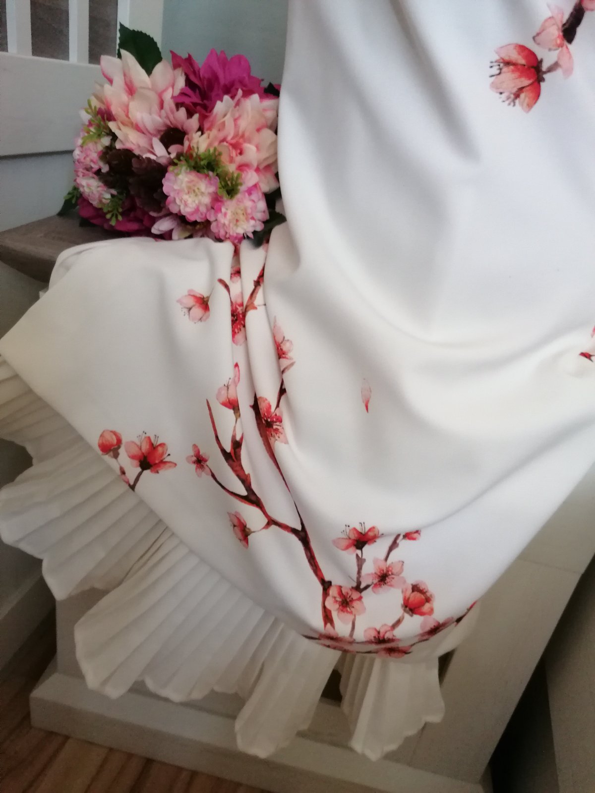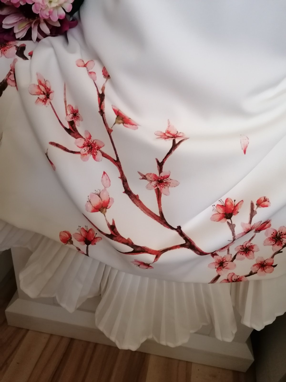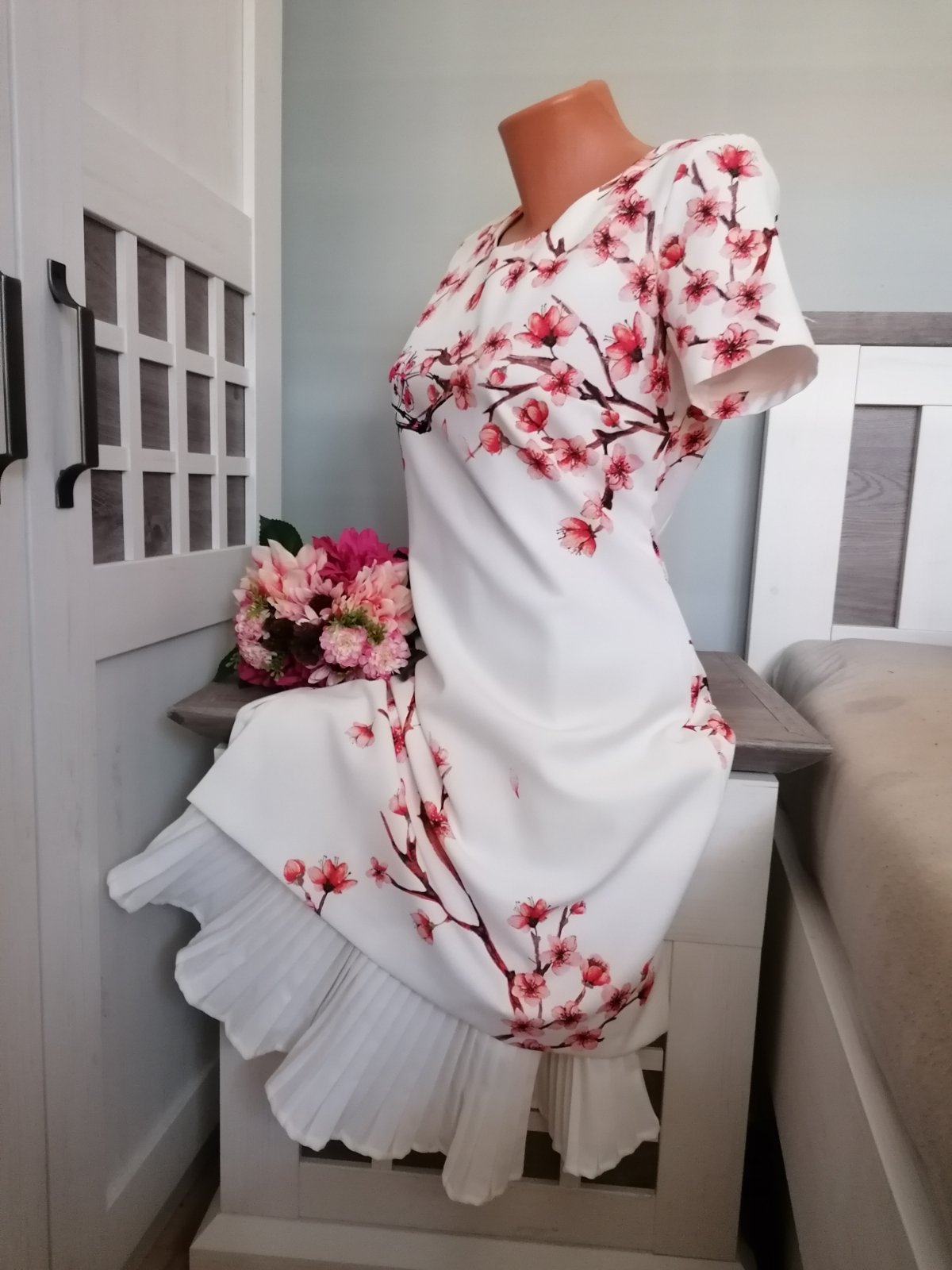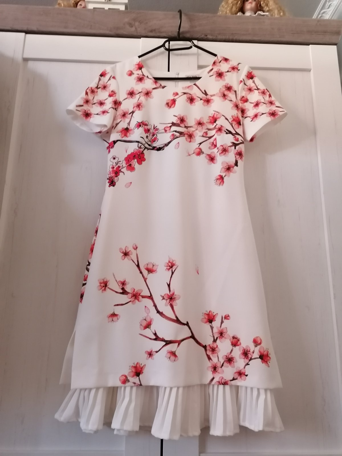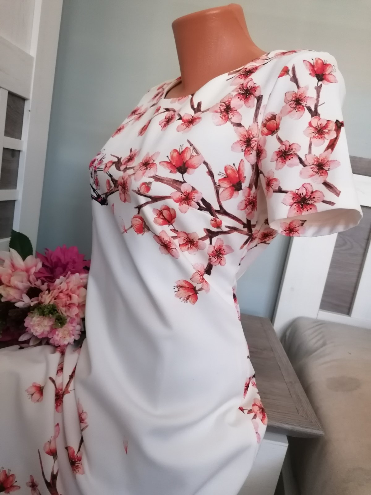 Krásné šaty s potiskem sakury. Sukně má ještě pod sebou další a na jejím konci je plisovaný spodní lem. Vzadu jsou na zip. Šaty jsou v perfektním stavu, mírně pruží....Čisté bílý podklad....Zn: Alba Móda. Velikost není uvedena, ale bude sedět na M. Míry jsou v popisu. Míry : délka 94 cm, pas 2 x 39 cm, průramky 2 x 45 cm a délka rukávu od krku je 25 cm Materiál: 95 % polyester a 5 % elastanu. Poštovné - balíkovna za 85 Kč nebo zásilkovnou za 90 Kč.