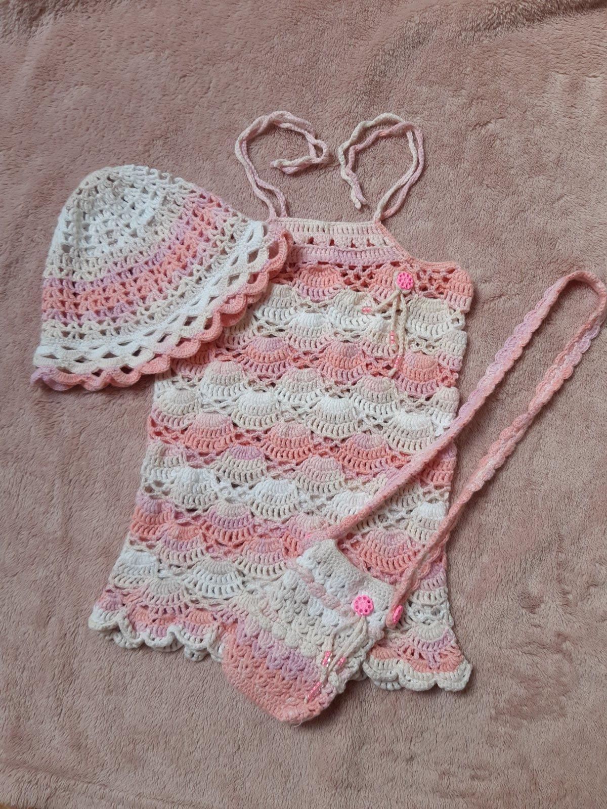 Sada šaty + klobouček + kabelka.Ruční výroba. Ideální pro horké letní dny. Velikost pro holčičku 1-1,5 roku.