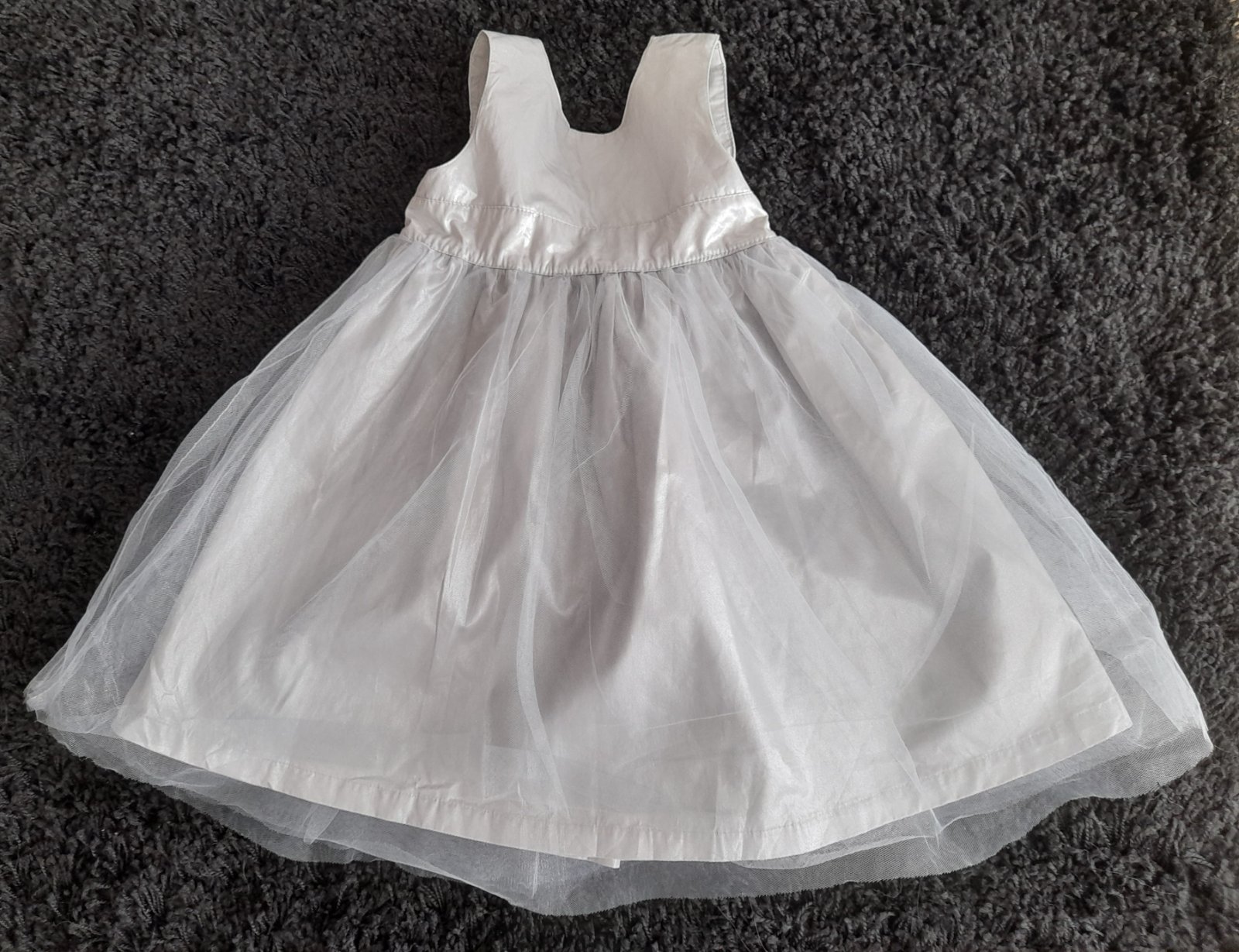 Dívčí šaty s krajkou a tylovou sukní, na sukni jsou našité perličky, za krkem zapínání na 1 knoflík, délka 53 cm, šířka přes hrudník 26 cm (jsou trochu pružné)