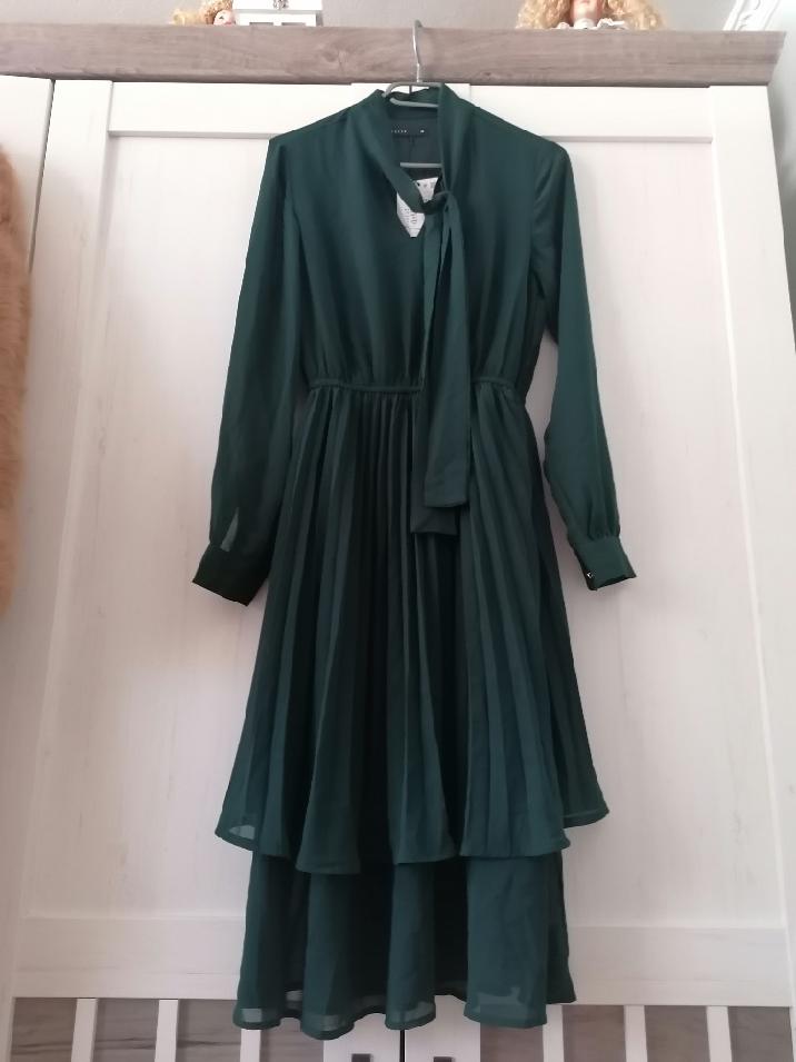 Pěkné tmavě zelené šaty s vázáním kolem krku a plisovanou spodní částí sukně. Horní plisovaný díl sukně je kratší než dolní....Šaty jsou nové ještě s visačkou. Jsou mě bohužel malé....Nestihla jsem včas vrátit. PC 1199 Kč. Na figuríně jsou focené s páskem, ale ten není součástí prodeje! Míry : délka 111 cm - delší díl sukně, pas 2 x 30 cm - 2 x 44 cm - v pase je guma, průramky 2 x 47 cm, délka rukávů od krku je 71 cm. Materiál : 100 % polyester. Poštovné - balíkovna 85 Kč nebo zásilkovna za 90 Kč.