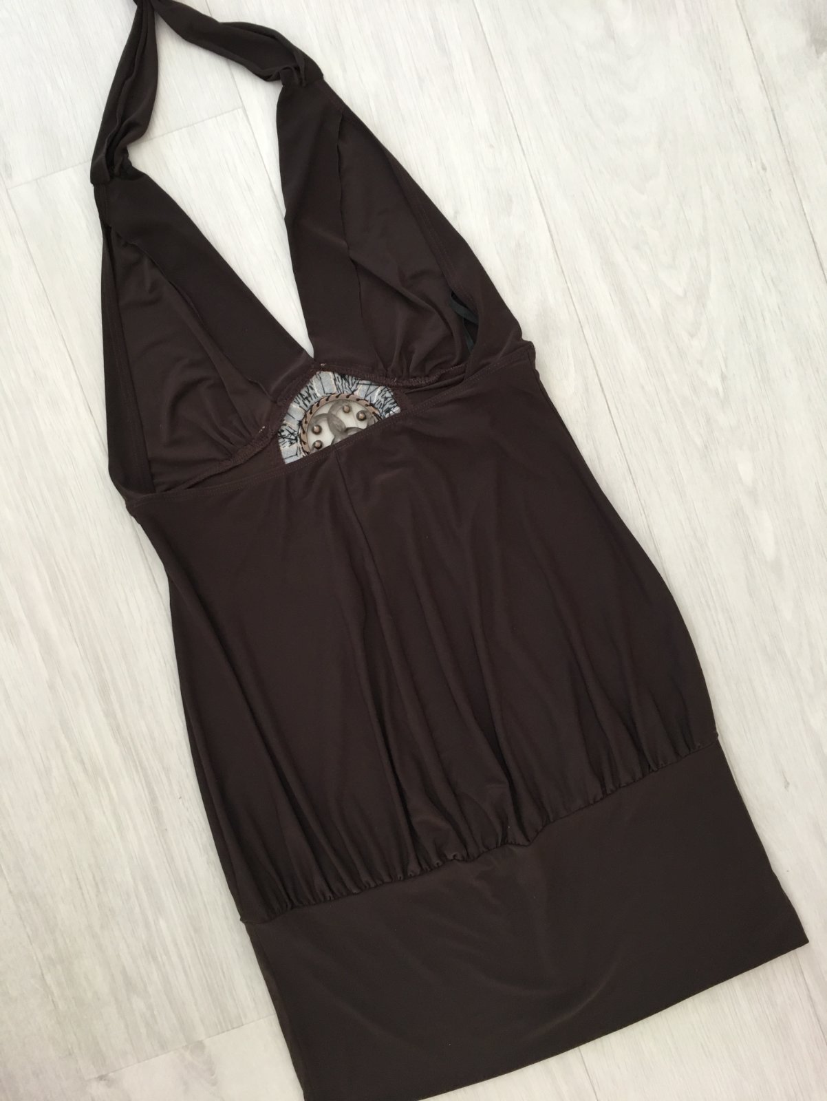 Velmi příjemný a hodně pružný materiál, proto je vhodná pro každou velikost (i na plavky). Zavazování kolem krku.