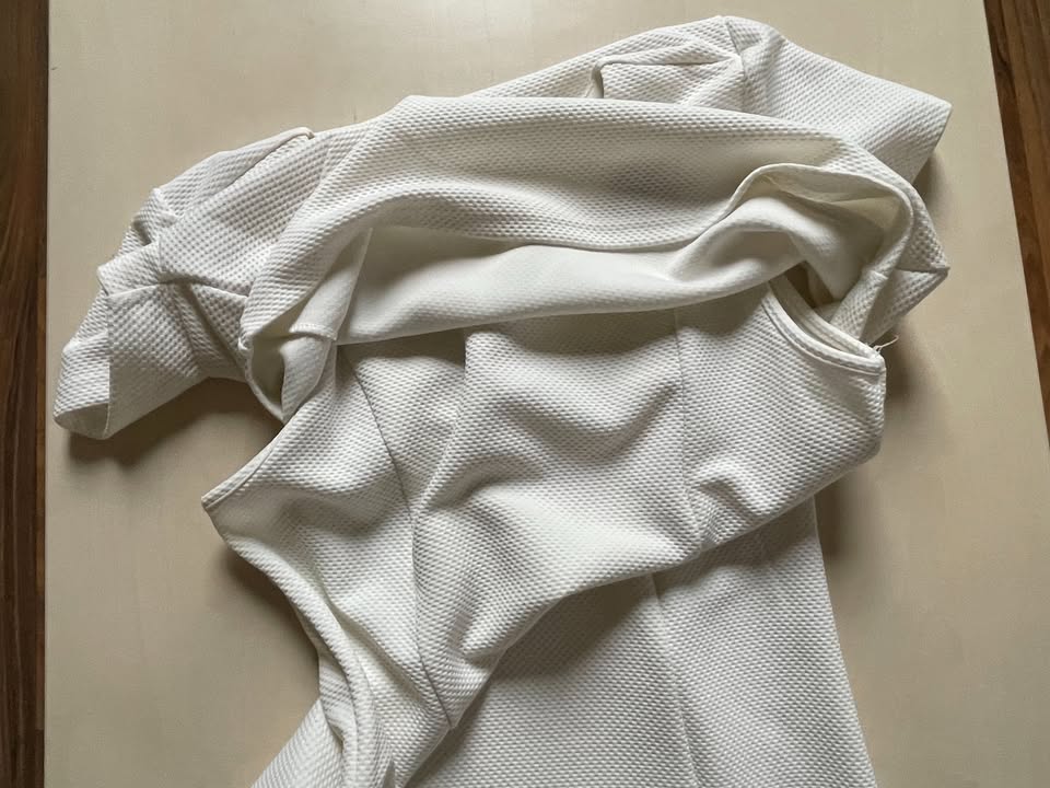 2164. nabízím k prodeji tyto bílé šaty, vel S, Troll. Barva bílá, materiál se strukturou. Zajímvě řešené se efektem topu na - jsou ale vcelku. Zapínání na zip na boku. Materiál 95% polyester, 5% elasten. Nové, jen vyprané a uložené ve skříni, bez vad, krásné