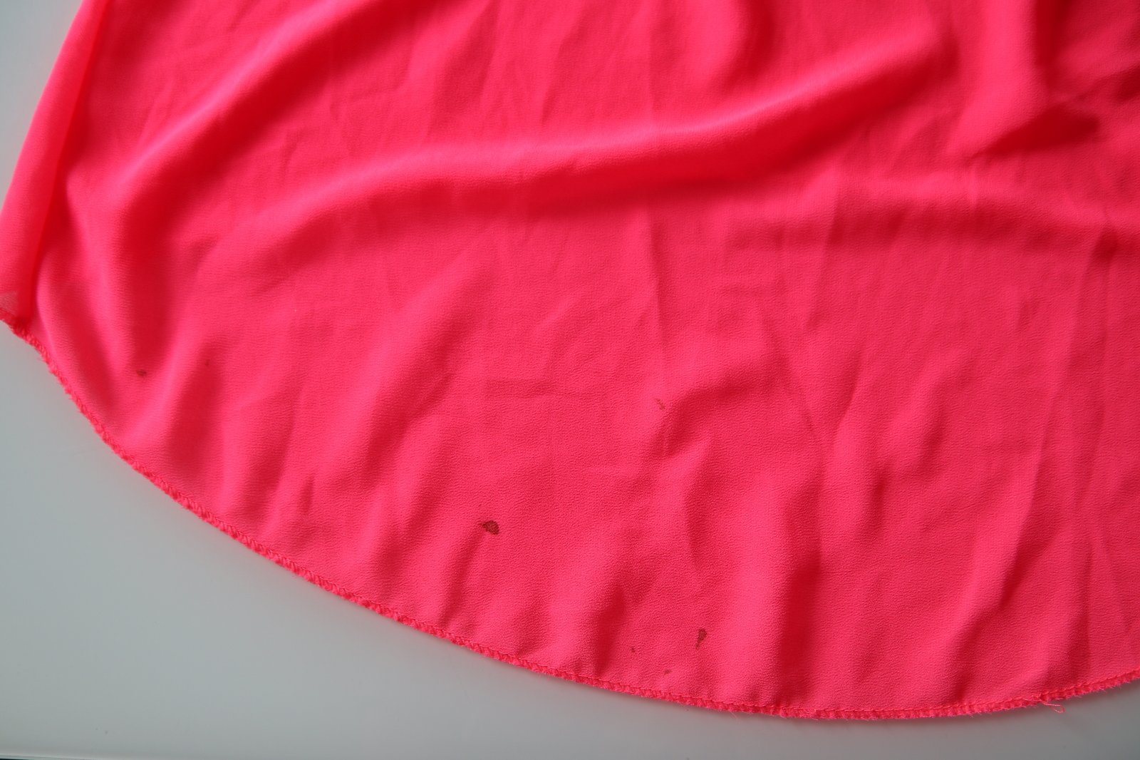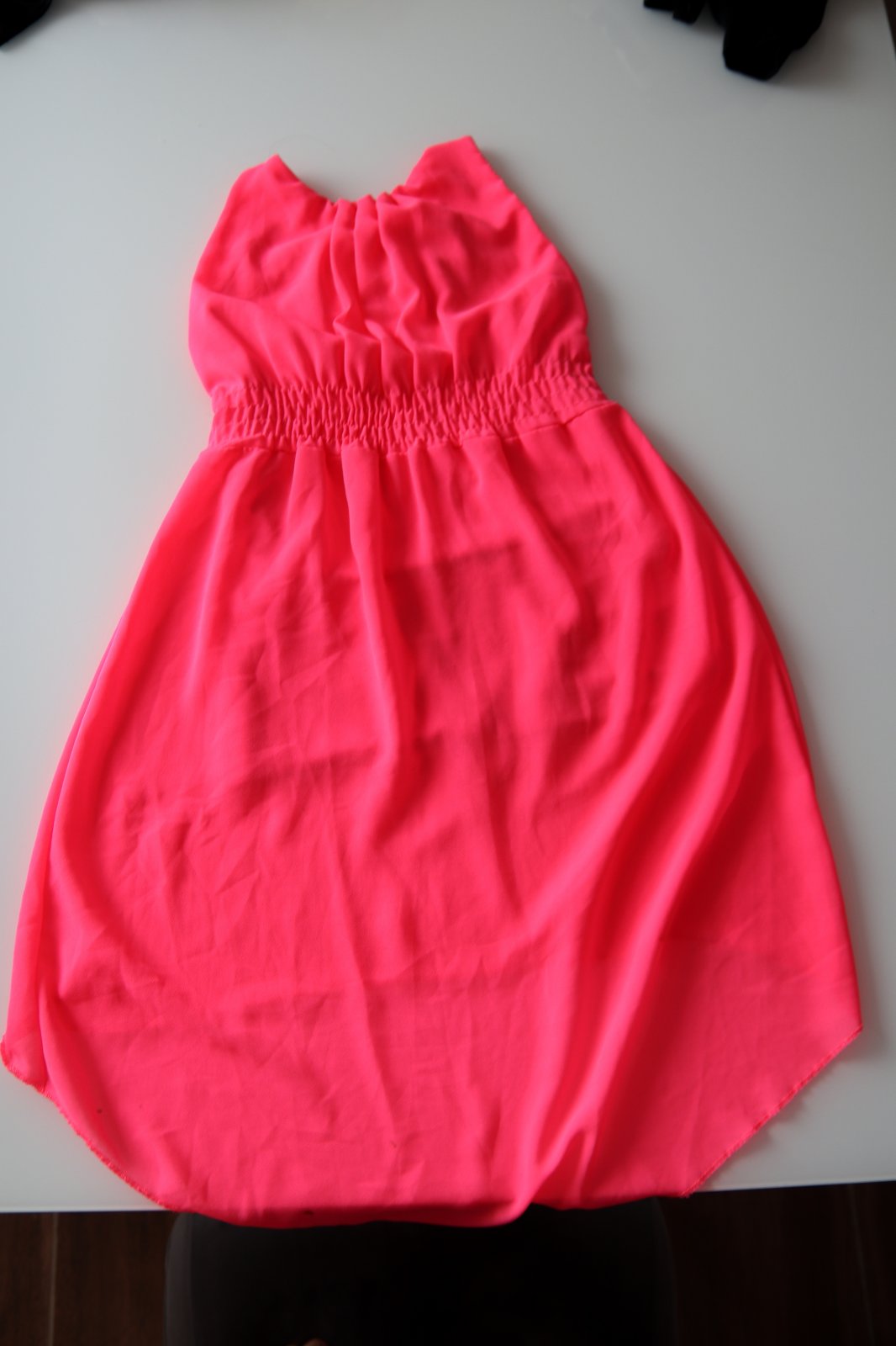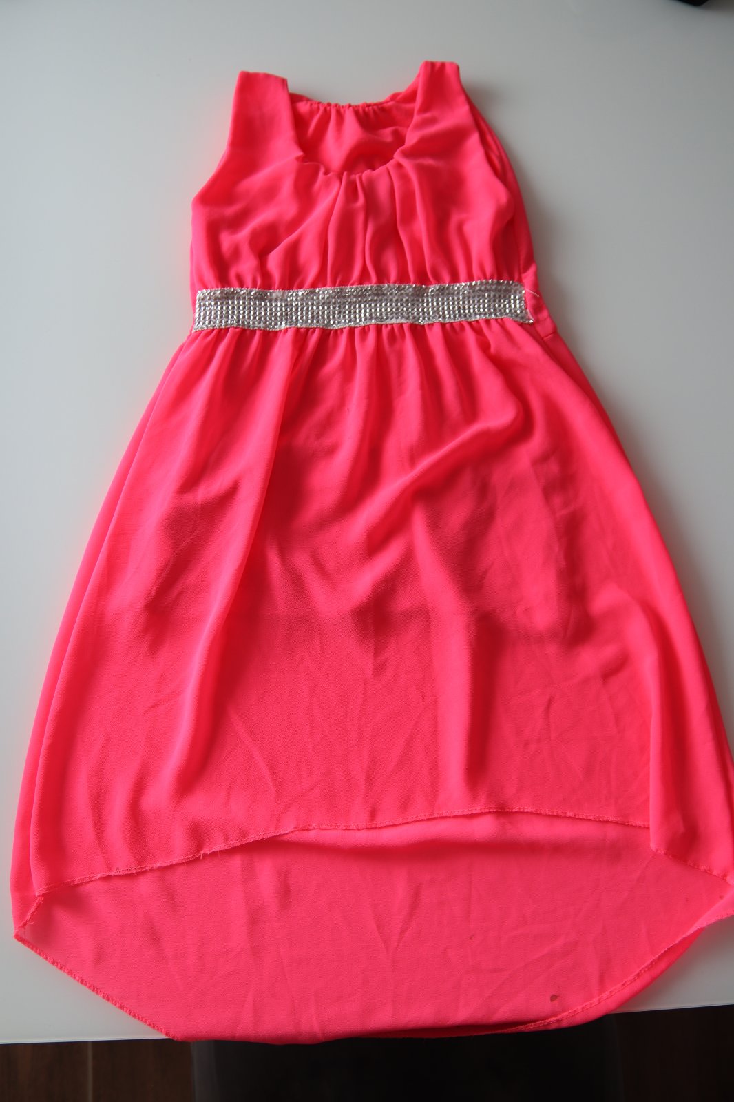 prodám dívčí šaty z lehkého materiálu s podšívkou. Nošené, vzadu dole nevypratelné flíčky viz foto. Délka od krku předního dílu je 54 cm, vzadu jsou šaty cca o 20 cm delší