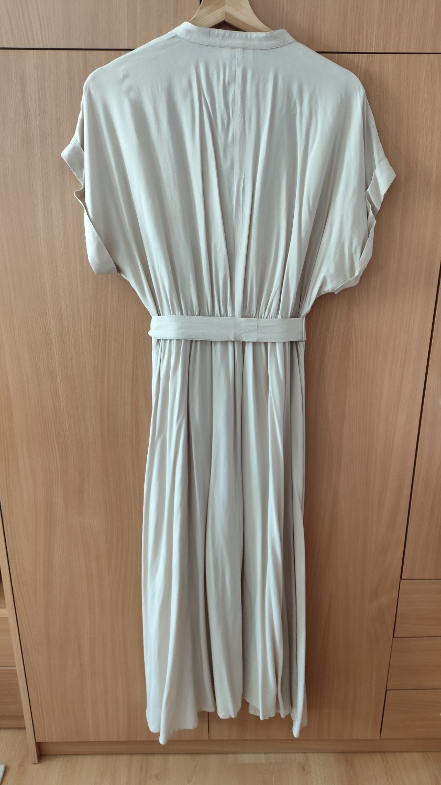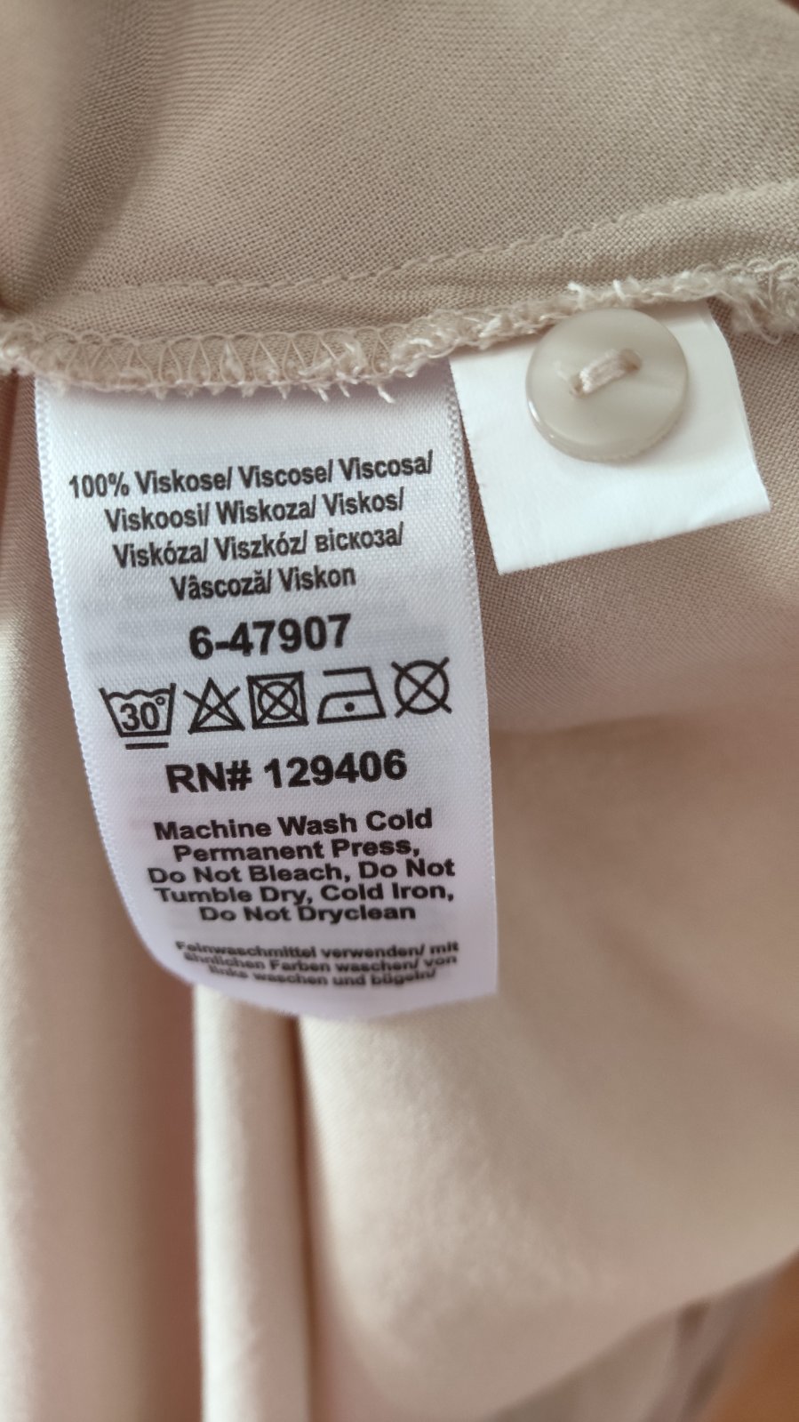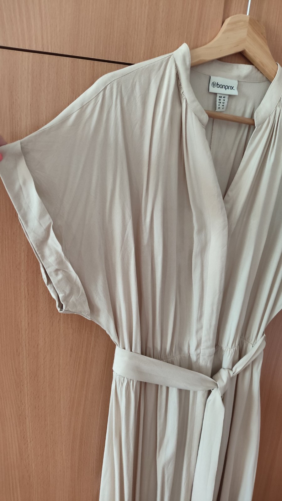 Krátce nošené, velmi příjemné béžové propínací šaty, materiál 98% bavlna, 2% elastan, kapsy na zip, v pase boční páseky na stažení, propásnutí obvodu, d. 95,5cm, š. v průramku 48, pas lze stáhnout ...