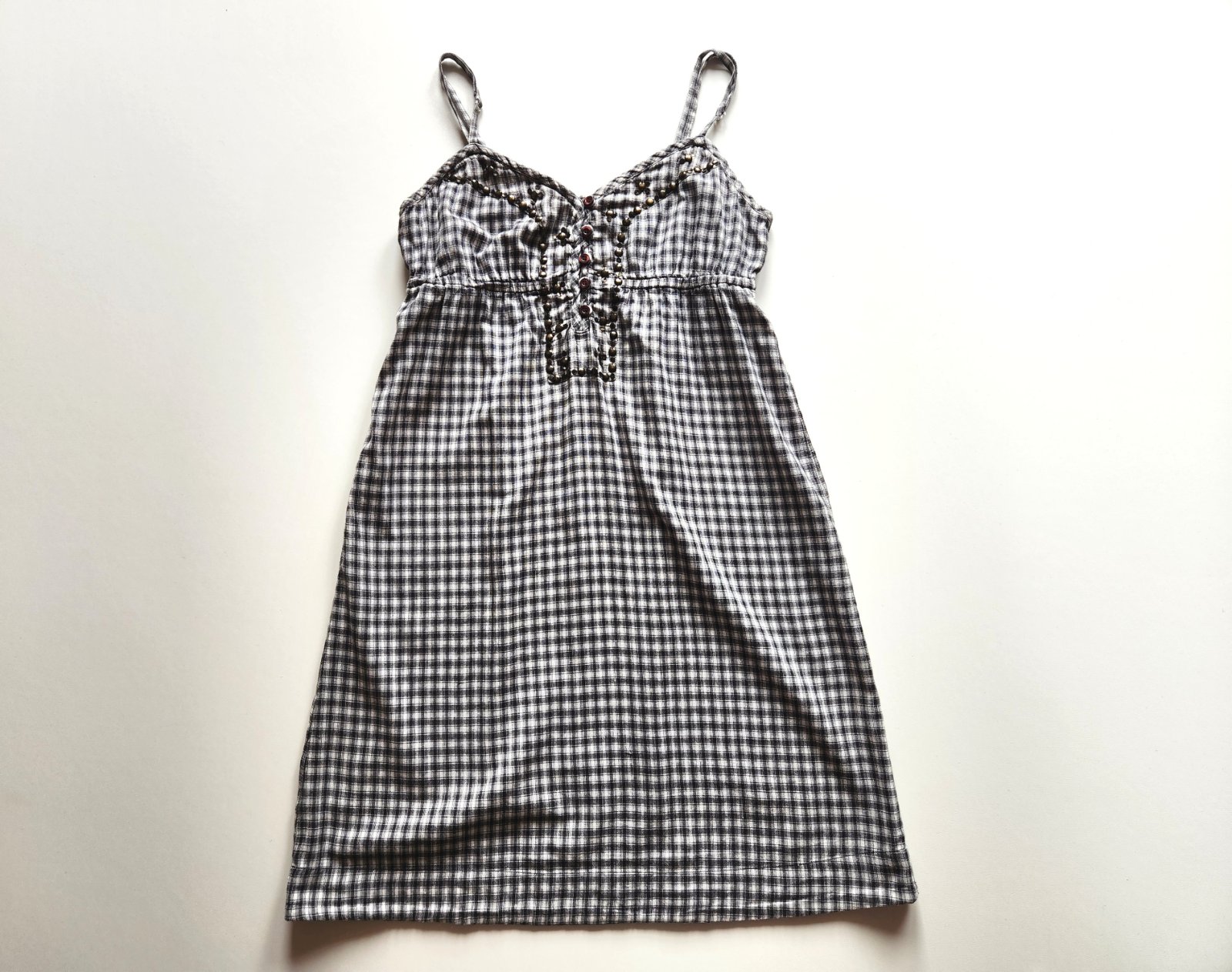 Kostičkované černo-bílé lehké šaty zn. PROMOD, nastavitelná ramínka, výstřih na knoflíky s poutky, kovová aplikace s flitry, gumička pod prsy.