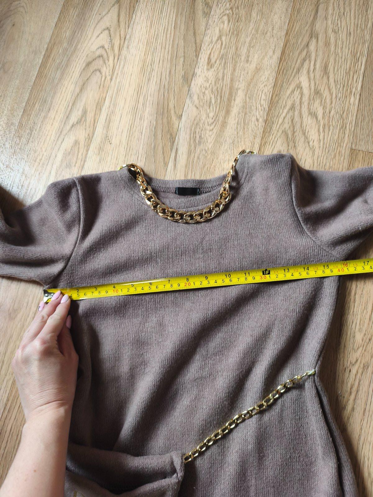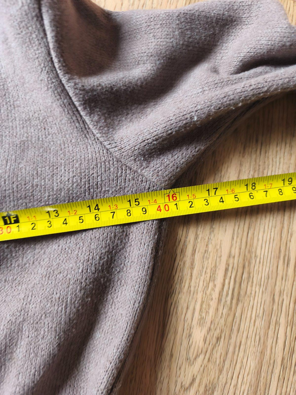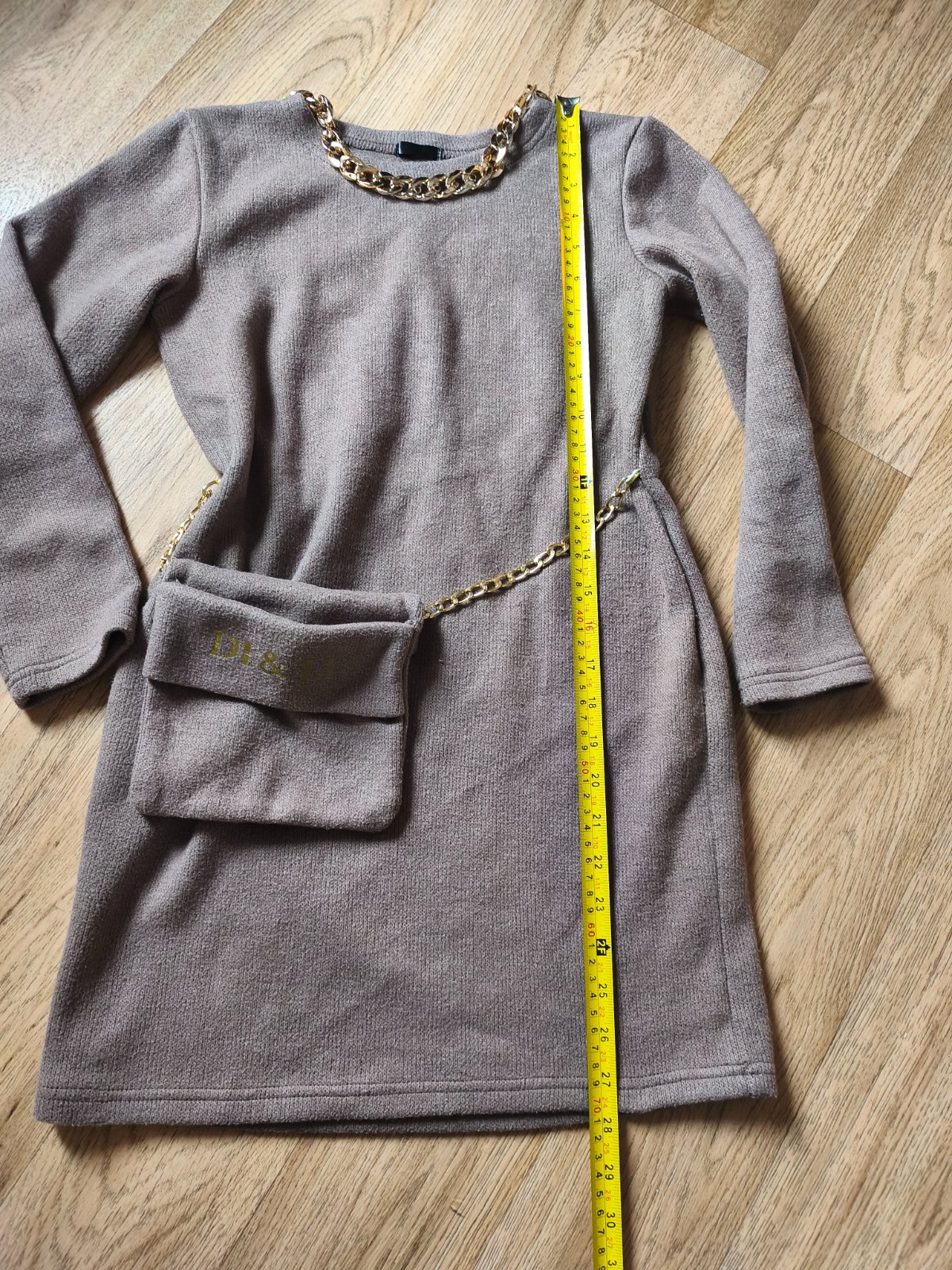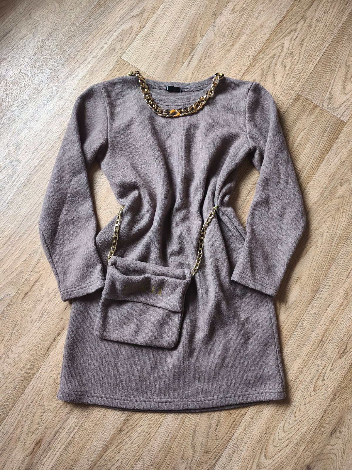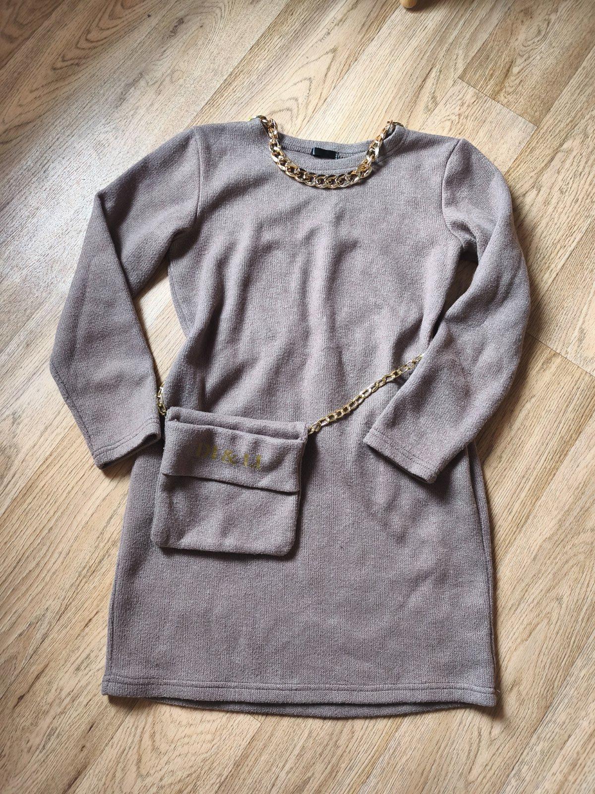 Svetrové šaty s kabelkou vel M, ale je to tak XXS pro velmi drobnou mamku nebo cca 146-158 max (rukáv může být 3/4), měřte. Jsou pružné. Běžné známky praní, žmolík. Barva taková starorůžová nebo spíš starofialová. Řetízek na krku místy odřený.