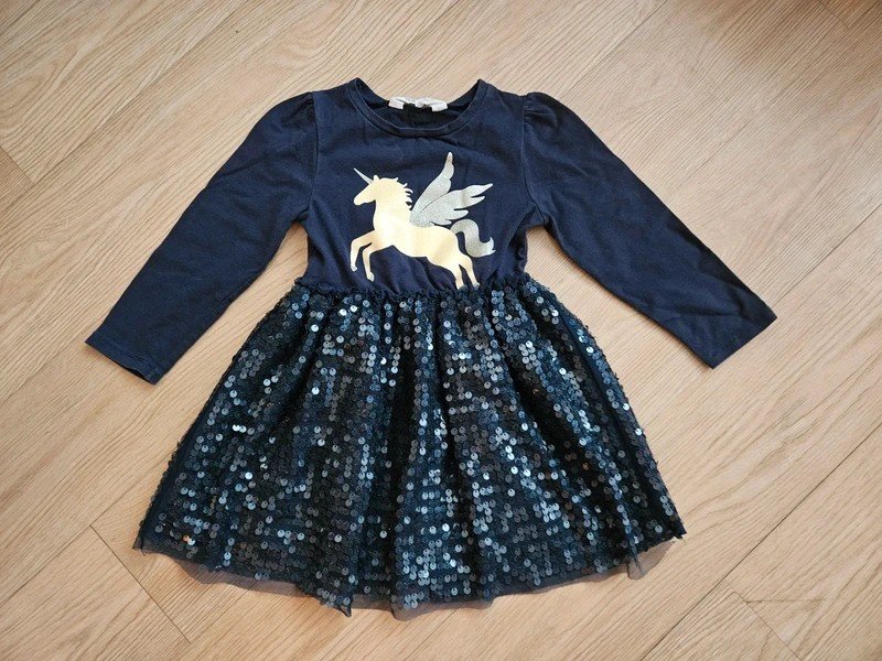 Prodávám kamarádce, šaty z H&M, velikost 104, nošené ale bez vady, sukně s flitry