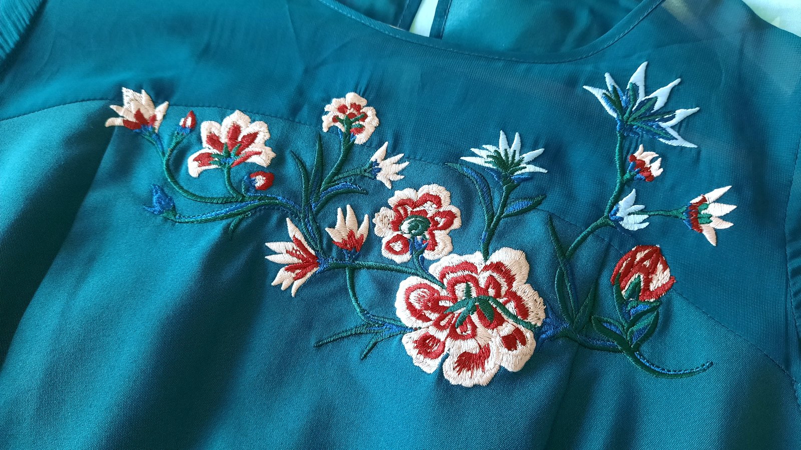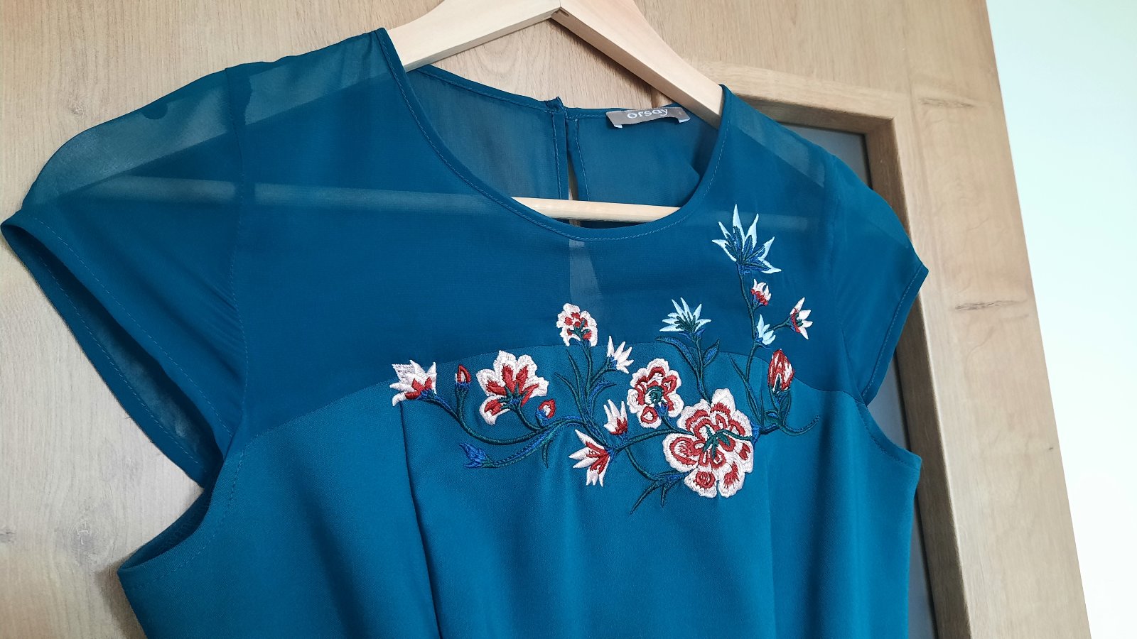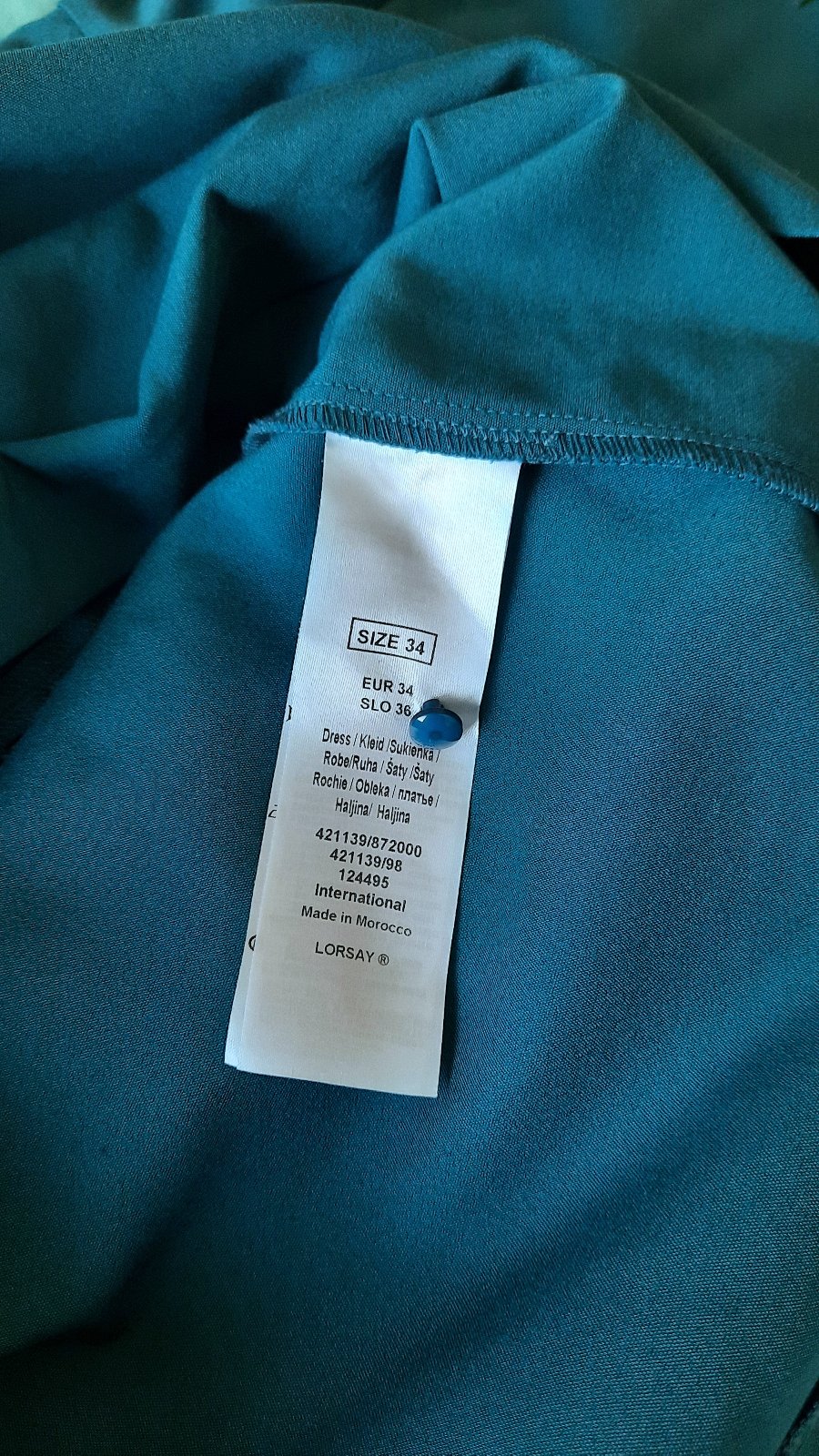 Šaty Orsay, vel. 34, mají dvě boční kapsy. Krásná tmavá tyrkysová barva. Silnější materiál, sukně si tak drží tvar.