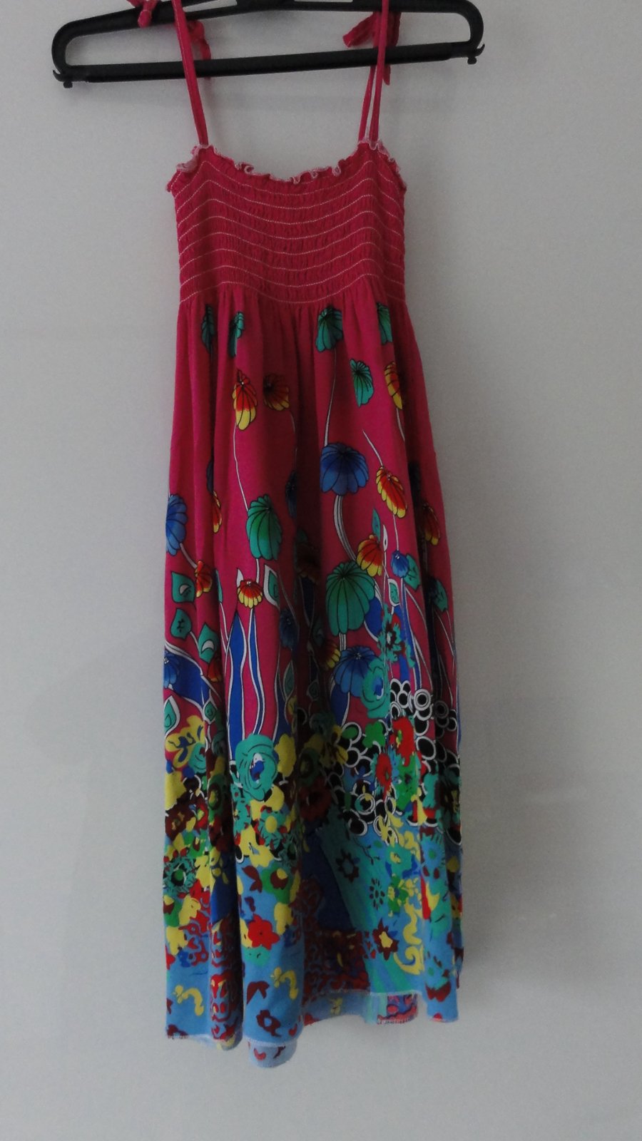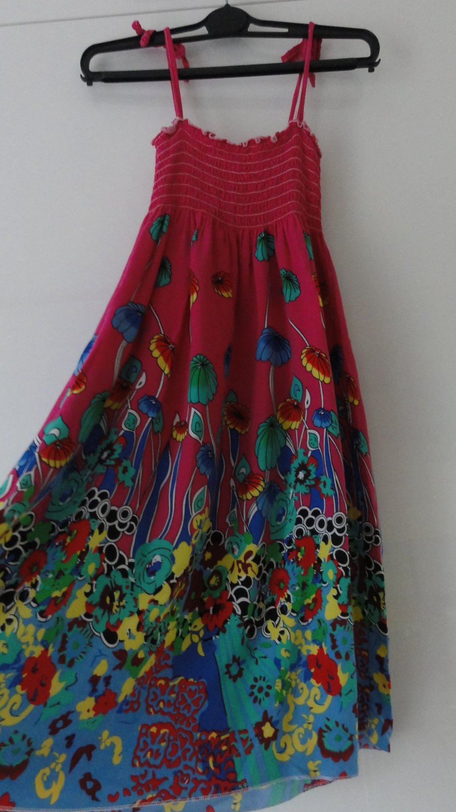 prodám dívčí šaty z lehkého materiálu s podšívkou. Nošené, vzadu dole nevypratelné flíčky viz foto. Délka od krku předního dílu je 54 cm, vzadu jsou šaty cca o 20 cm delší