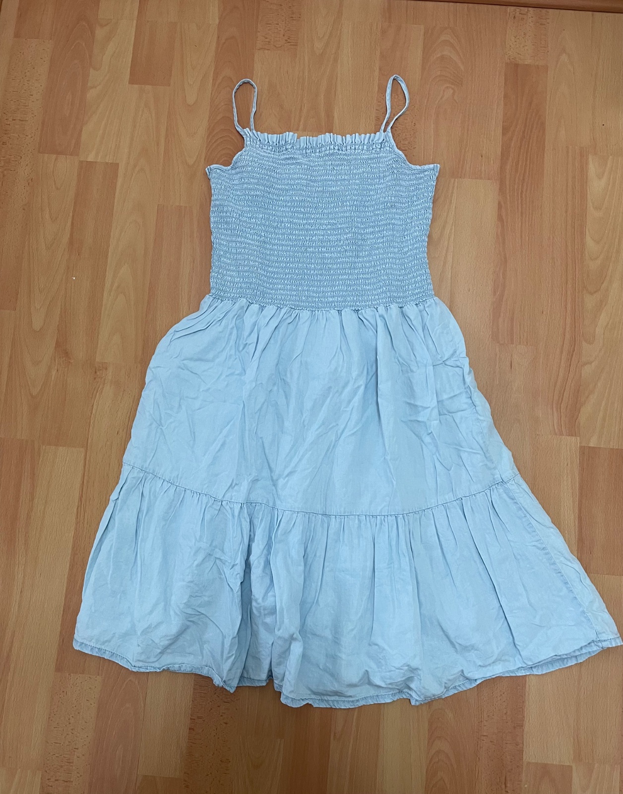 Letní bavlněné šaty s motýlky bpc vel.164-170, dcera nosila mezi 10-12rokem, pěkné, našla jsem dva pidi flíčky ve velikosti špendlíkové hlavičky, na léto nějaké slečně stále poslouží, délka je ke k...