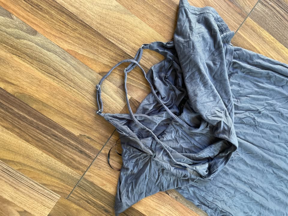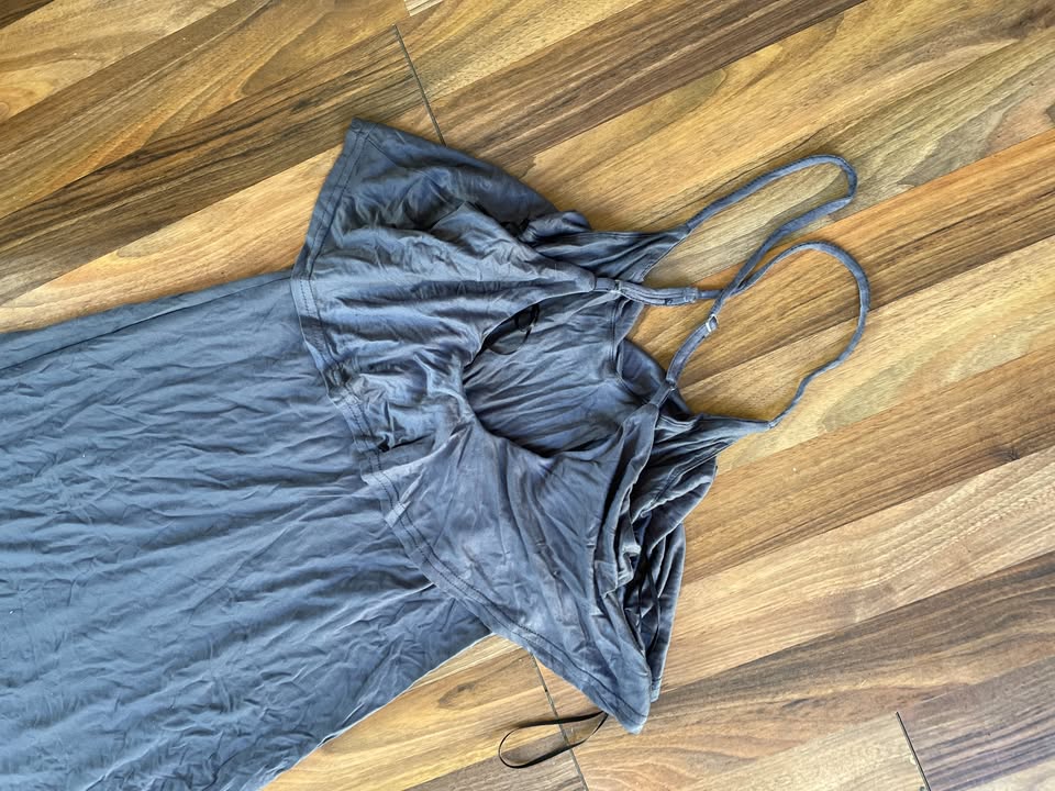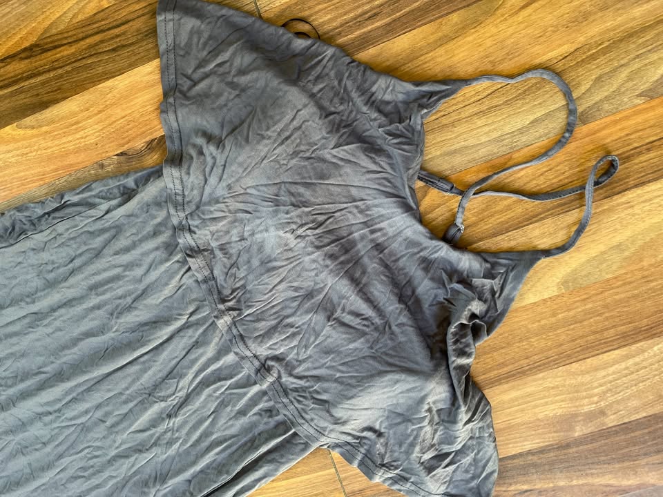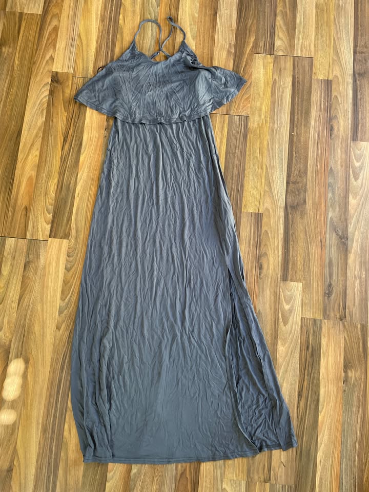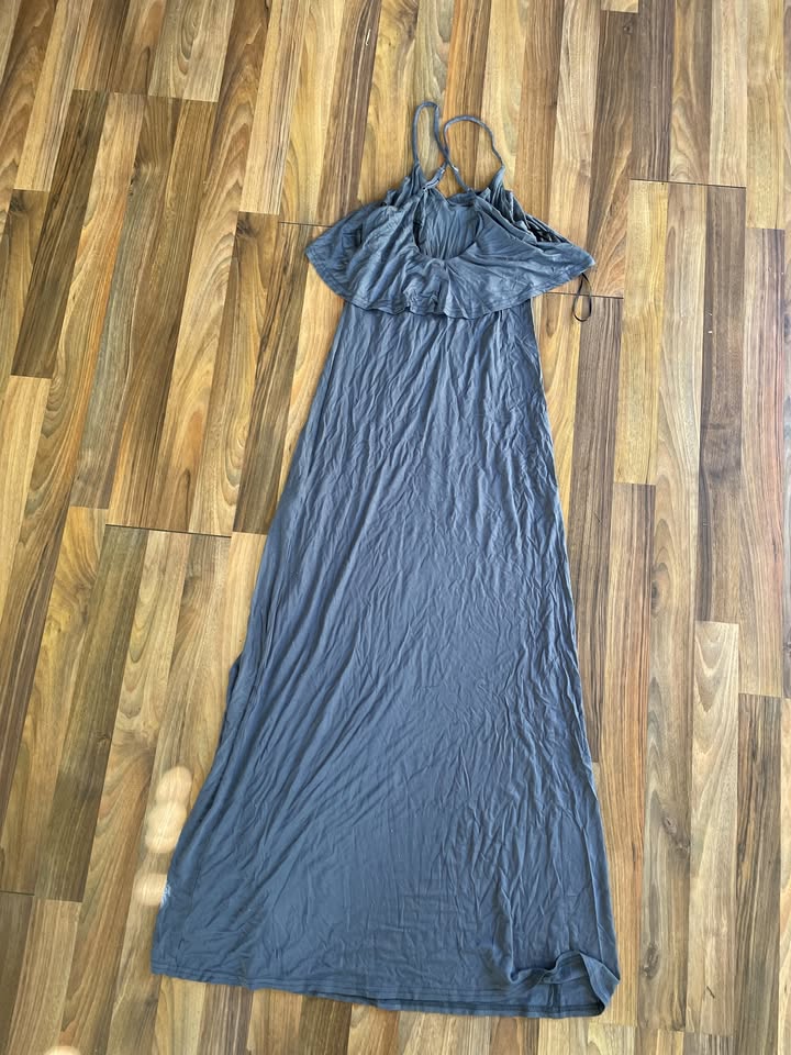 3638. nabízím k prodeji tyto šedé maxišaty s volánem na prsa, vel 38/tedy M, ale volně splývavé i klidně méně značka vystřižena - outleet. Barva tmavá šedá. Materiál jako trika 96% viscoza a 4% elasten. Nošené, bez vad, krásné
