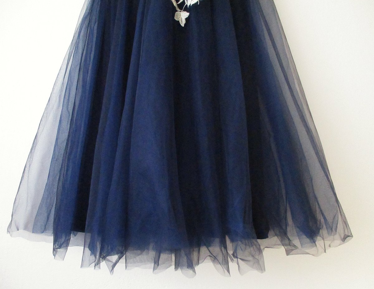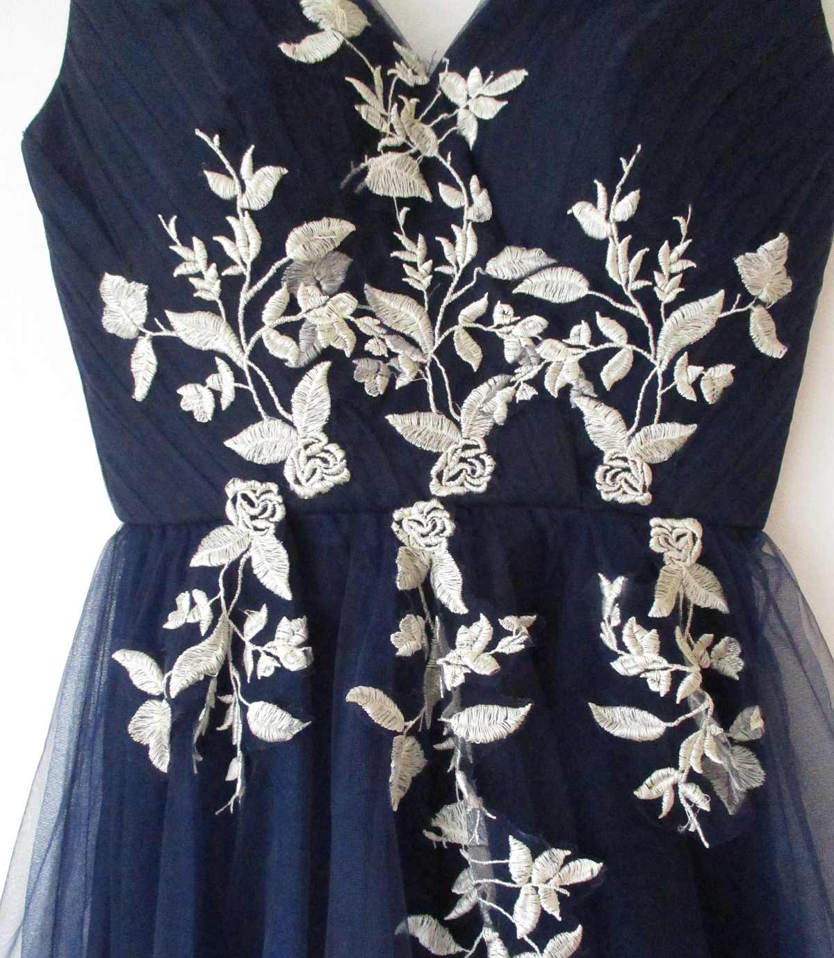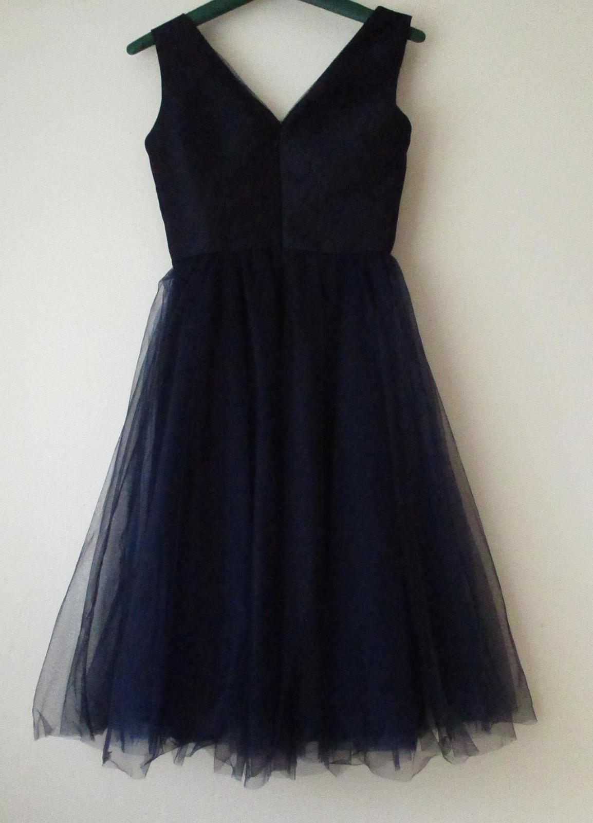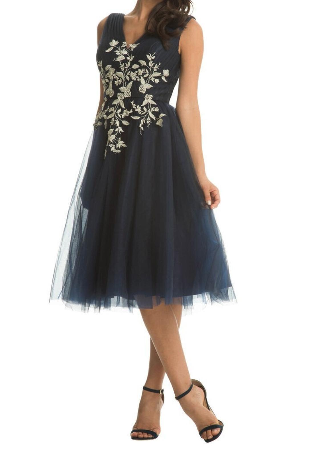 Nabízím dámské slavnostní šaty zn. Chi Chi London vel. S, nové s visačkou. Barva tmavomodrá/námořnická + krémová výšivka (barevně nejlépe odpovídá první foto). Lesklá podšívka, svrchní část tyl, v prsou vyztužené. Sukně má tři vrstvy, na zádech zapínání na zip. Rozměry: mezi podpažími cca 43 cm v klidu (natáhne se na 45 cm), pas cca 33-34,5 cm, celková délka 106 cm.