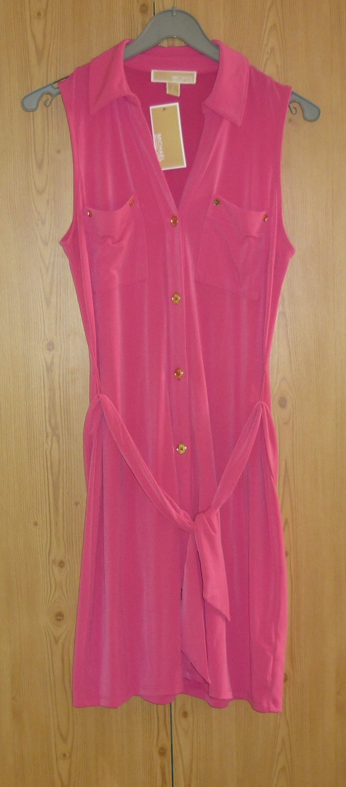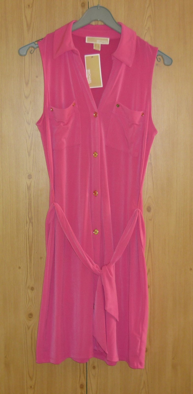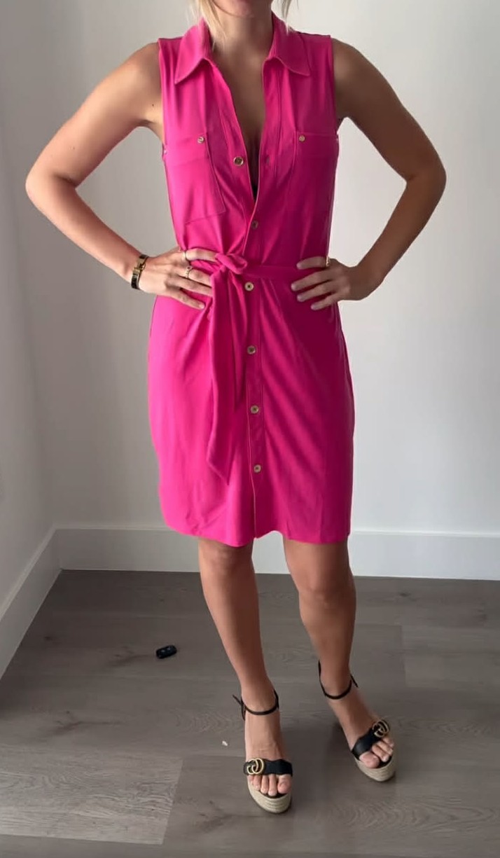 Prodám růžové dámské šaty Michael Kors, nové s visačkou. Barva je sytě růžová. Bez rukávů, límeček, výstřih do véčka, celopropínací se zlatými knoflíky, vpředu nahoře našité 2 kapsy (na každé 2 zlaté mini knoflíčky), pásek na uvázání v pase. Materiál velmi pružný: 95% polyester a 5% elastan. Velikost: S. Rozměry: šířka v místě podpaží 46cm x 2 (natáhne se na 56cm x 2), celková délka šatů 92cm. Cena: 990,-Kč + poštovné. Koukněte na moje další inzeráty, třeba si něco vyberete a ušetříte na poštovném. Tel.: 728 455 567