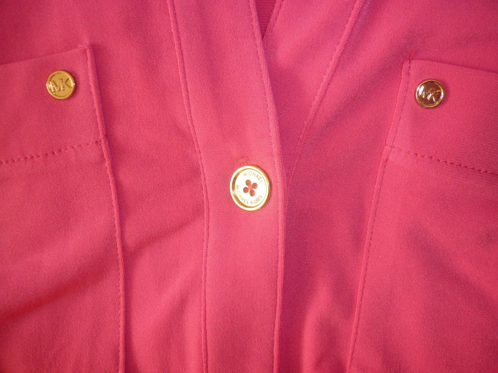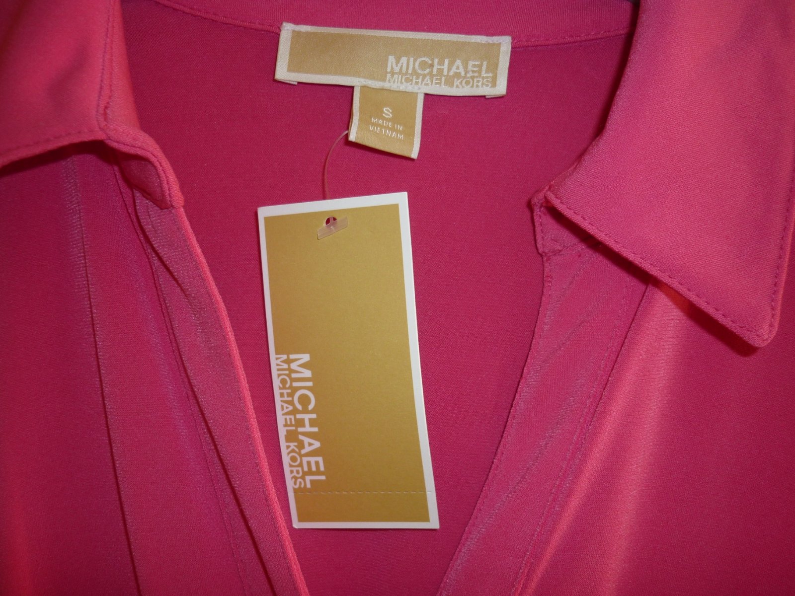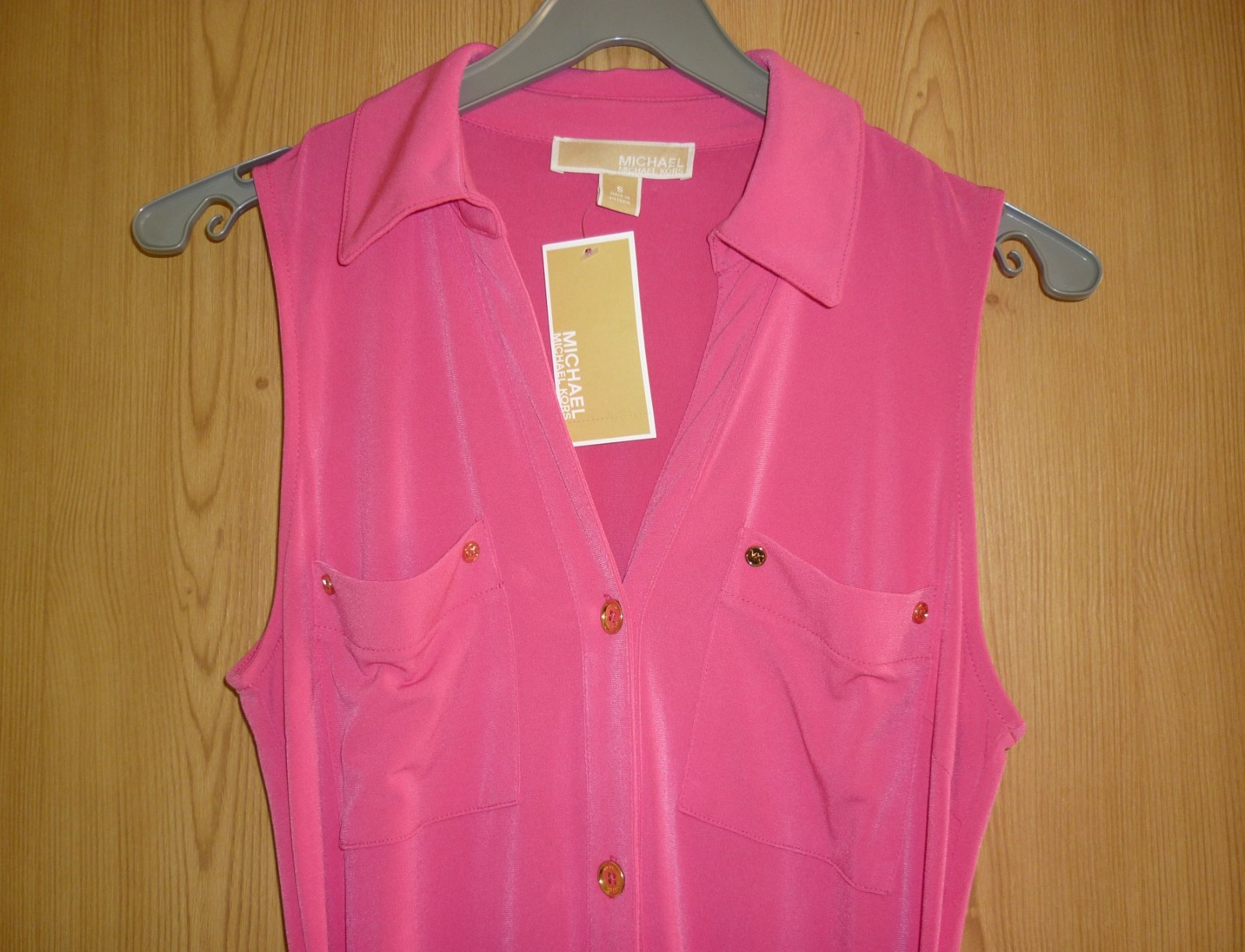 Prodám růžové dámské šaty Michael Kors, nové s visačkou. Barva je sytě růžová. Bez rukávů, límeček, výstřih do véčka, celopropínací se zlatými knoflíky, vpředu nahoře našité 2 kapsy (na každé 2 zlaté mini knoflíčky), pásek na uvázání v pase. Materiál velmi pružný: 95% polyester a 5% elastan. Velikost: S. Rozměry: šířka v místě podpaží 46cm x 2 (natáhne se na 56cm x 2), celková délka šatů 92cm. Cena: 990,-Kč + poštovné. Koukněte na moje další inzeráty, třeba si něco vyberete a ušetříte na poštovném. Tel.: 728 455 567