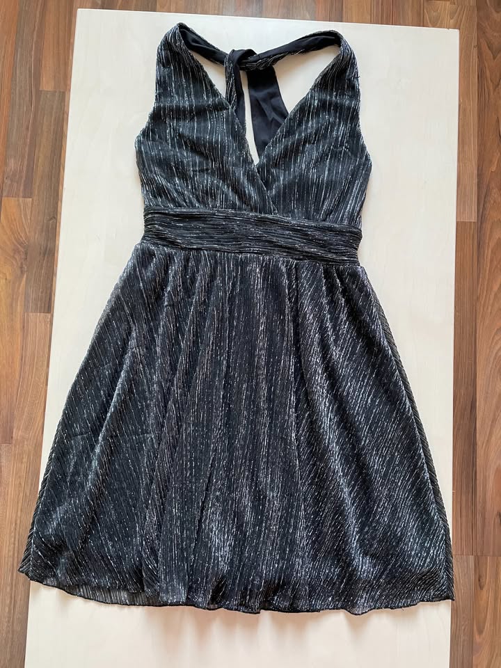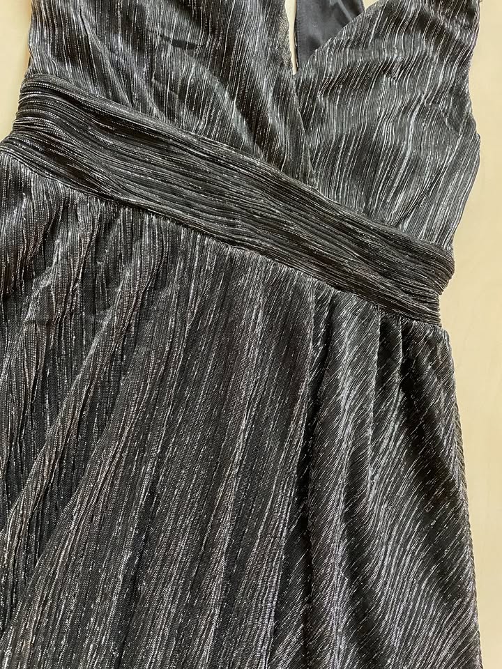 2694. nabízím k prodeji tyto černé šaty s bohatým stříbrným třpytem, vel 38/tedy M, a myslím možno i vůle méně, měřte, Amisu. Vrchní matertiál průsvotný, skládaný, protkaný stříbrnou nití. Pod tím černá spodnička. Ramínka v zádech křížené. Zapínání na boční zip. Materiál 70% polyester, 30% metalická vlákna. Nošené málo, bez vad, krásné