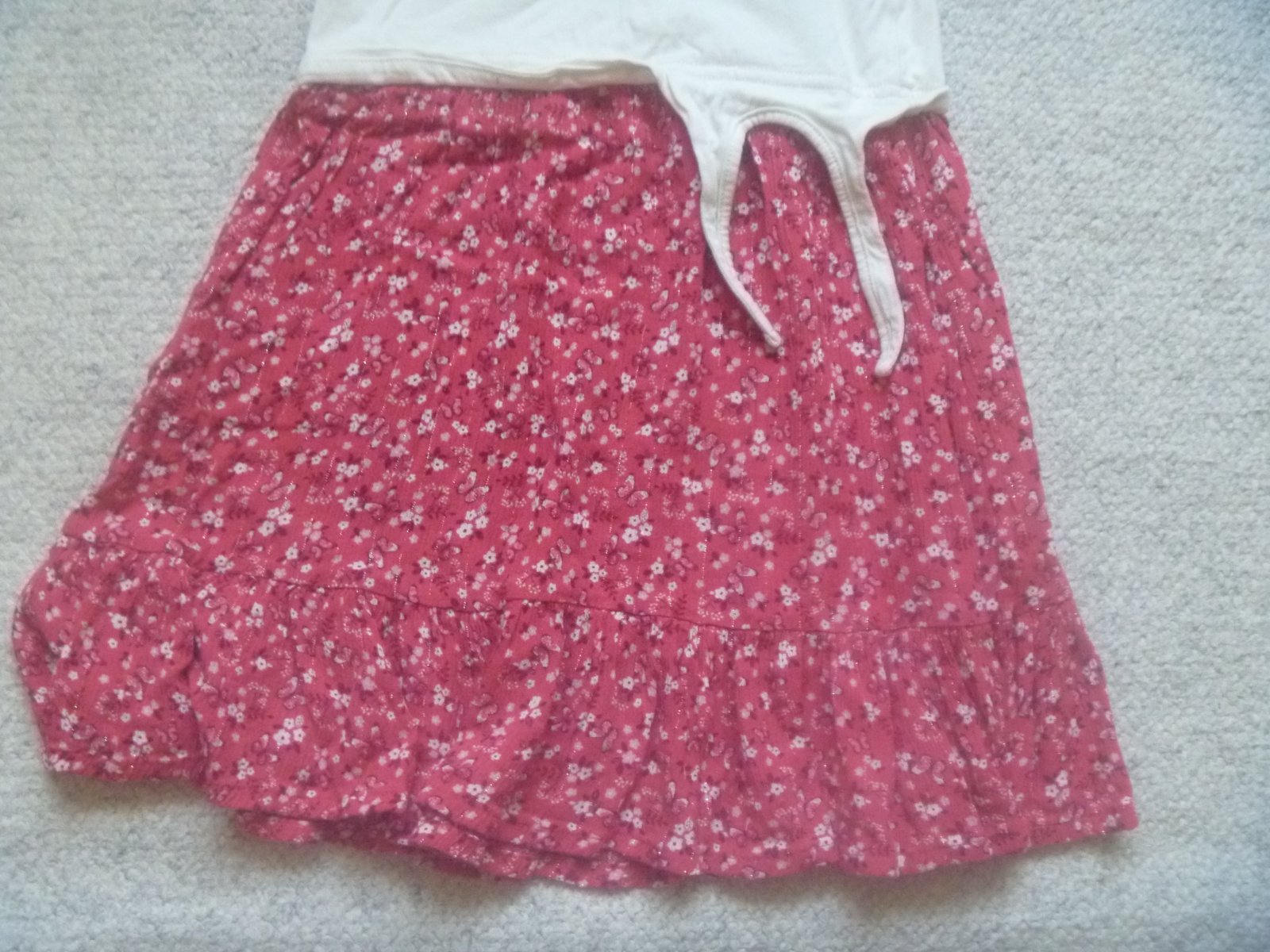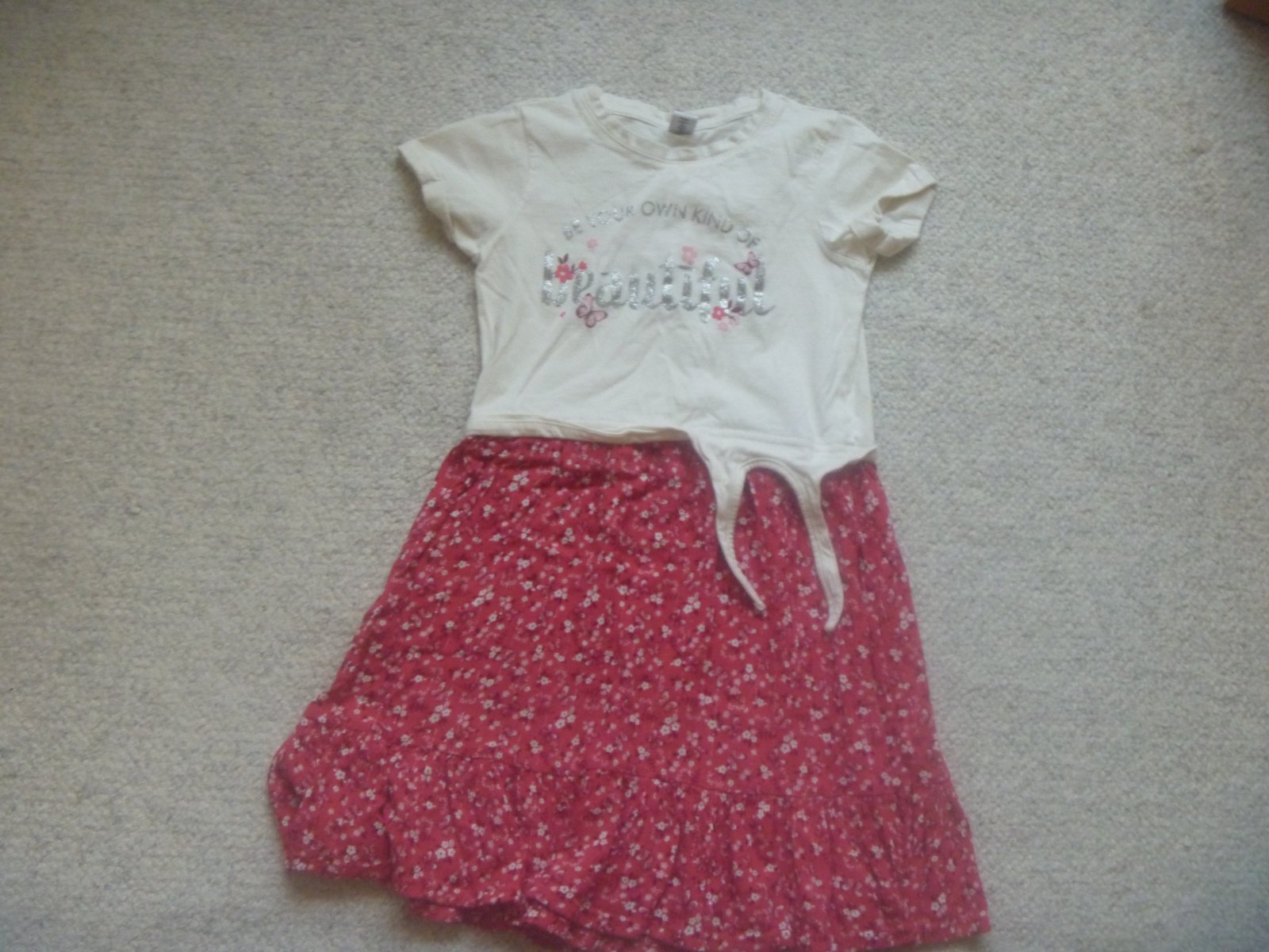 Prodám béžovočervené šaty s krátkým rukávem, béžový živůtek s nápisem, sukýnka červená s drobnými kvítečky, značka Takko, velikost 134, dobrý stav.