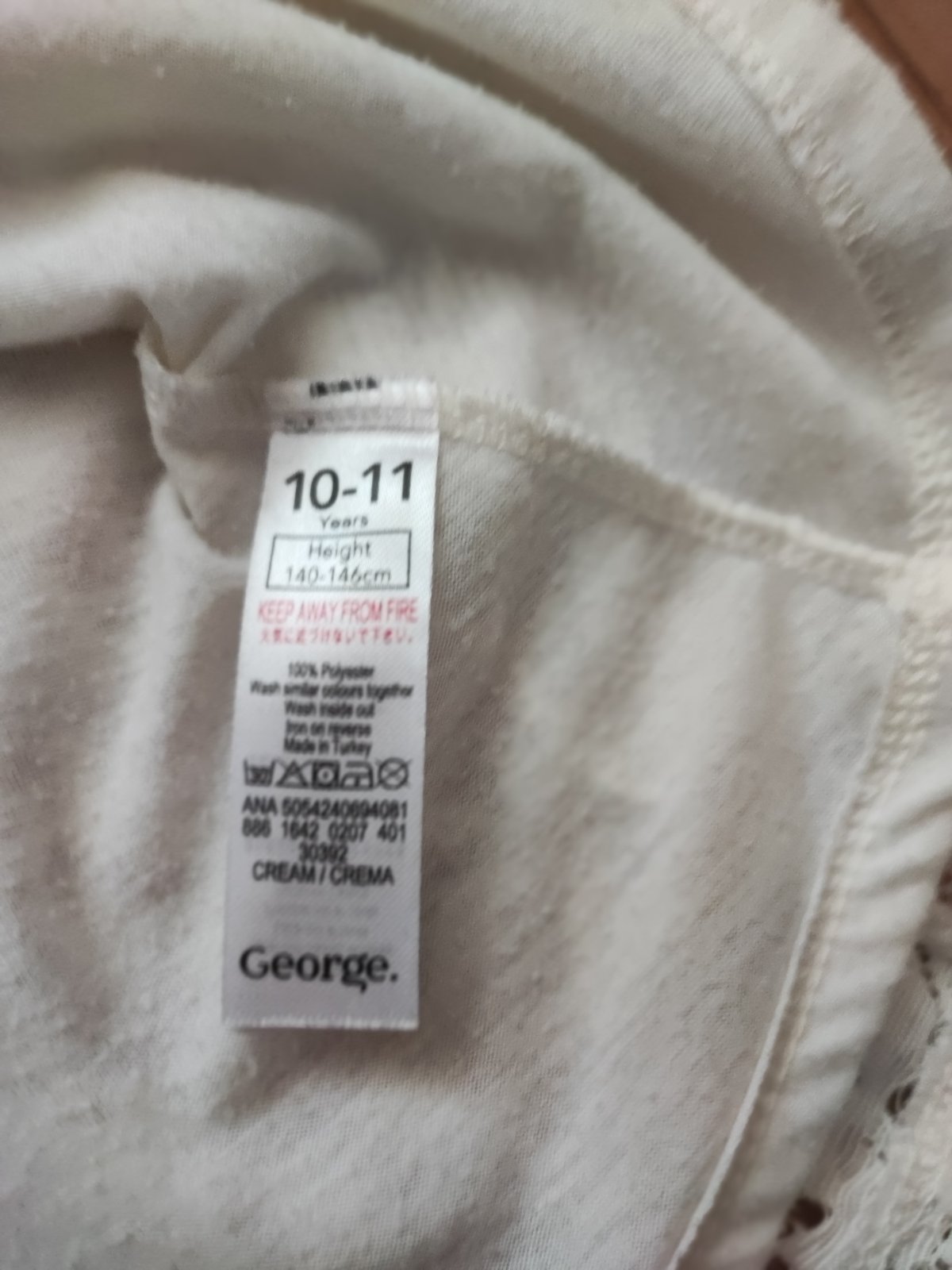 Bílé šaty s tříčtvrtečním rukávem, na spodničce krajková vrstva. Zn. George, velikost 140/146 (10-11 let). Rozměry: délka cca 70cm, šířka v pase cca 36cm, rukáv od výstřihu cca 41cm.