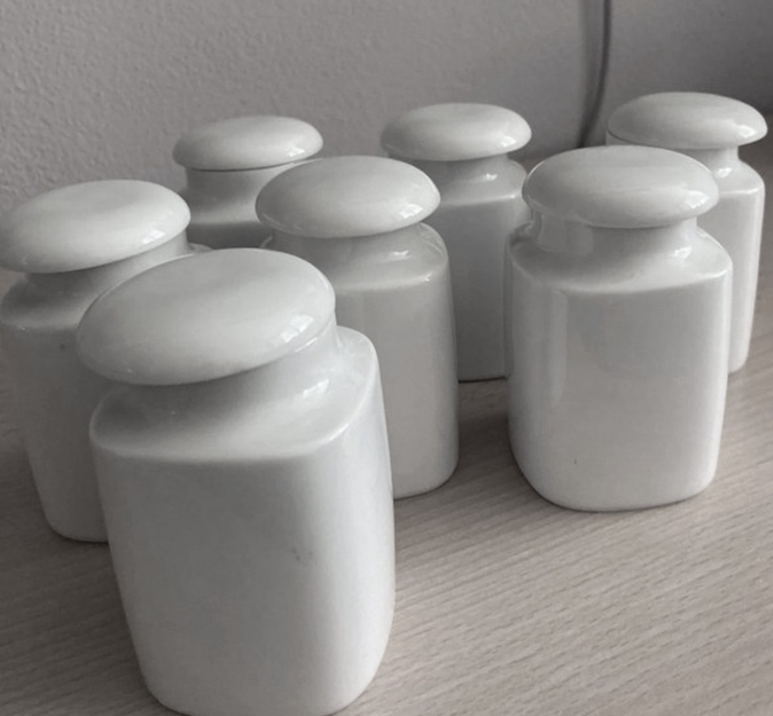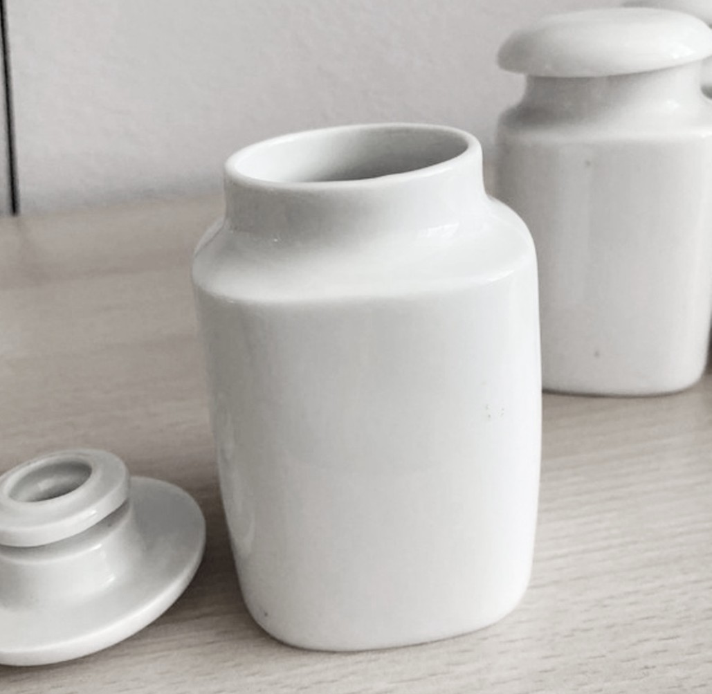 Bílé kořenky s víčky 6 ks ze silného bílého skla, jsou bez nápisů