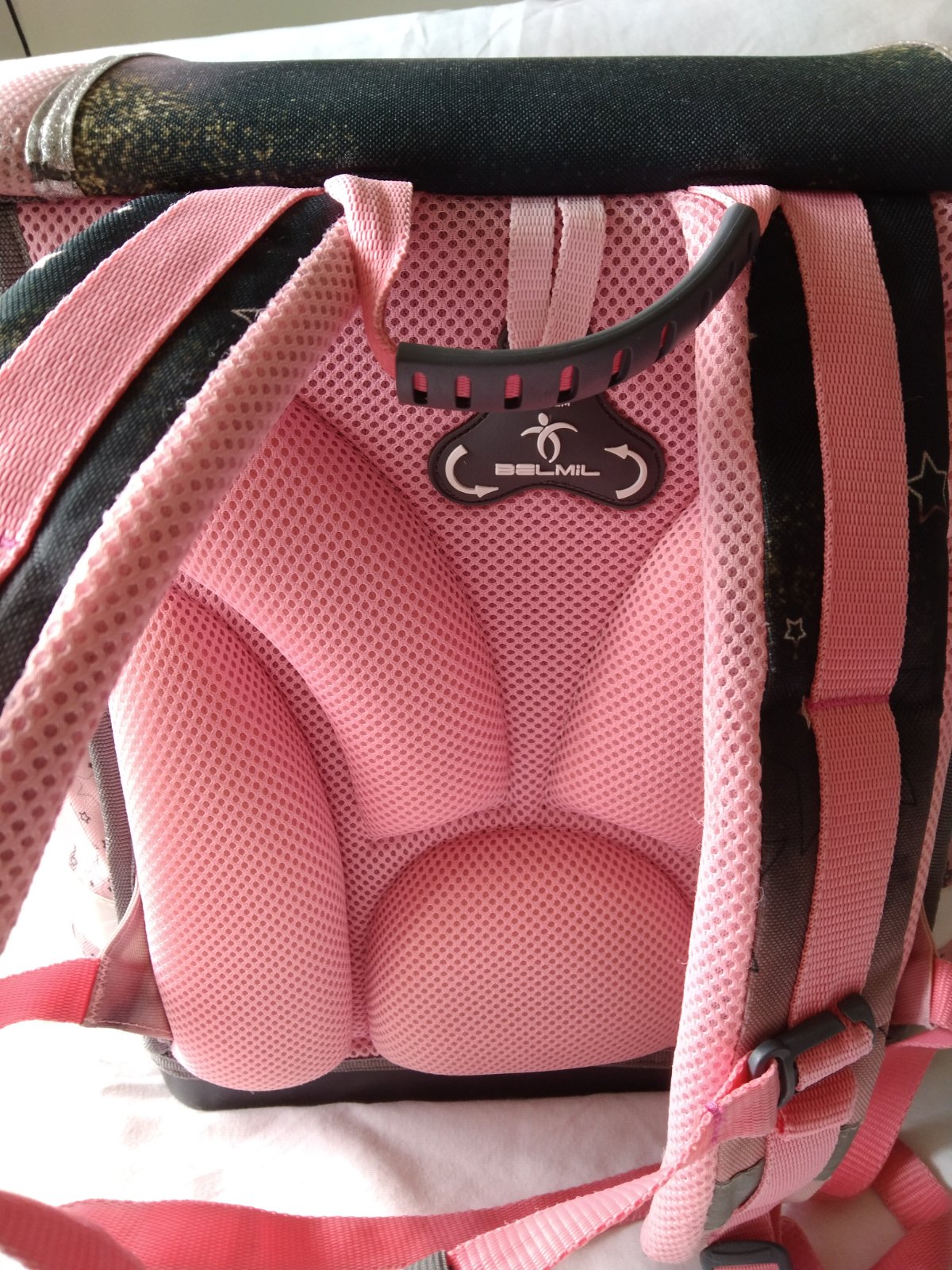 Dívčí školní aktovka Belmil, váží jen kolem 920 990 g. Je zpevněná ze všech stran a pevná spodní část také zvyšují stabilitu a životnost. Drží tvar, nepřevrací se a je voděodolná. Ergonomický tvar a prodyšná zádová část zajišťuje, že tlak na záda dětí je minimalizován. objem: 19 l, hmotnost aktovky: 920 - 990 g, rozměry: 37 x 30,5 x 19 cm. Pytlík na přezůvky. Pořizovací cena 1 790 Kč. Cena 490 Kč.