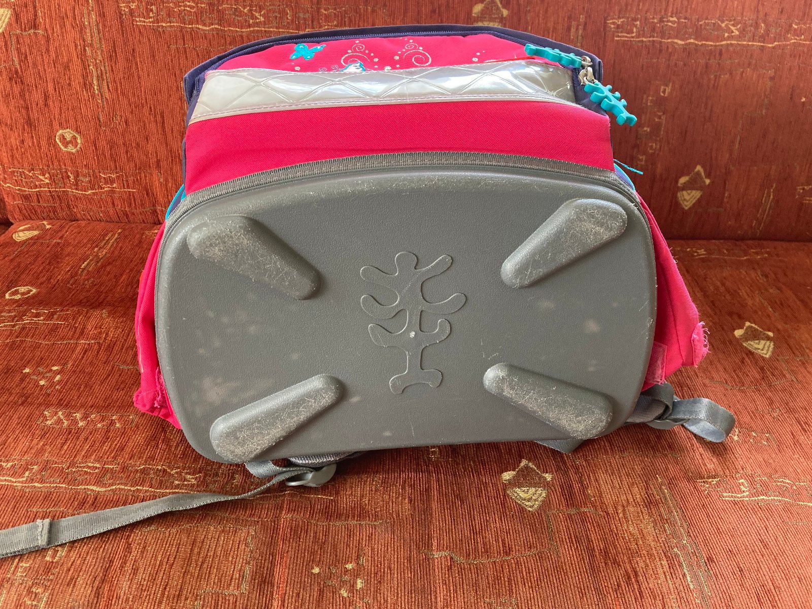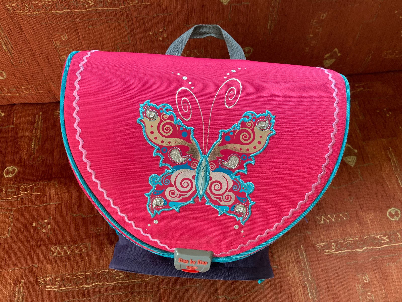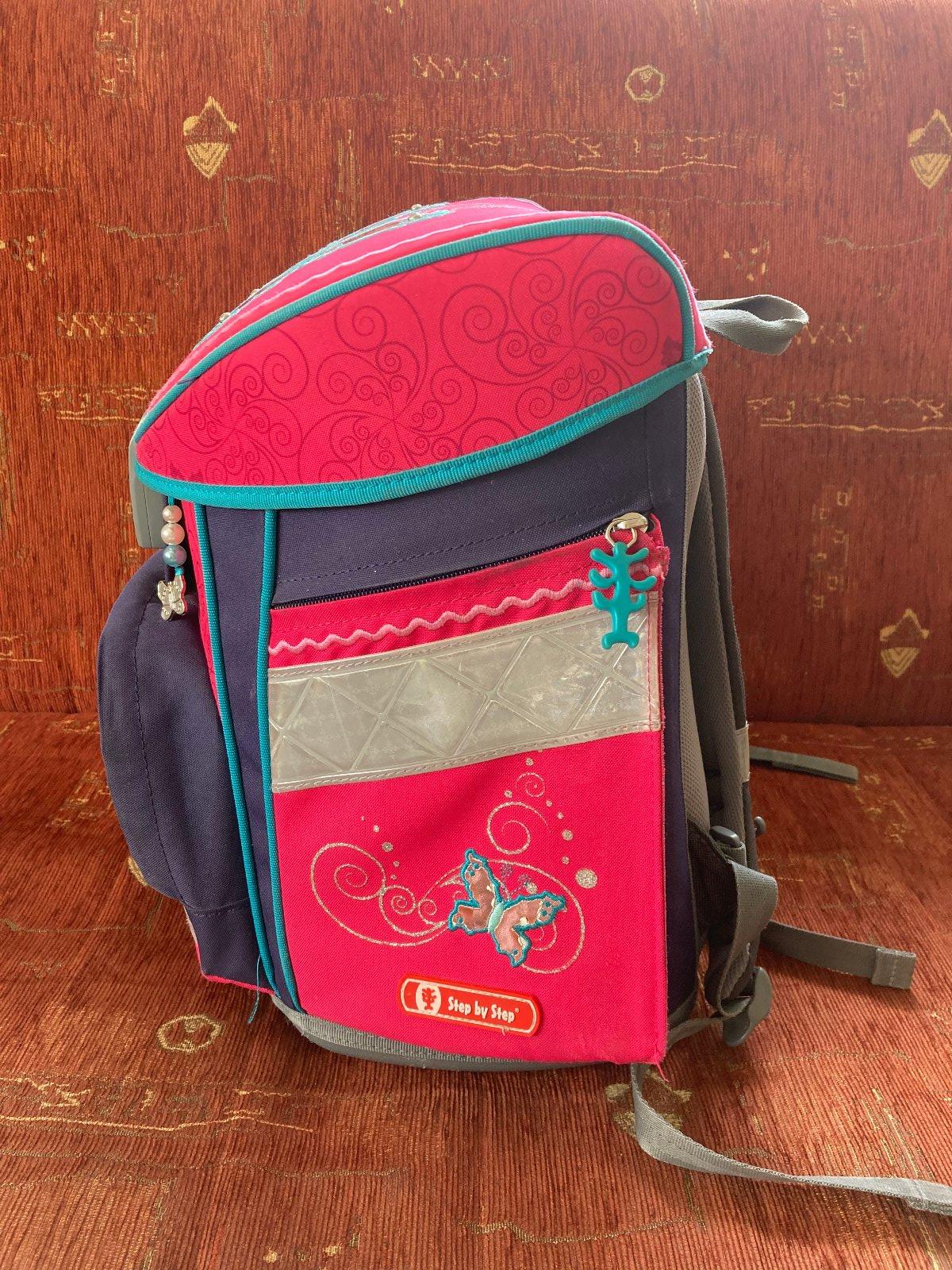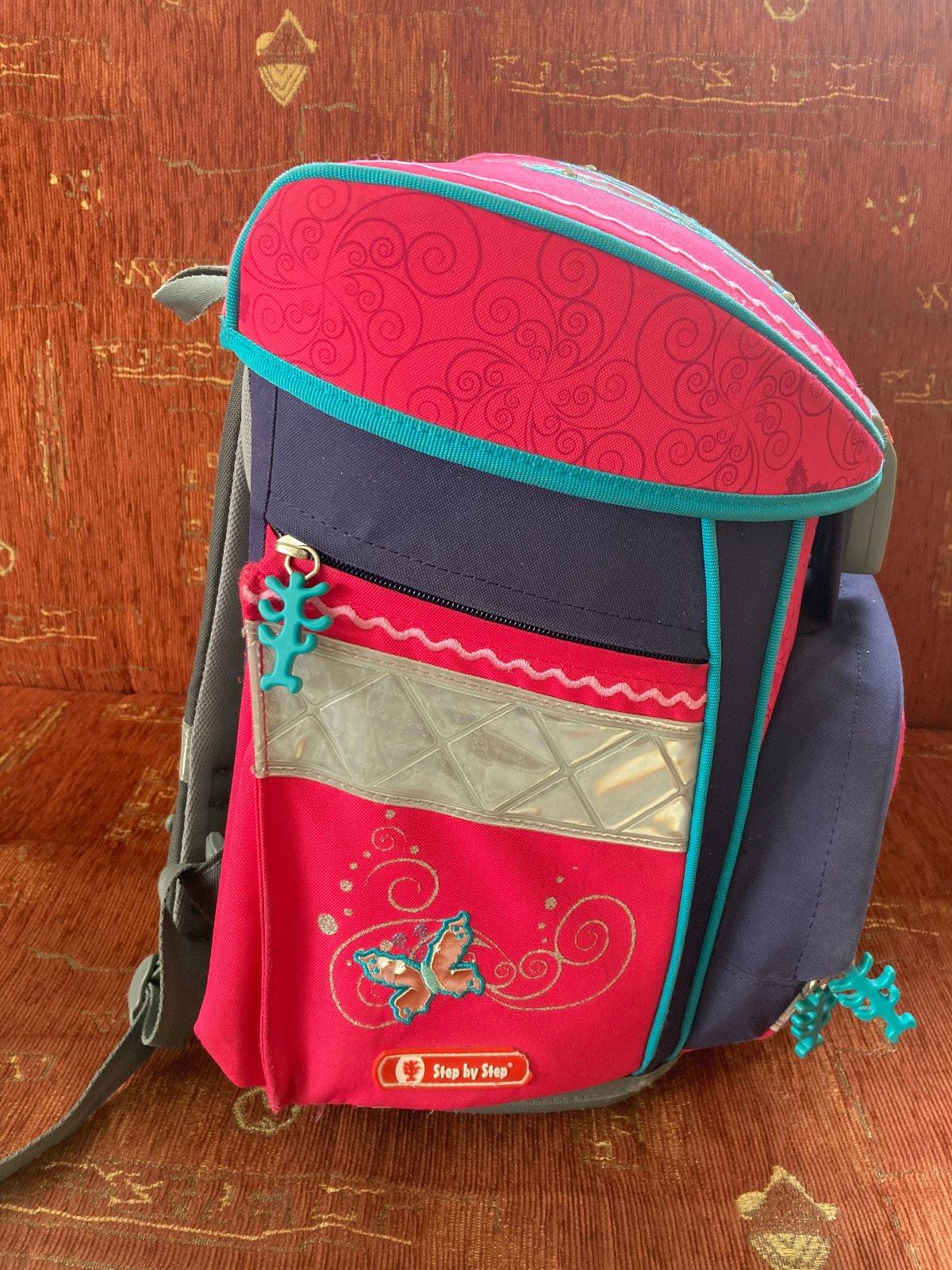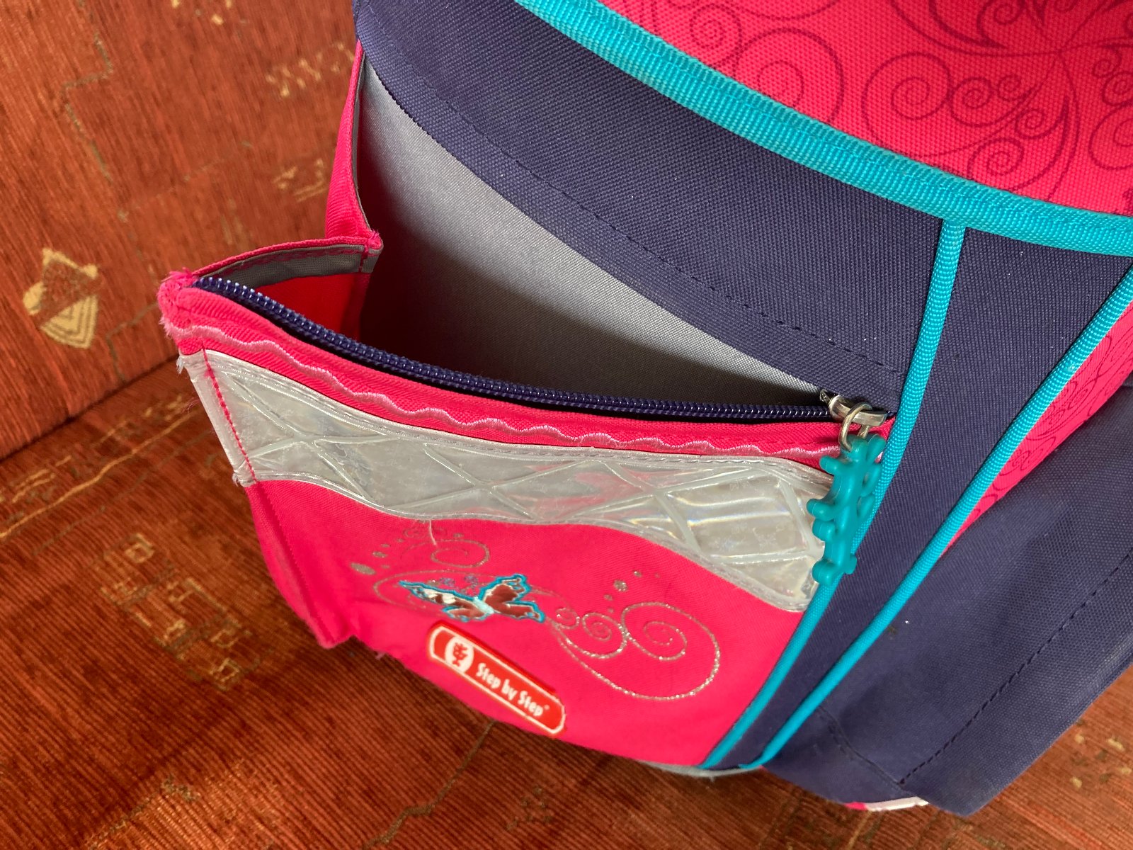 Školní aktovka pro slečnu, zn. Step by Step, růžová s motýlem, lehká a kompaktní, pevná konstrukce s polstrovanými zády, dvěma vnitřními kapsami, dvěma vnějšími kapsami a přední termo kapsou na svačinu. Reflexní prvky a hezké detaily. V pěkném stavu. Vady: vnitřní menší kapsa má dvě drobné dírky, reflexní páska na jednom popruhu je trochu vydřená, celkově mírné opotřebení zespodu a sem tam neznatelný flíček, co nešel vyzmizíkovat :), ale jinak udělá ještě parádu. Rozměry: šířka 31cm, výška 35cm, hloubka 25cm. Předání osobně Praha 6-Bořislavka, po dohodě lze i Zásilkovnou/Balíkovnou.